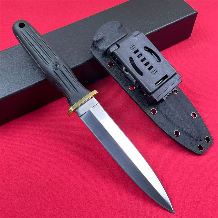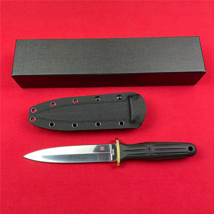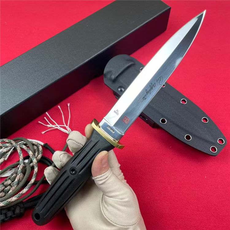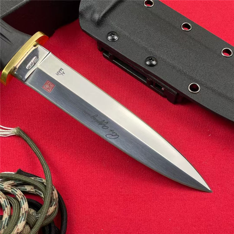 马国森双峰限量版直刀 全长:28cm 刃长:14.5cm 刃厚:3mm 刃材:440 硬度:58HRC 重量:190g/304G(K梢) 总重:423g 表面:镜光 柄材:高级工程ABS 硬度:58-60HRC 包装:礼盒