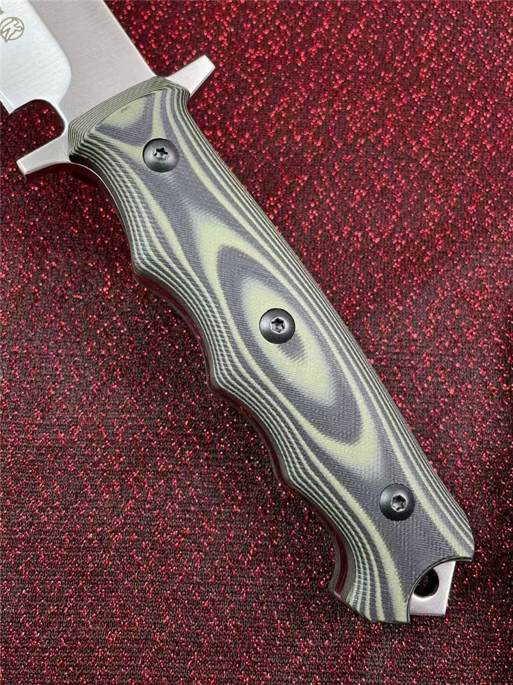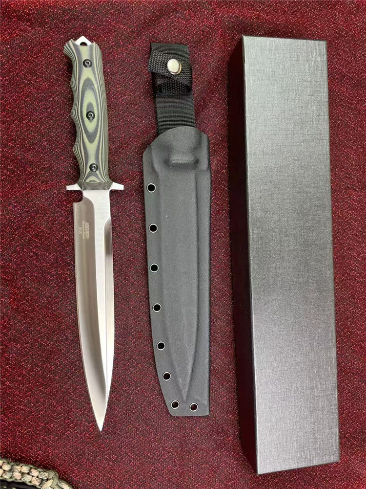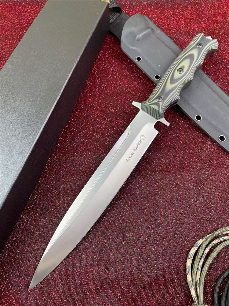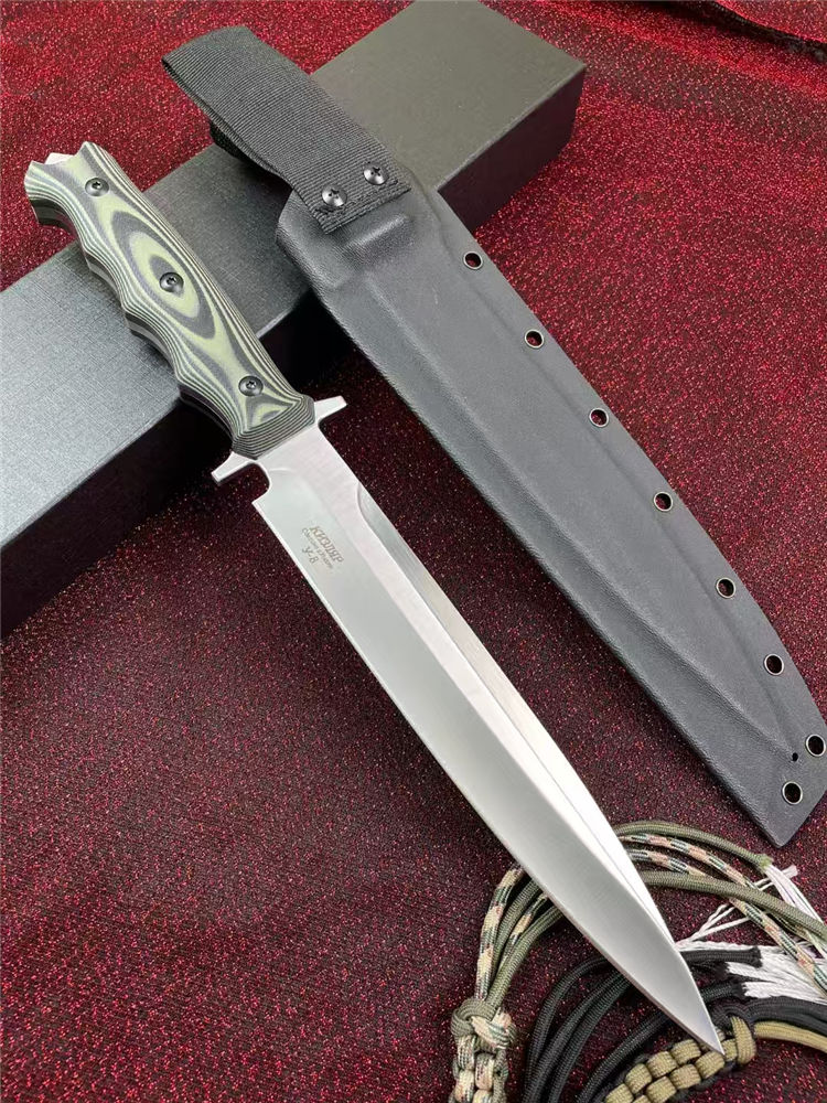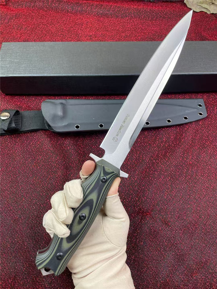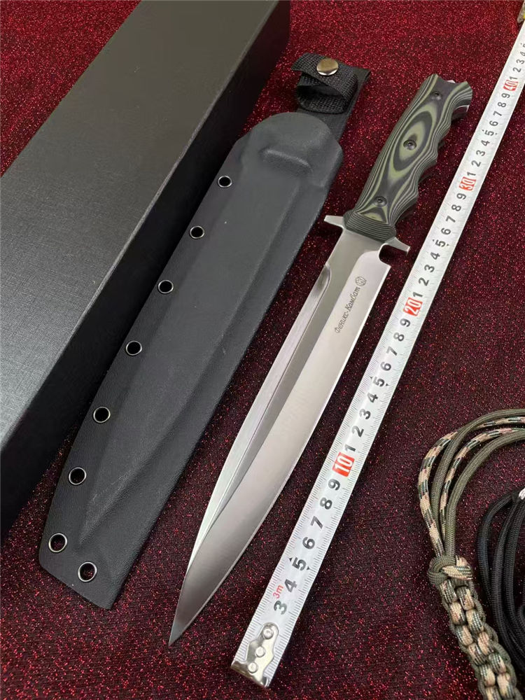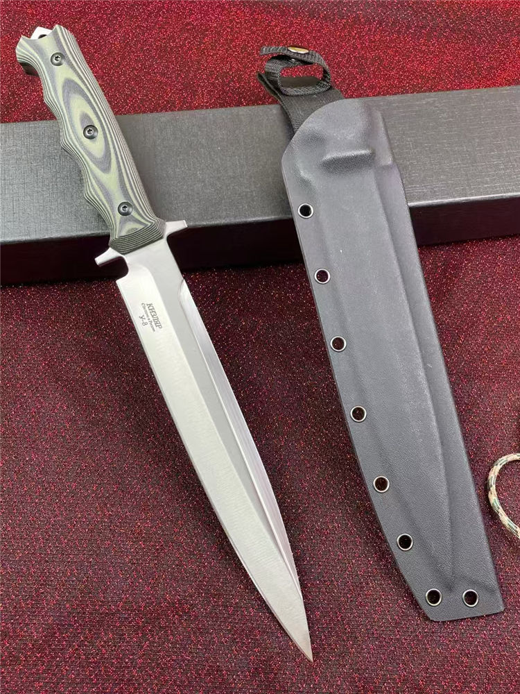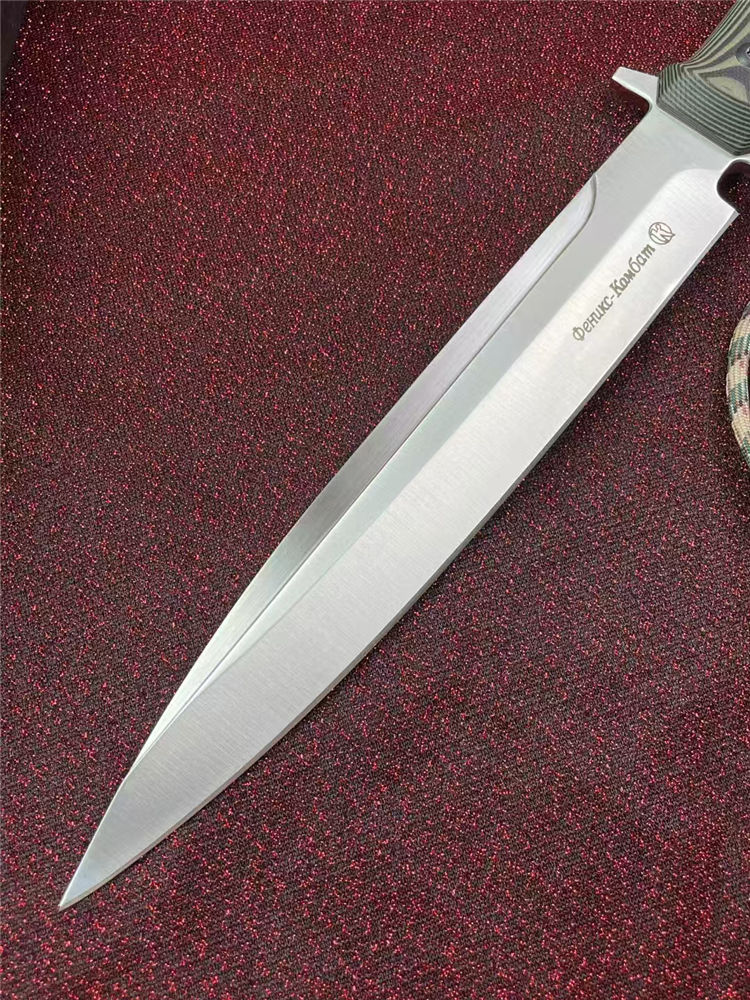 俄罗斯加长版凤凰Y8直刀 全长:37.2cm 刃长:22.5cm 柄长:14.2cm 厚度:5.5mm 刃宽:3.5CM 刃材:A8钢 硬度:59(真空热处理)真空处理韧性非常好,多次回火 柄材:双色G10 刀鞘:Kydex鞘 重量:467g(含鞘564g) 包装重量:748g