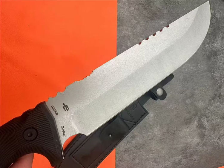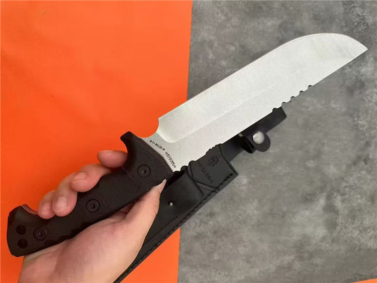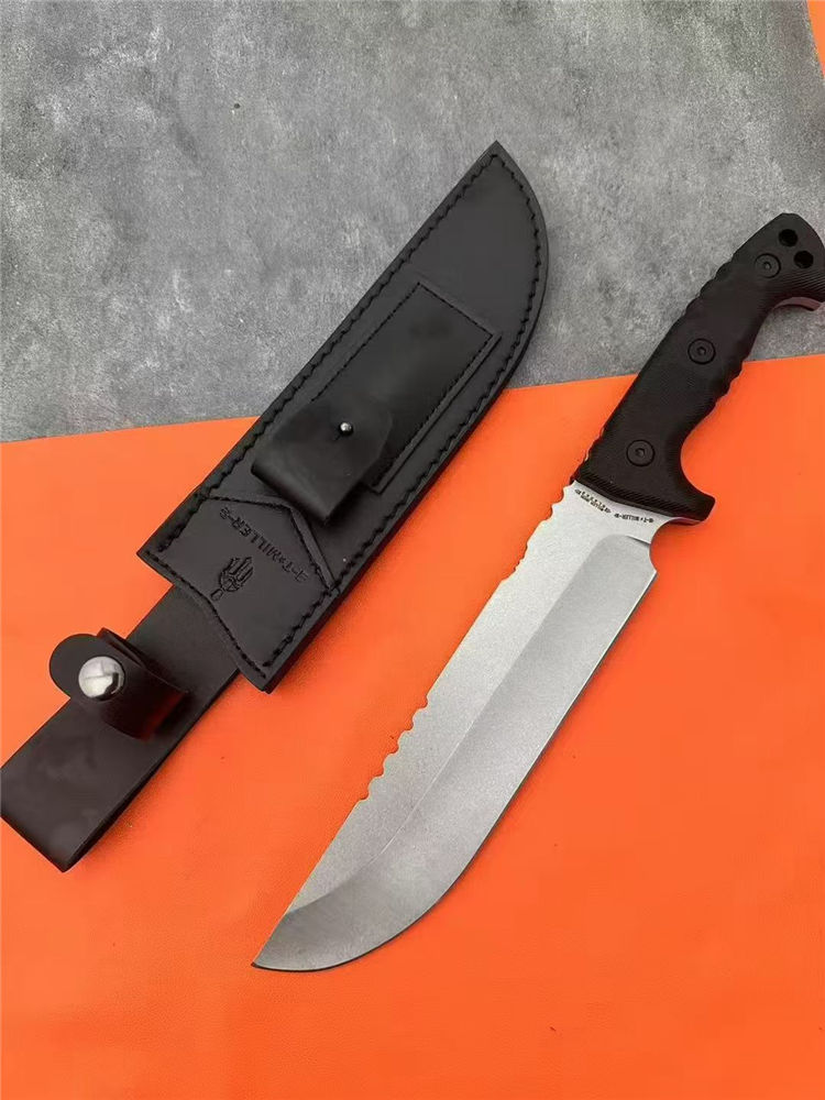 加长版米勒兄弟M33直刀 全长:36.5cm 刃长:21.5cm 刃厚:0.55cm 刃宽:4.6cm 刀重:500g(单刀) 柄材:尼龙加纤 硬度:59-60HRC 表面:石洗