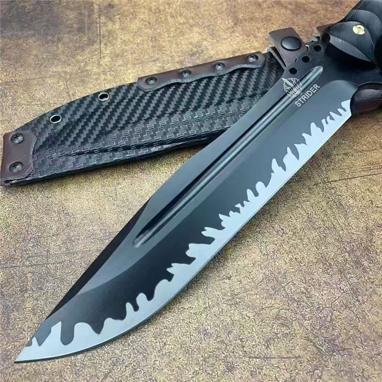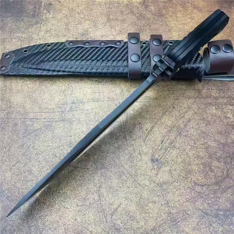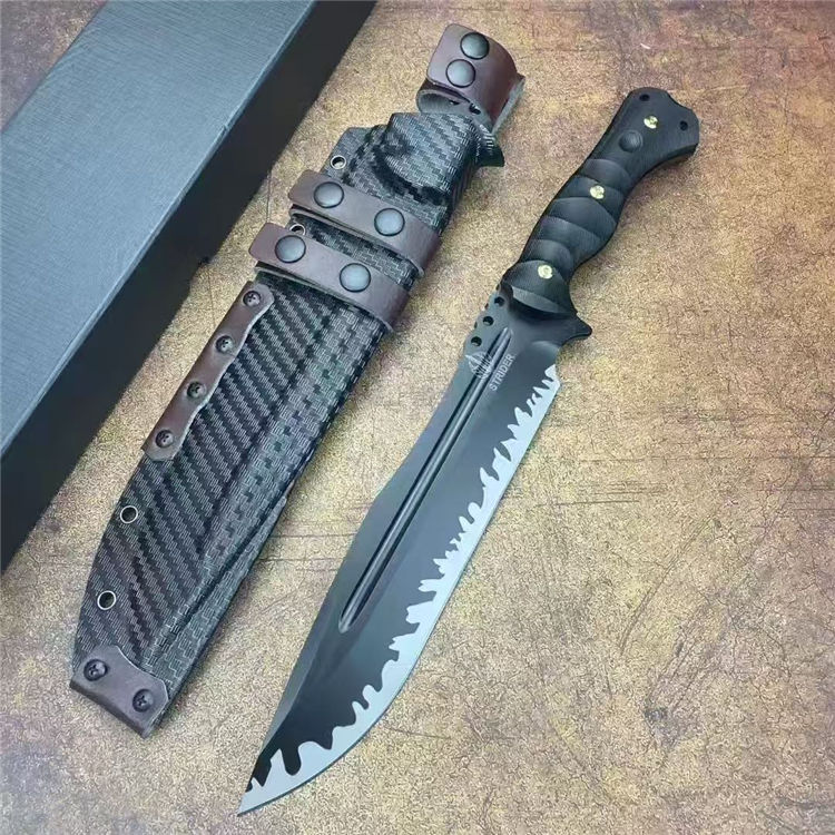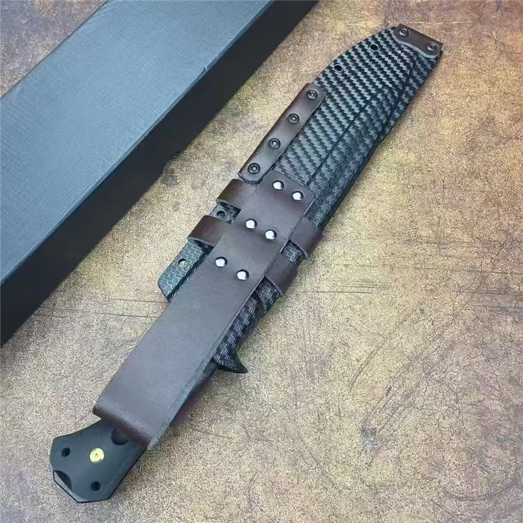 挺进者斯特里德直刀 全长:410mm 刃长:255mm 柄长:155mm 刃宽:5.0mm 刃厚:7mm 刃材:9CR13Mov 柄材:G10 硬度:60-62HRC 结构:一体龙骨 刀套:碳纤维K鞘 包装:黑色天地盒子 重量:852克 重量:1295克(含全部包装)