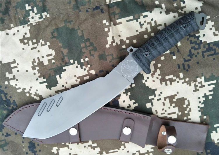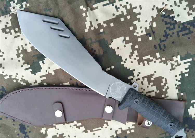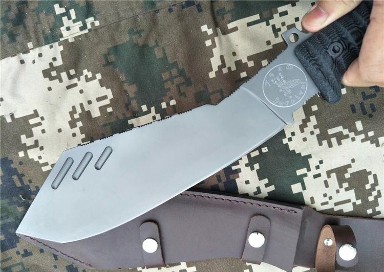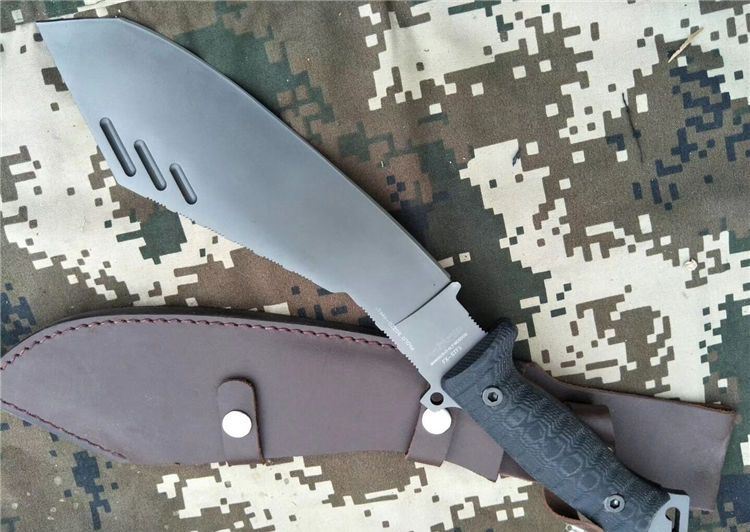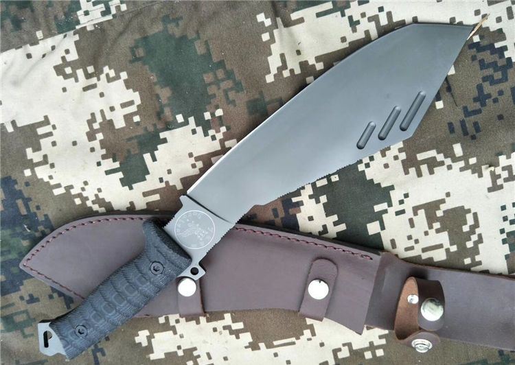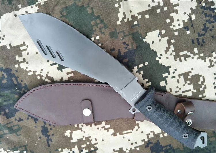 狐狸STF3大刀 全 长:40.1cm 刃 长:25.9cm 柄 长:14cm 刃 宽:7.1cm(最宽处) 刃 厚:6mm 刃 材:8CR18Mov 重 量:950克含包装 硬 度:59HRC 表 面:镀金钛 柄 材:米卡塔柄 锁 型:定锁 其 他:配纸盒牛皮套