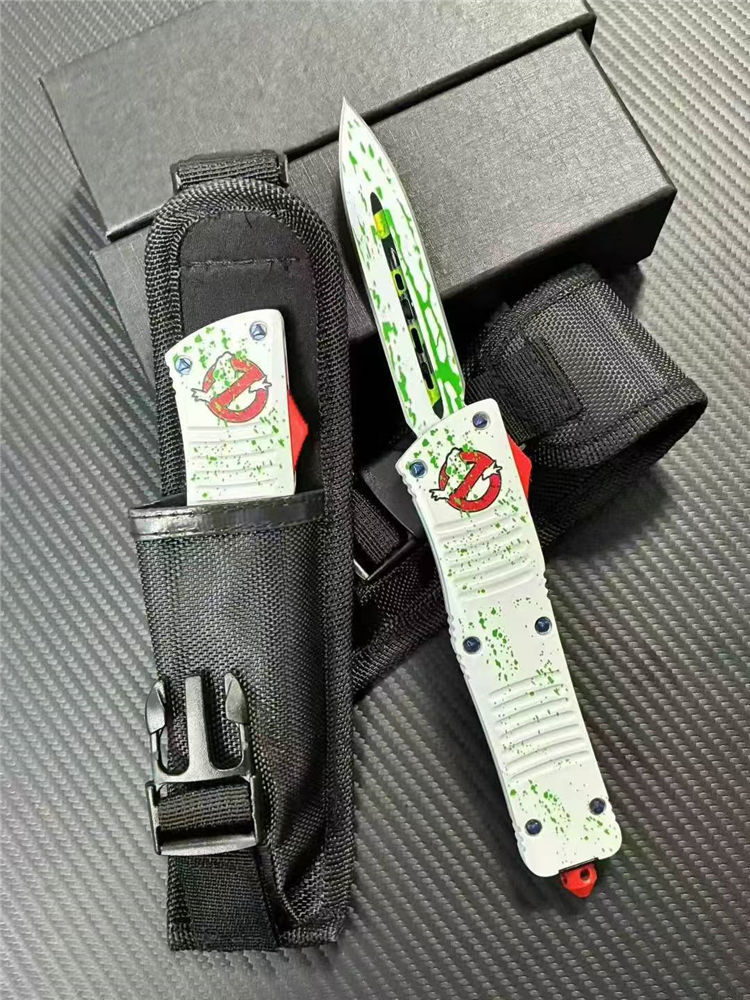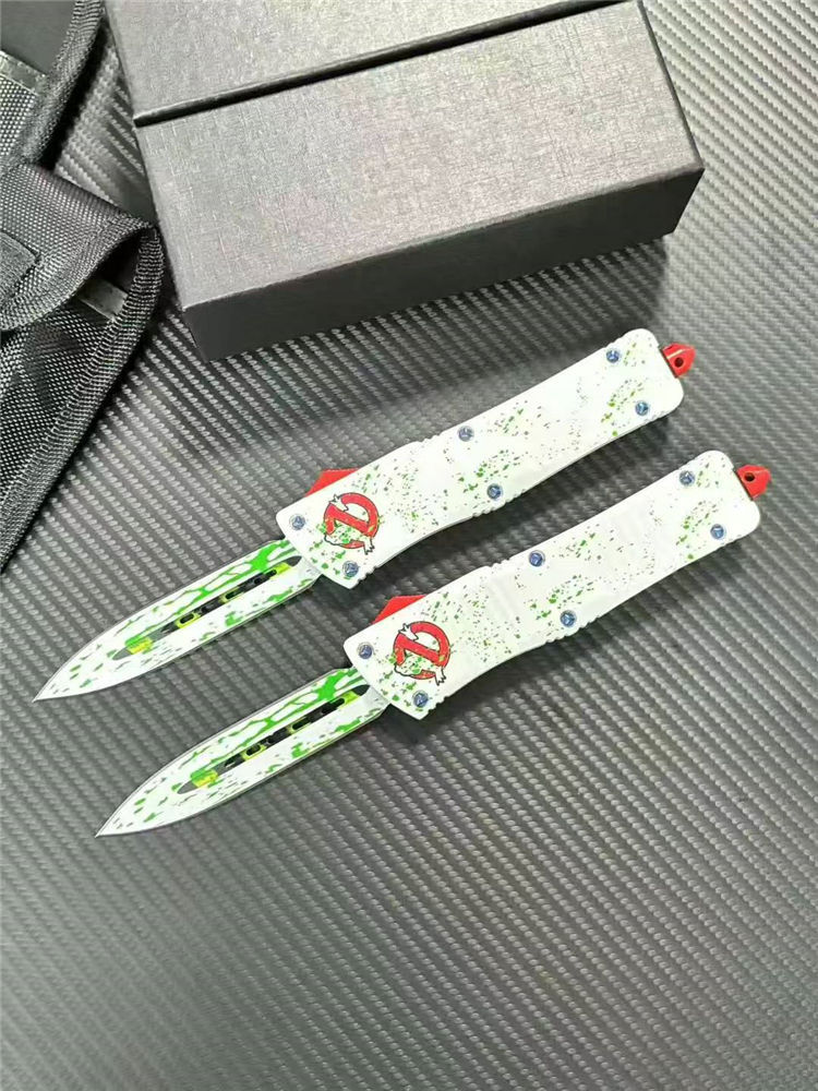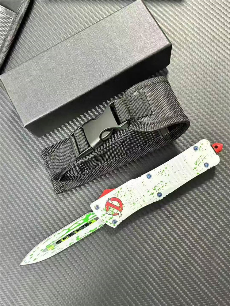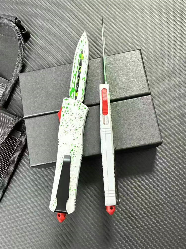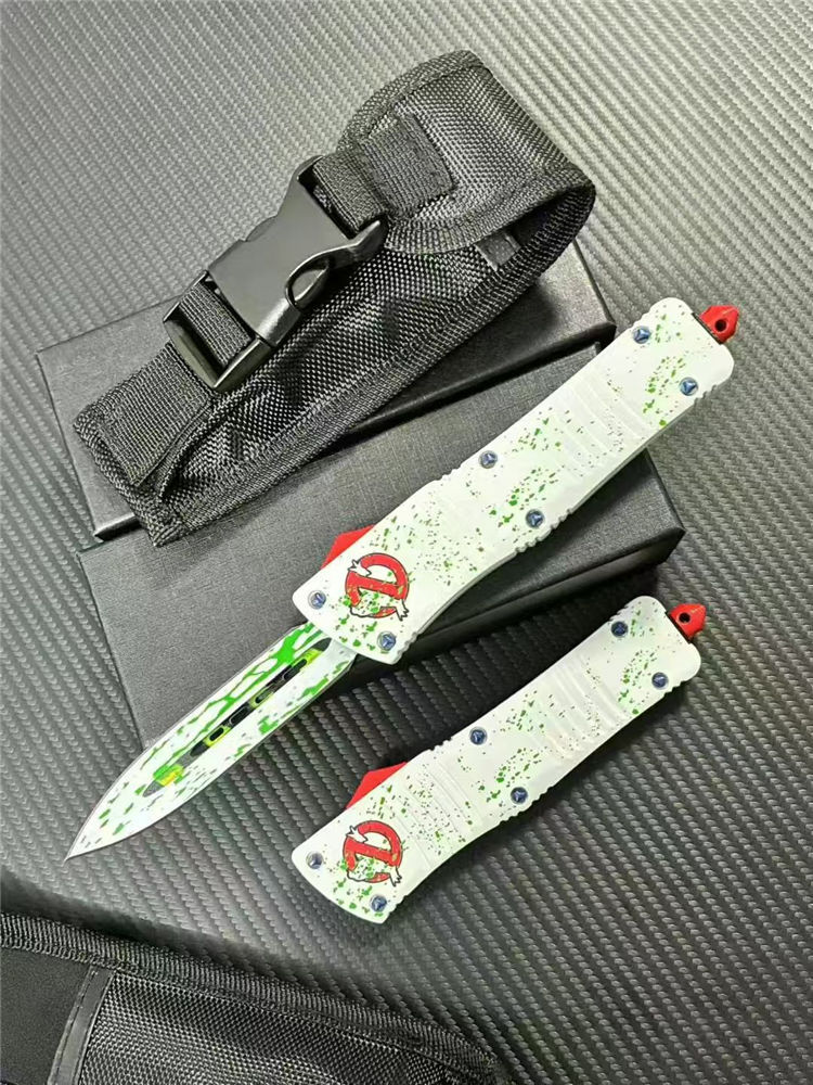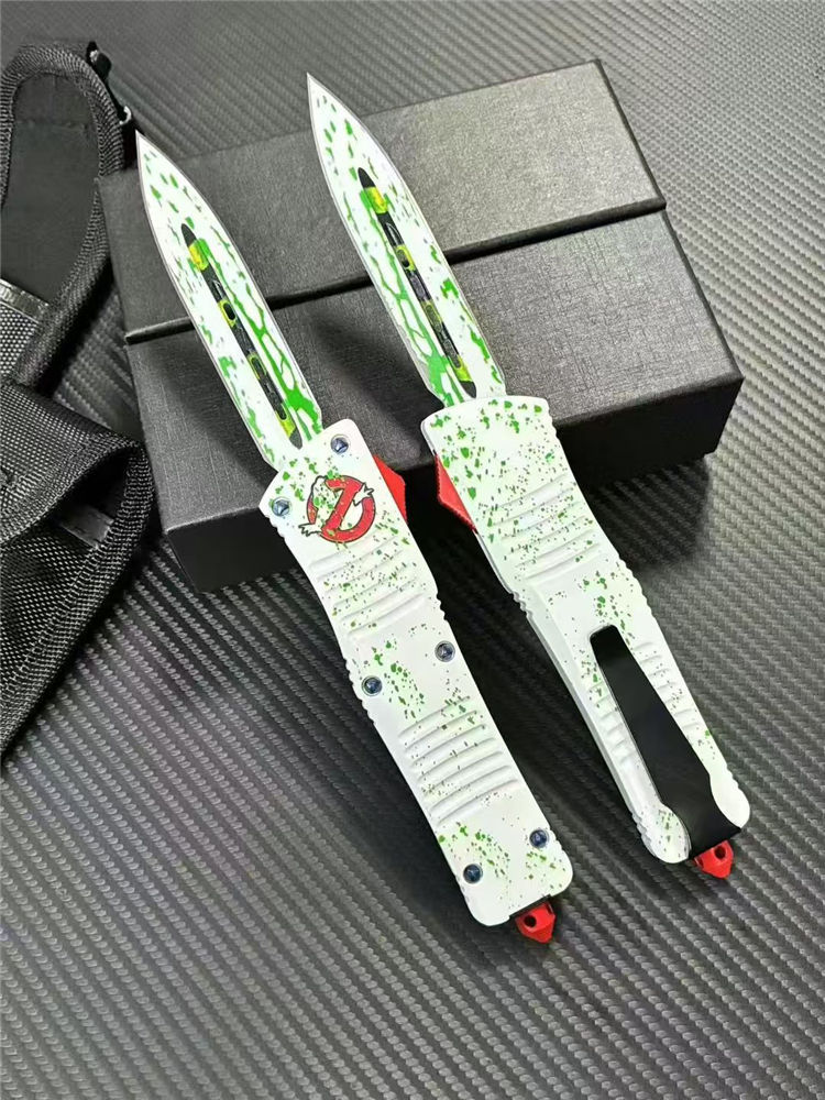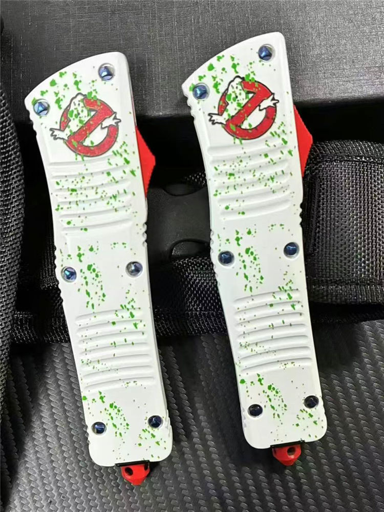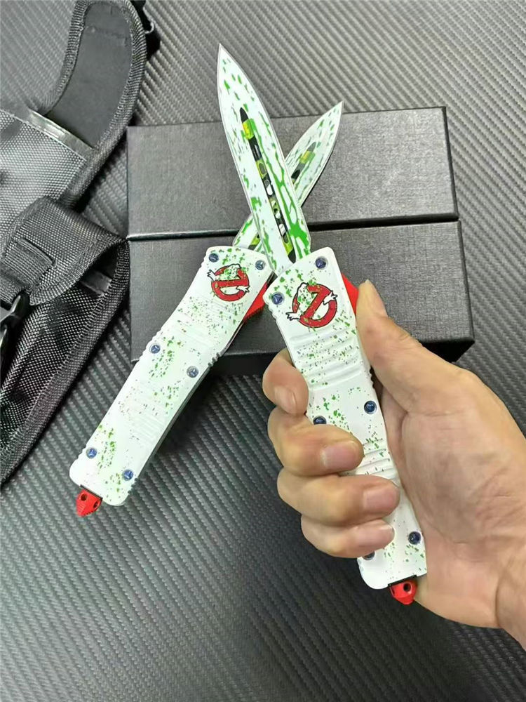 微技术战斗恐龙捉鬼敢死队直出跳刀 全长:24cm 刃长:9.6cm 柄长:14.6cm 刃材:440C 刃型:双锋刃 表面:3D喷涂柄 材料:锌合金手柄 表面:全柄白色涂层+绿色 重量:234g(单刀) 刀鞘:战术尼龙套