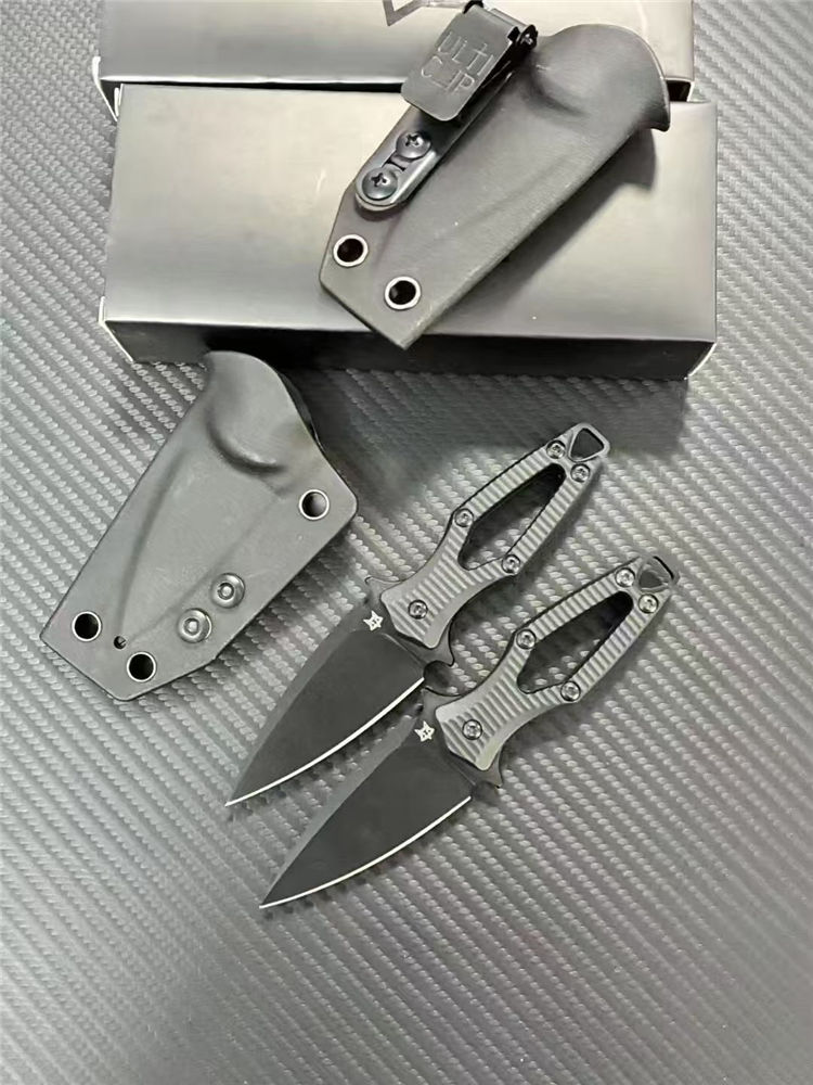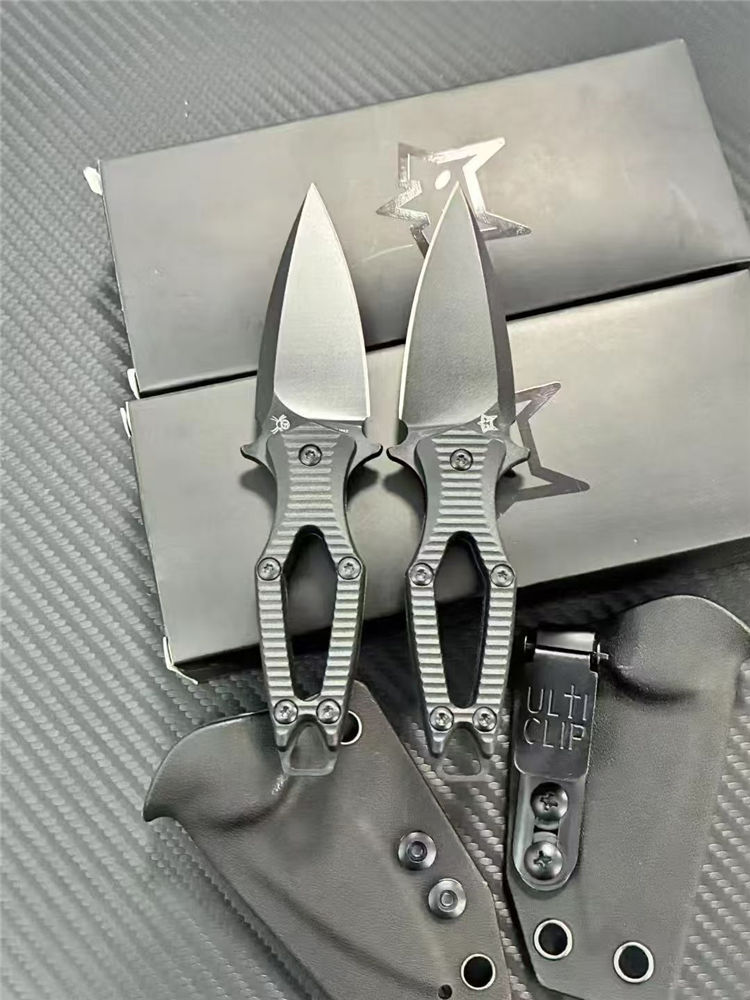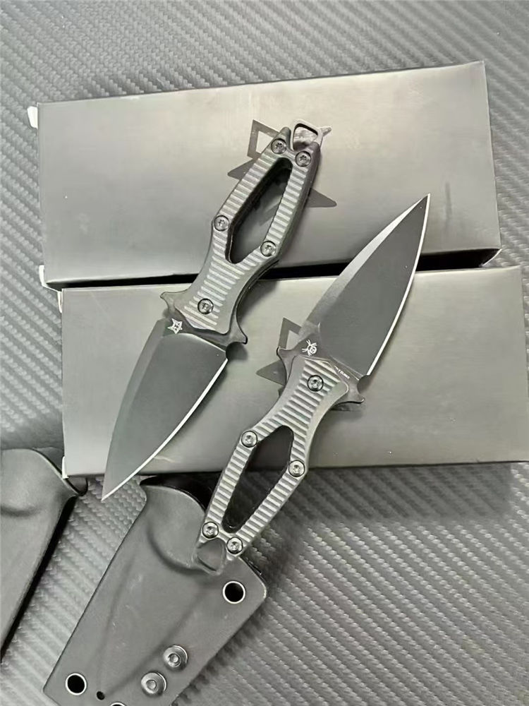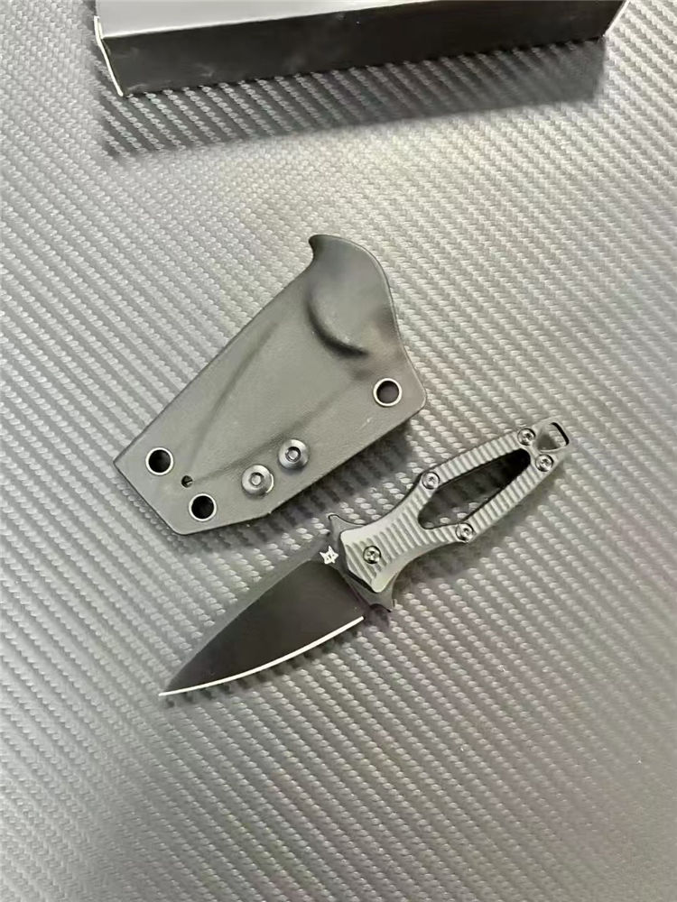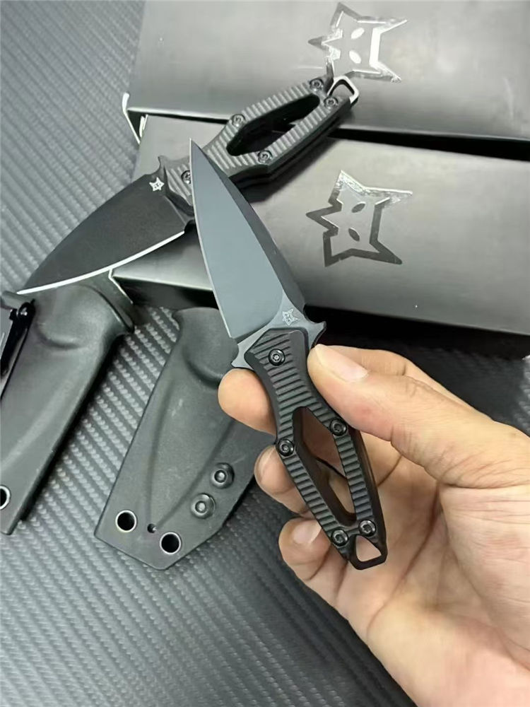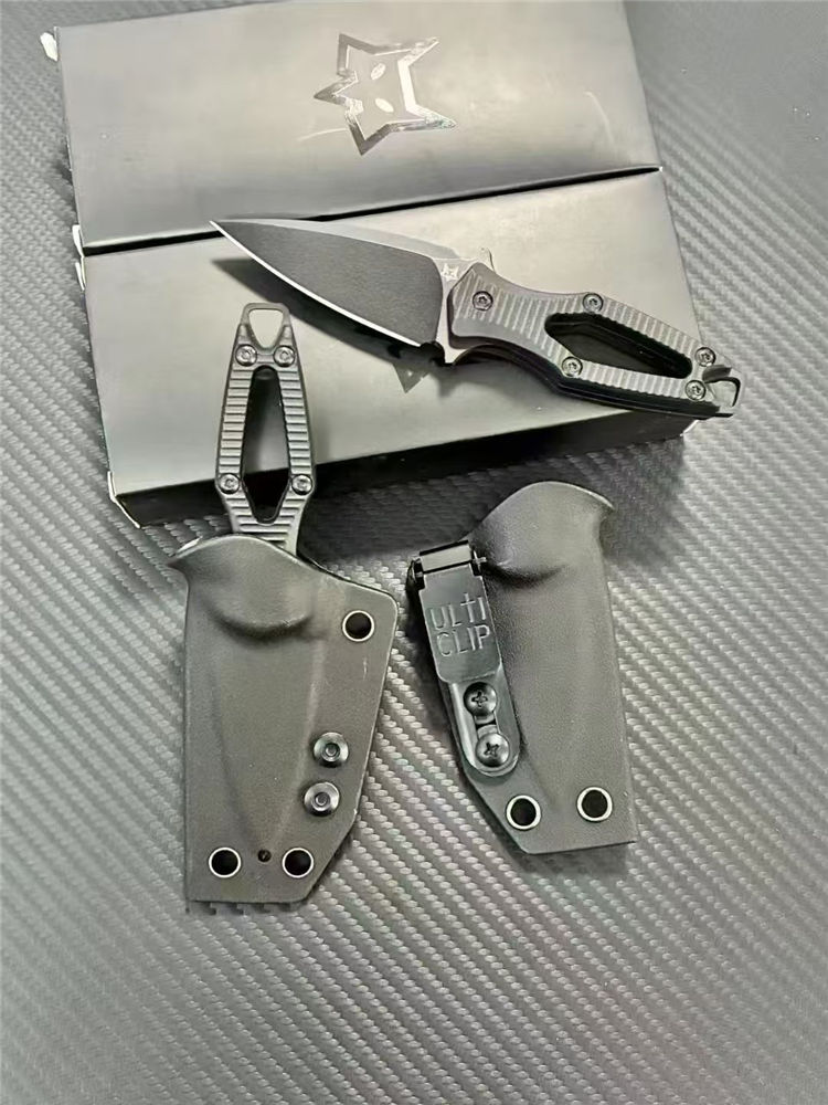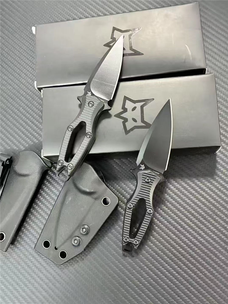 狐狸AKA迷你直刀 全长:140mm 刃长:60mm 柄长:80mm 刃宽:28mm 刃厚:3.0mm 刃材:N690 重量:53g(单刀)85g(刀+鞘) 硬度:59HRC 表面:发黑处理 柄材:ABS工程塑料 刀鞘:K鞘