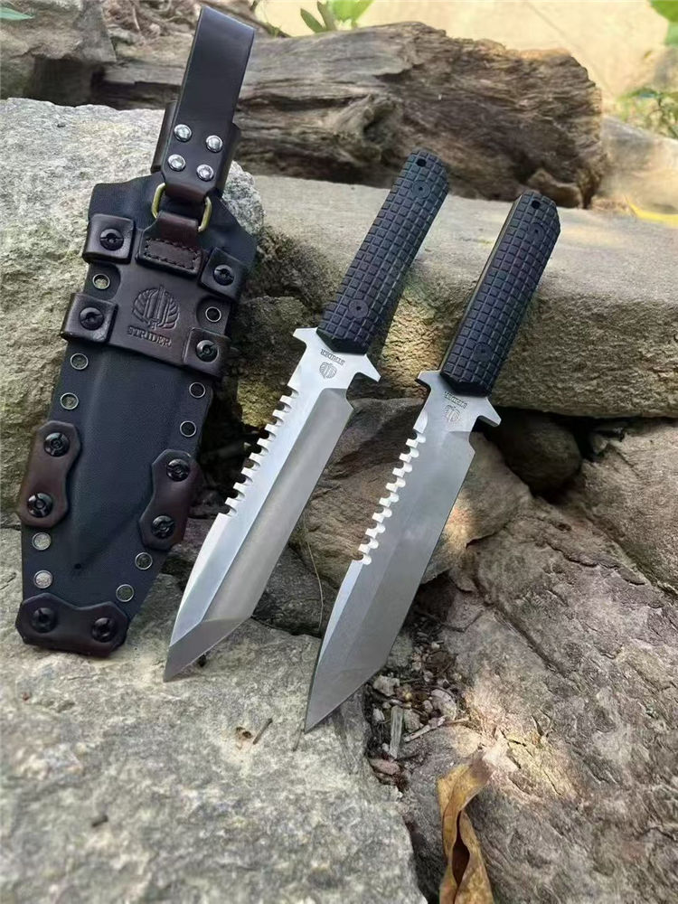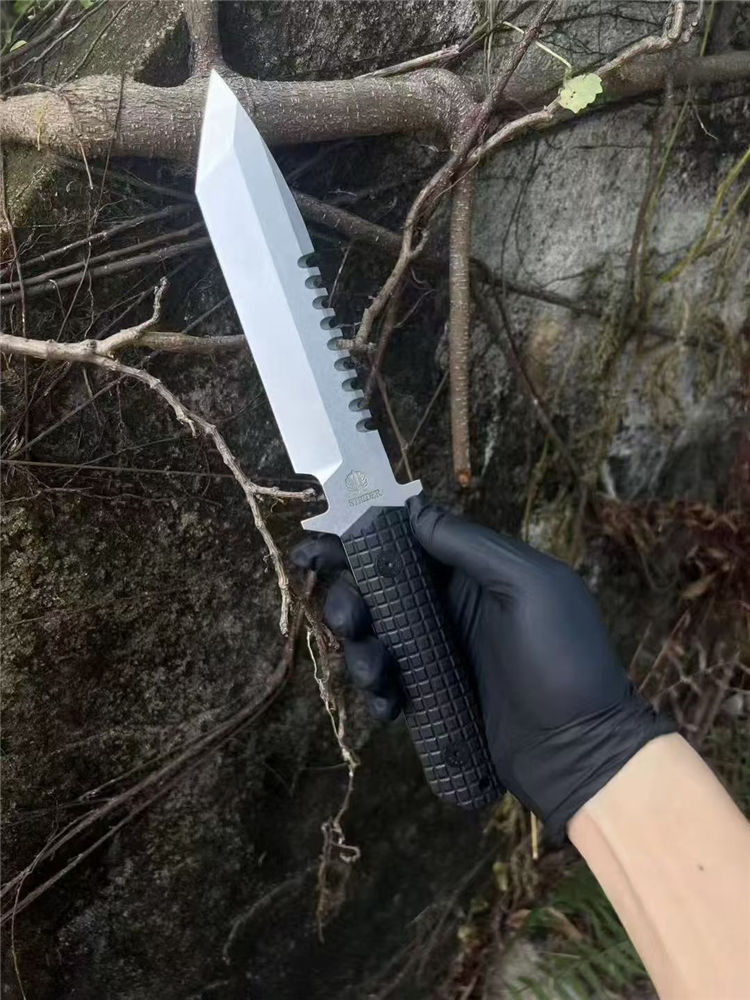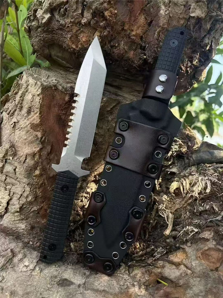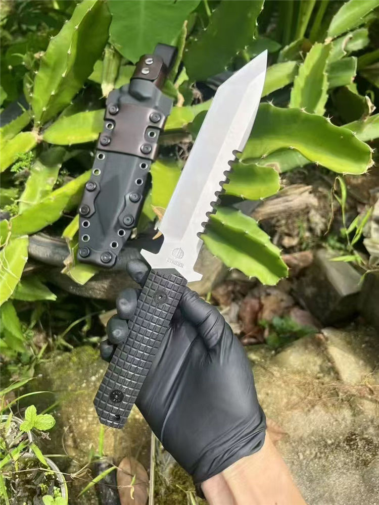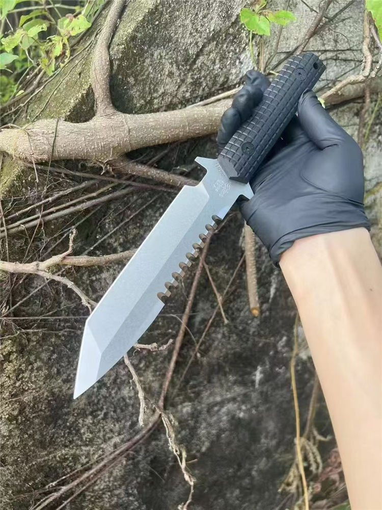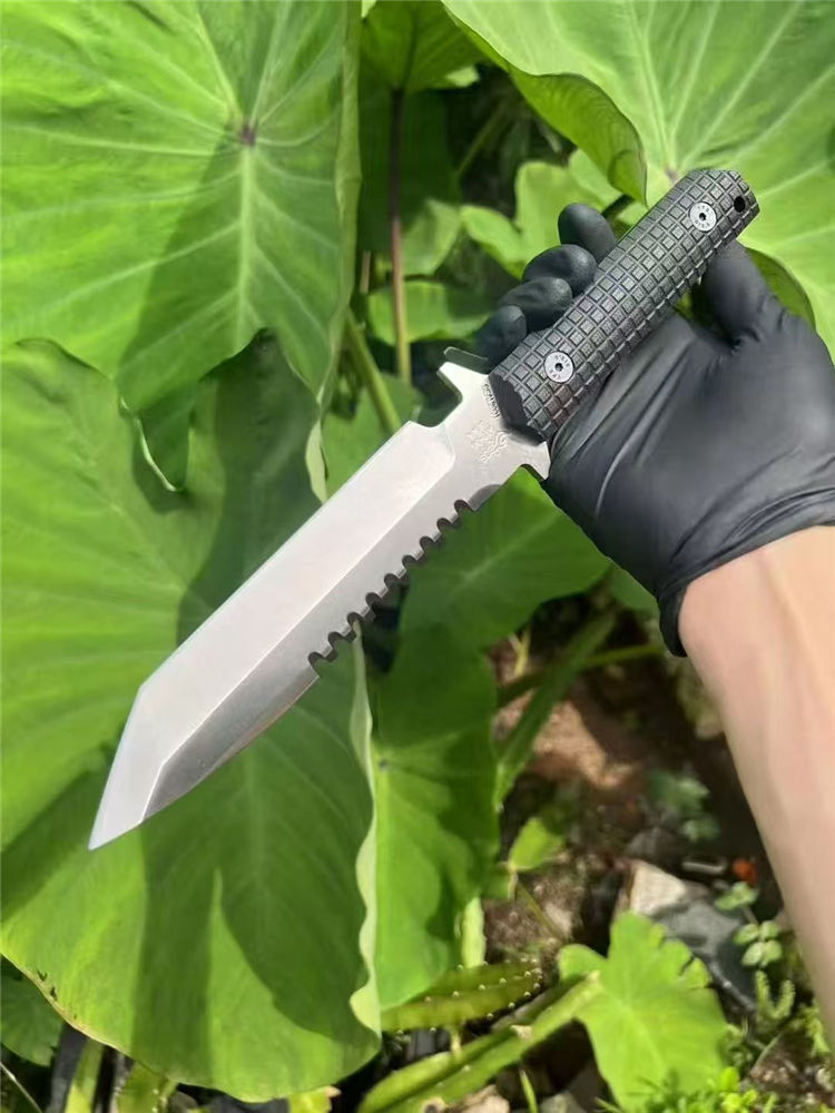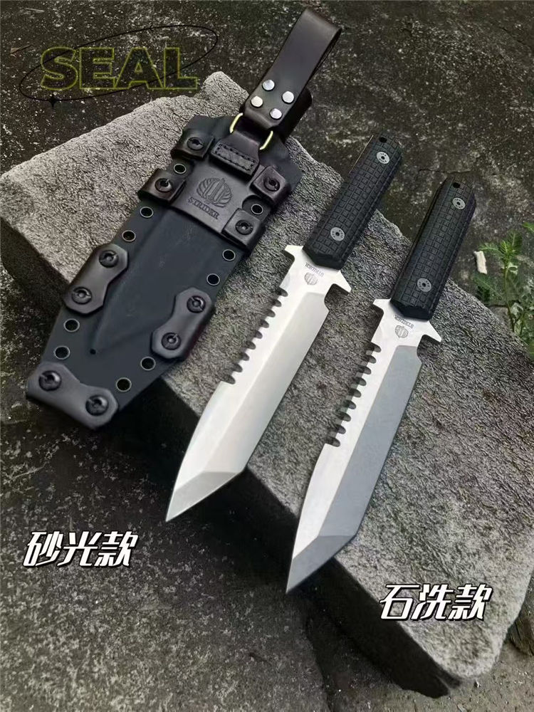 挺进者SEAL2001海豹特击队直刀 全长:29cm 刃长:15cm 刃厚:5.2mm 刃宽:3.5cm 重量:单刀334G 钢材:公司提供日立ATS-34钢 硬度:60-62HRC 热处理:BOS专业真空热处理油淬 表面:砂光效果与石洗效果 柄材:黑色复合G10经典的手雷柄格材质 K鞘:进口K版+植鞣皮做旧效果