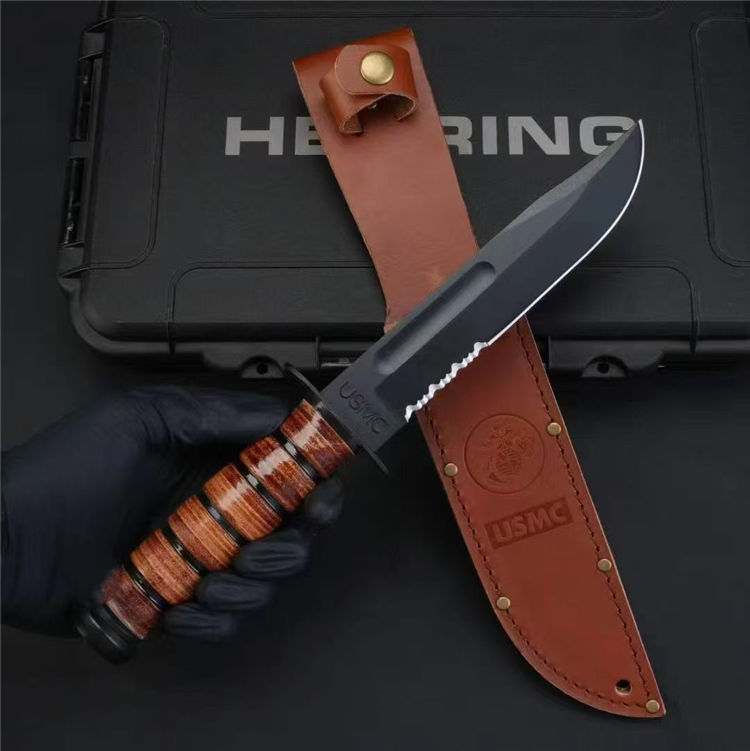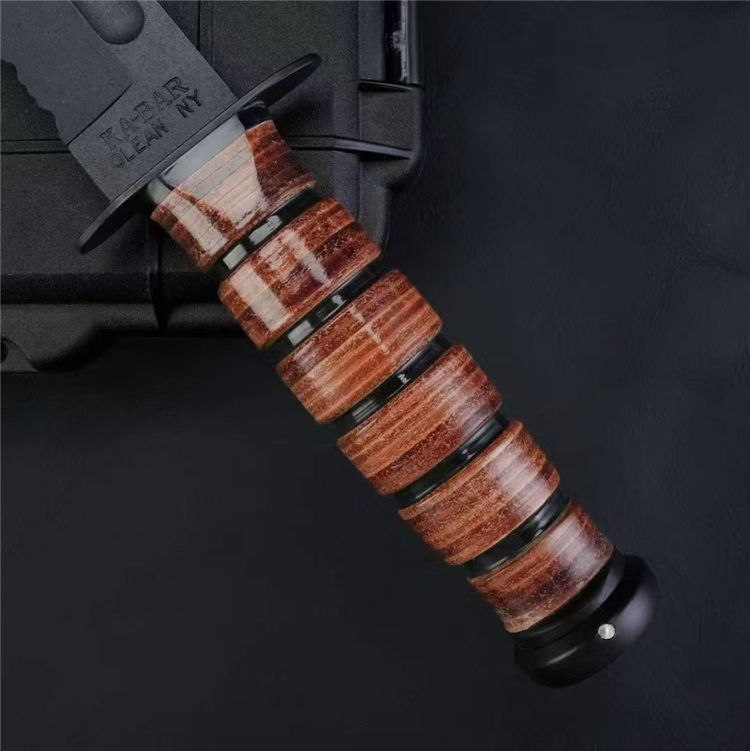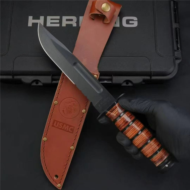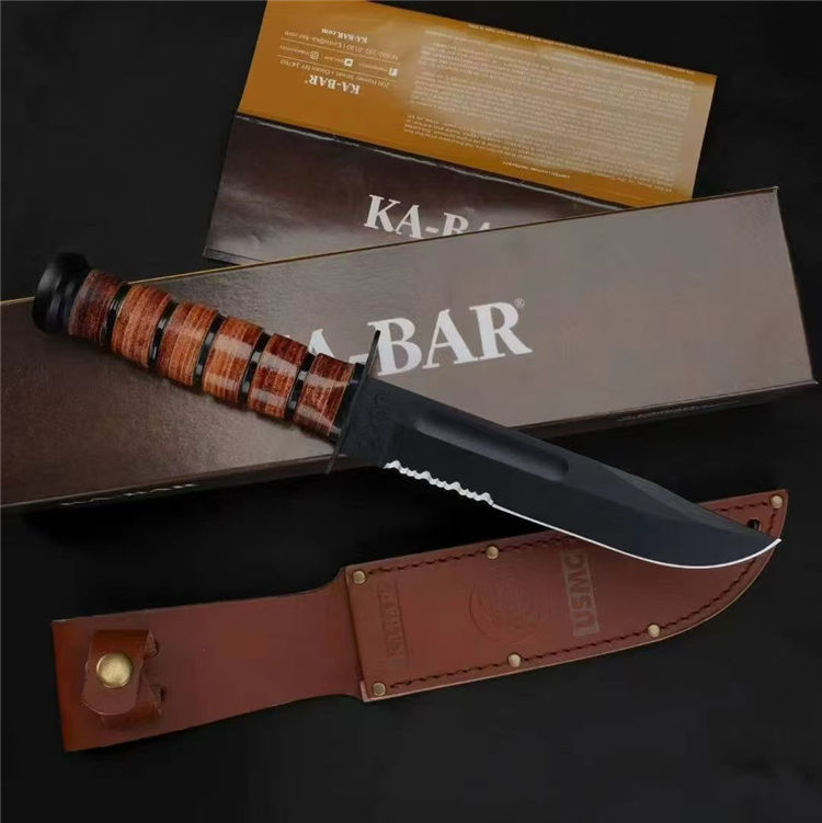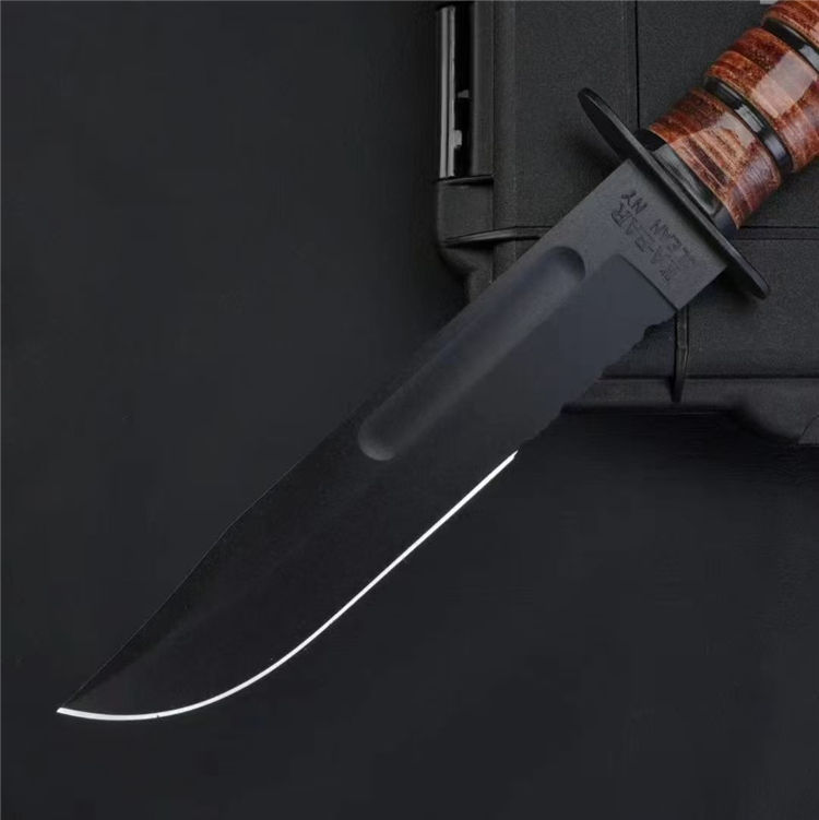 复刻版高配卡巴1218半齿直刀 全长:30.6cm 刃长:16.3cm 刃厚:0.43cm 刃宽:3.1cm 材质:1095高碳钢 硬度:58HRC 表面:磷化涂层 刀重:315.6克 总重:408.2克(含鞘) 手柄:牛皮 刀鞘:牛皮