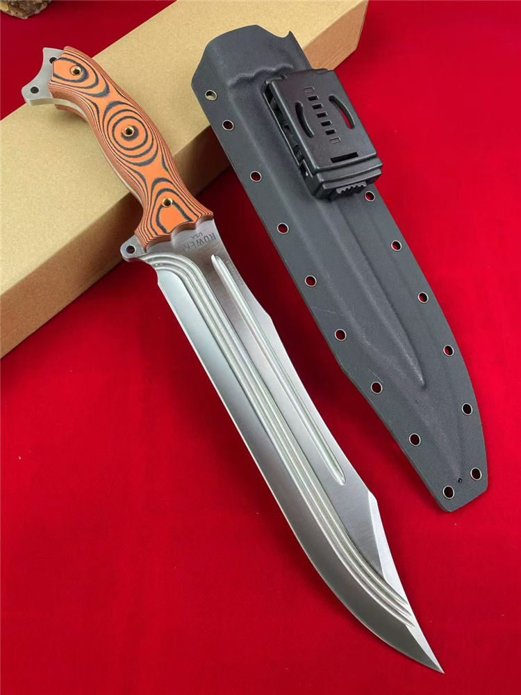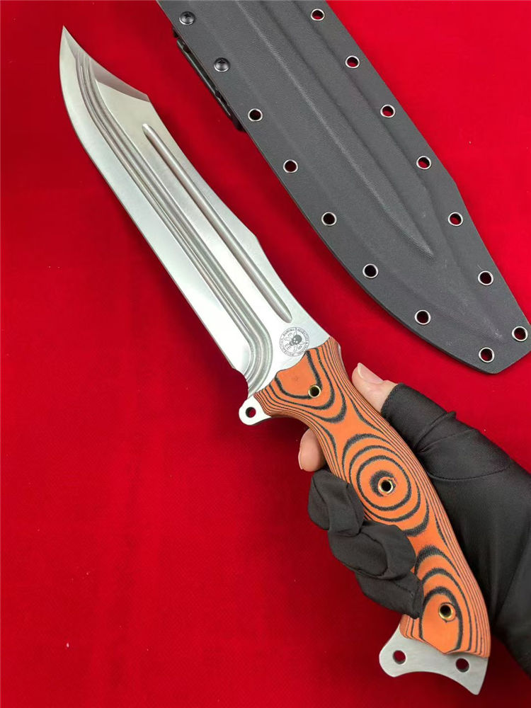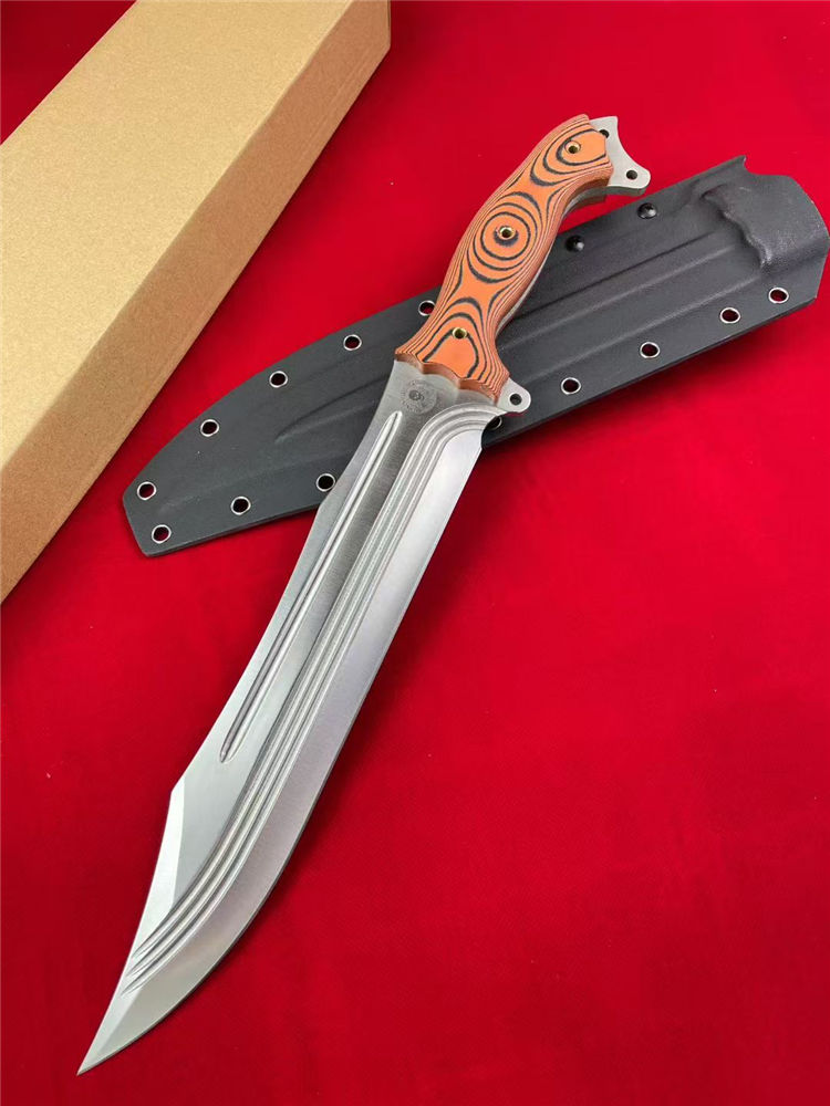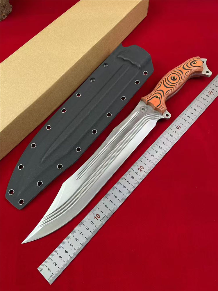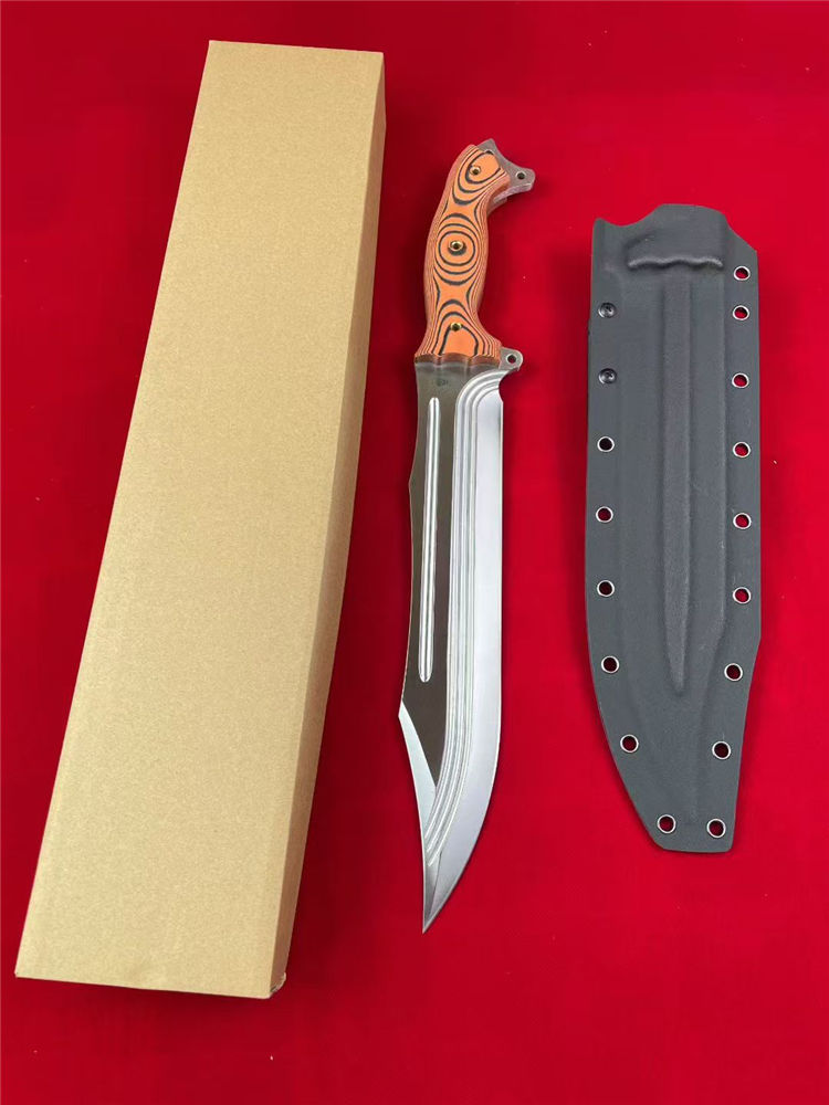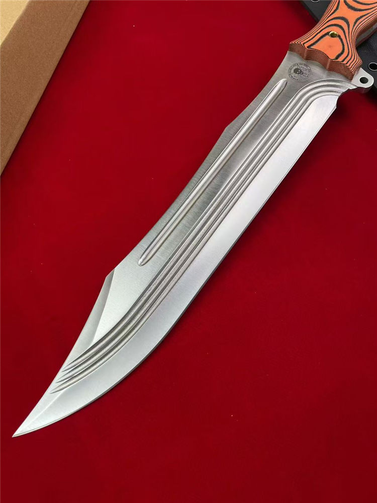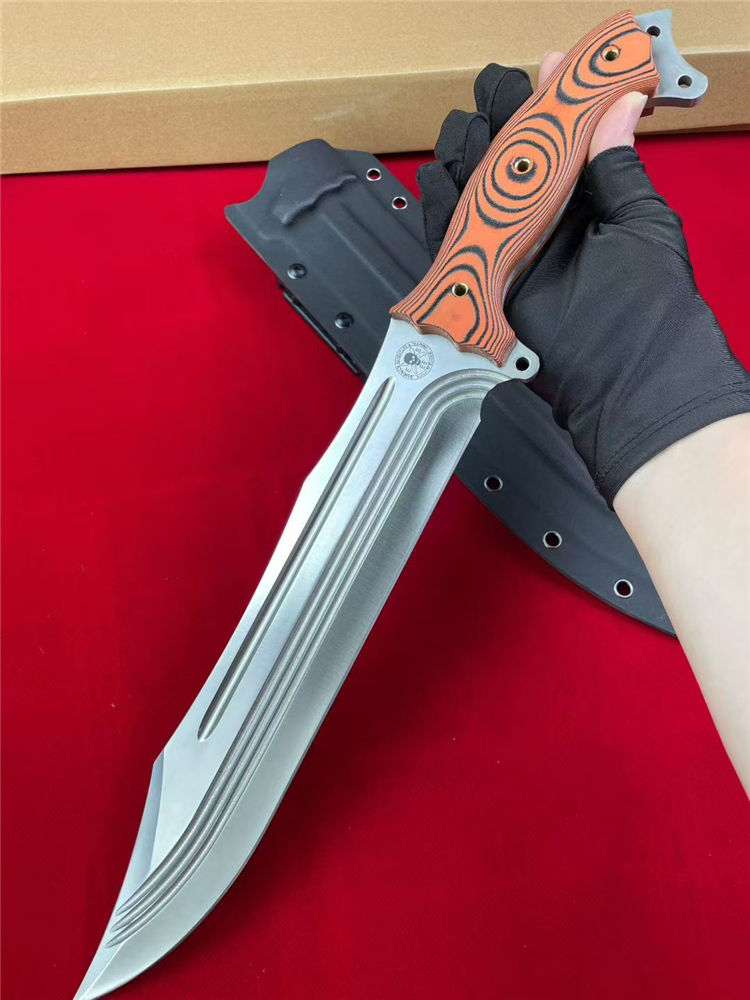 巴斯核弃妇战斗直刀 全长:44cm 刃长:27.5cm 柄长:15.5cm 刃宽:5cm 刃厚:5.8mm 刃材:9CR15MOV 硬度:59-60HRC 柄材:一体钢+G10 净重:675G/884G(含梢) 毛量:1003G 包装:K梢+礼盒