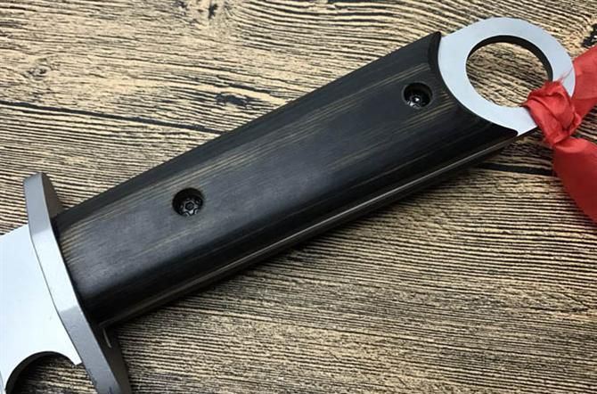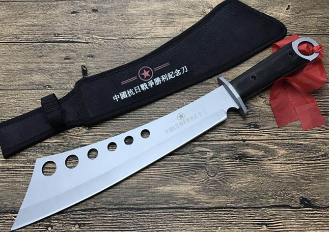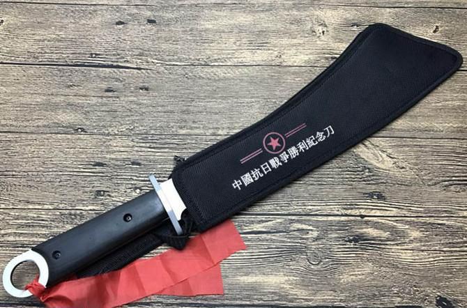 抗日战争纪念刀 全长:55cm 刃长:35.5cm 表面处理:镀灰钛 柄长:16.5cm 刃厚:4.8mm 刃宽:8cm(最宽处) 刃材:7Cr17 柄材:彩木 硬度:58HRC 重量:1000克(含尼龙套) 包装:拉链尼龙套、挂小红布
