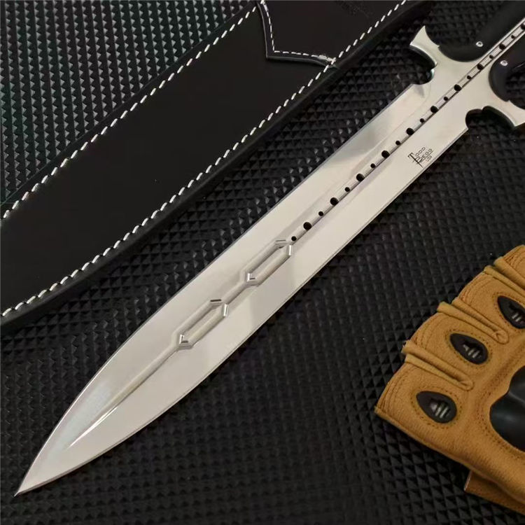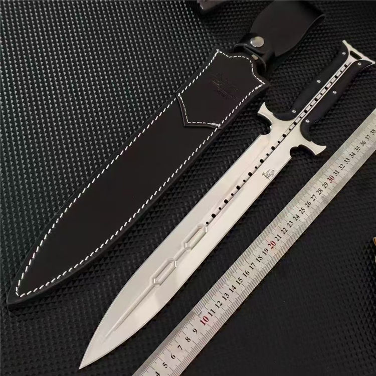 托德贝格恶龙圣剑直刀 全长:45cm 刃长:28.7cm 柄长:13.5cm 刃宽:4.1cm 刃厚:6mm 刃材:8CR13MOV 柄材:一体钢+高级工程ABS 刀重:691G(含皮套) 毛量:557G 硬度:58-60HRC 包装:皮套+礼盒