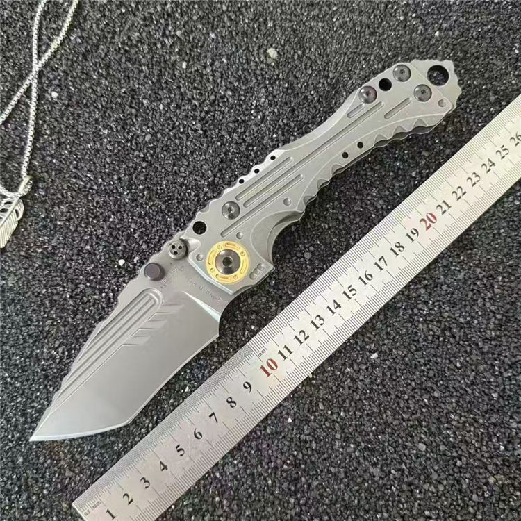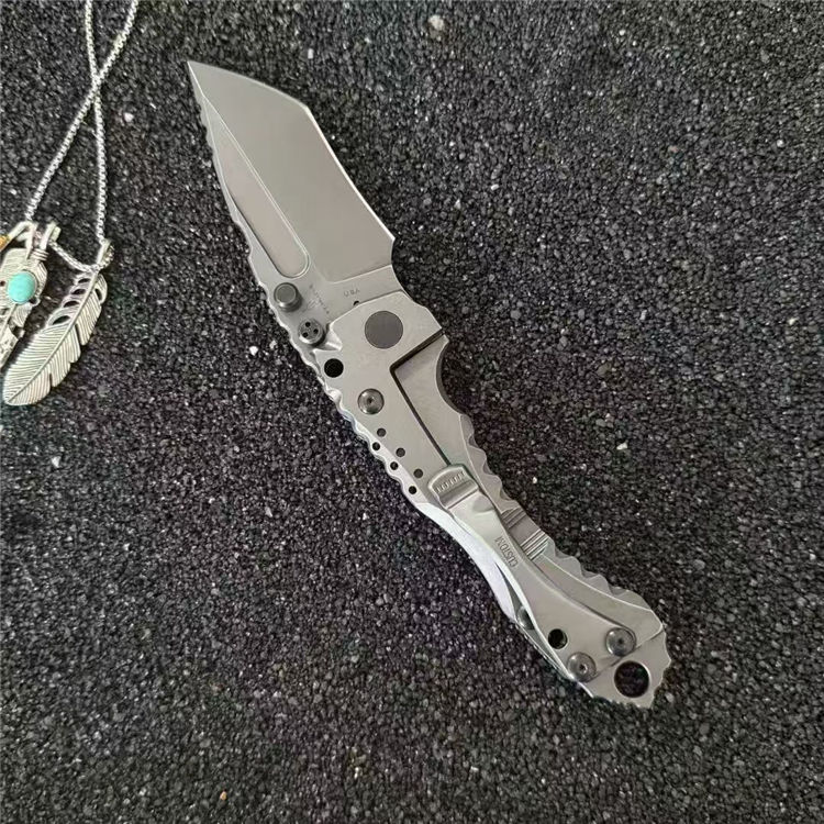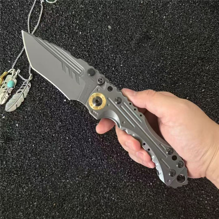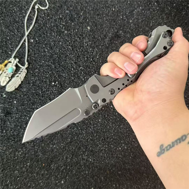 米勒T1-重型折刀 总长:25.5cm 刀刃:10.5cm 手柄:15cm 刃厚:6.5MM 宽度:4.5cm 钢材:Z-Wear粉末钢 硬度:61HRC 刀柄:模具钢手工+CNC 重量:529g