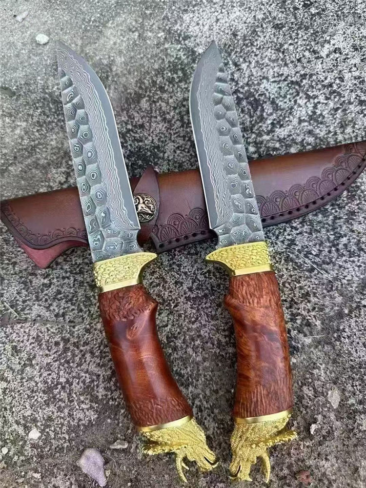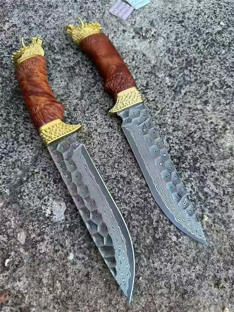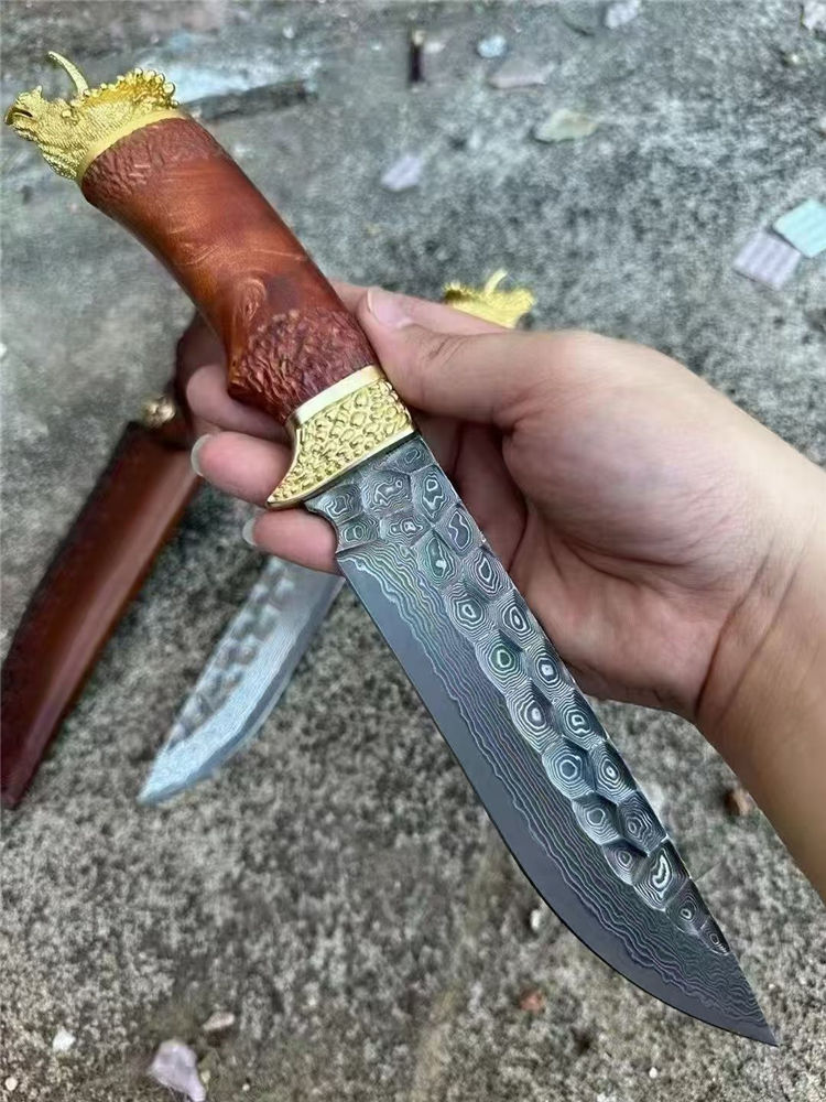 大马士革犀牛三角龙直刀 总长:30cm 刃长:14.8cm 刃厚:4mm 刃宽:3.3cm 钢材:进口锻造大马士革钢VG10钢芯103层 工艺:镀金,表面保留锻造捶打陨石纹理 热处理:专业真空热处理,淬火回火 硬度:60-62HRC 开刃:水冷多次开刃,设计以锋利度为主,保持性较好 重量:248G 手柄:镀金三角龙头+精选进口红影木瘤 皮套:意大利手工大师手作,纯手工雕花缝线,复古棕色工艺,手工雕刻图案 包装:复古手工盒子包装