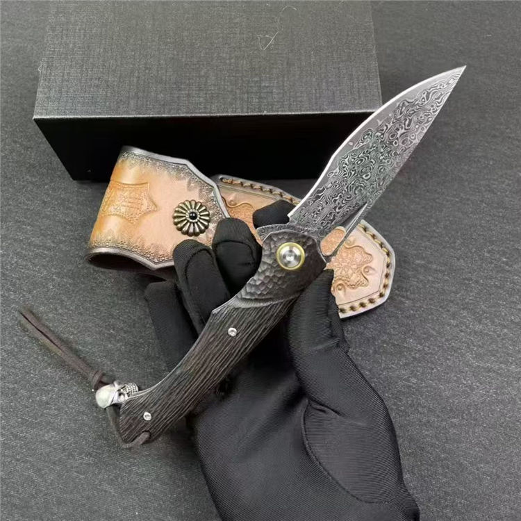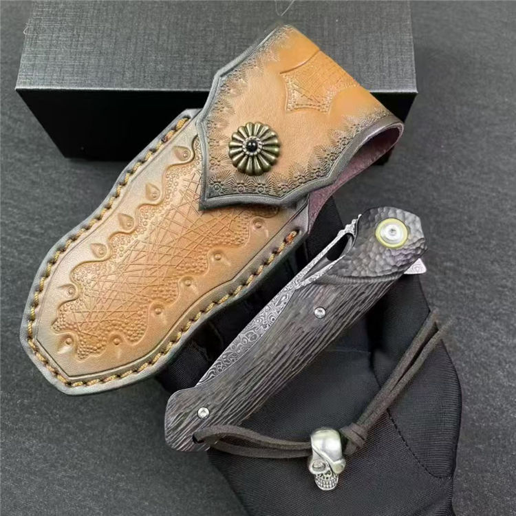 大马士革黑马折刀 全长:19.5cm 刃长:8.5cm 柄长:11.5cm 刃宽:2.3cm 刃厚:3mm 刃材:大马士革钢 柄材:微粒红檀木 刀重:100/145G(含皮套) 毛量:227G 硬度:58-60HRC 包装:皮套+礼盒
