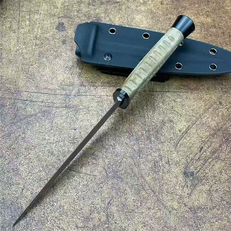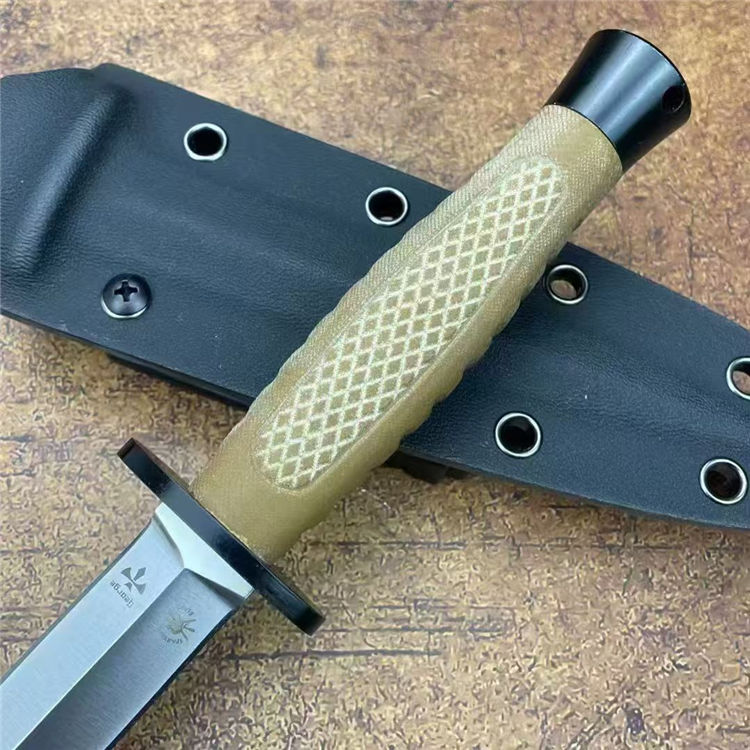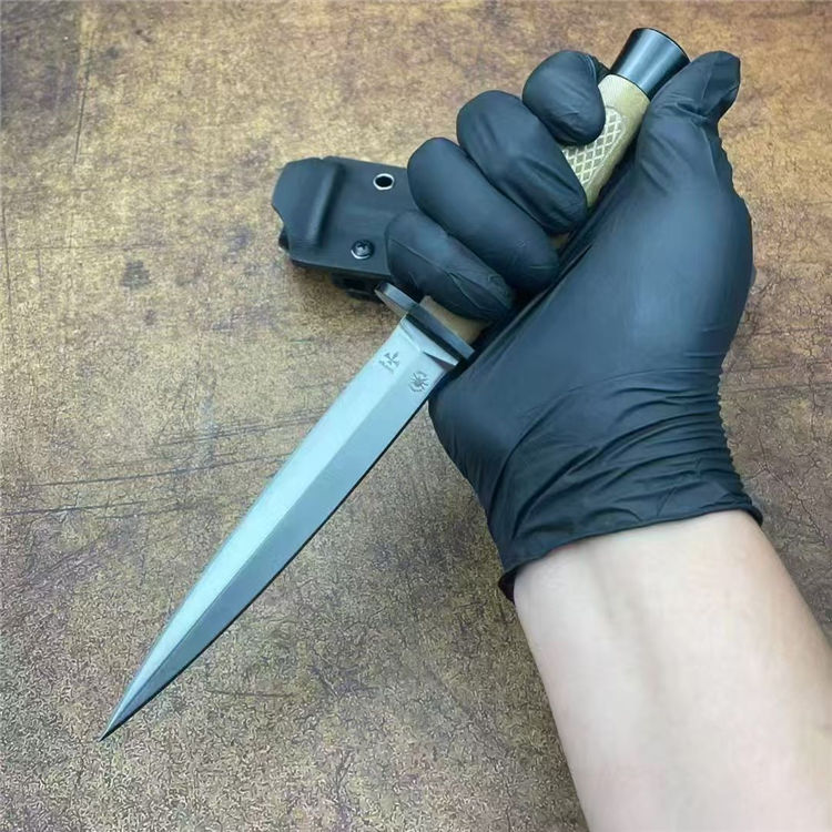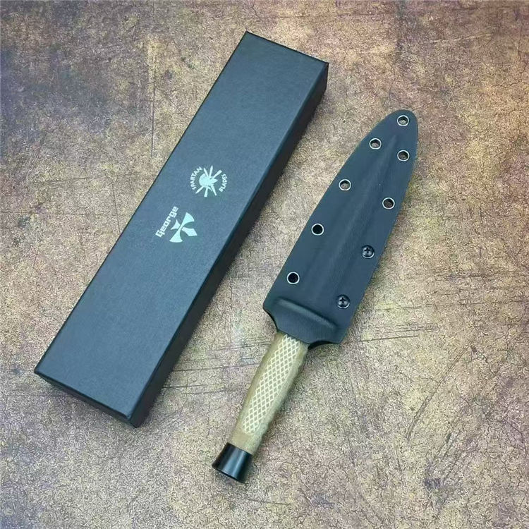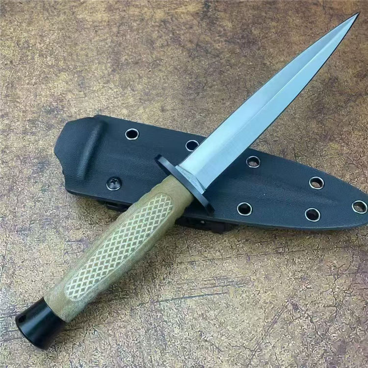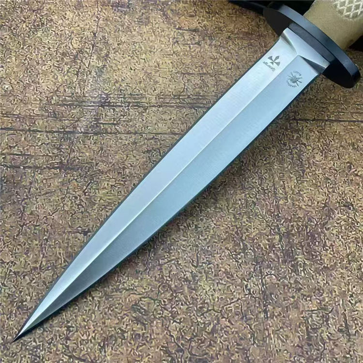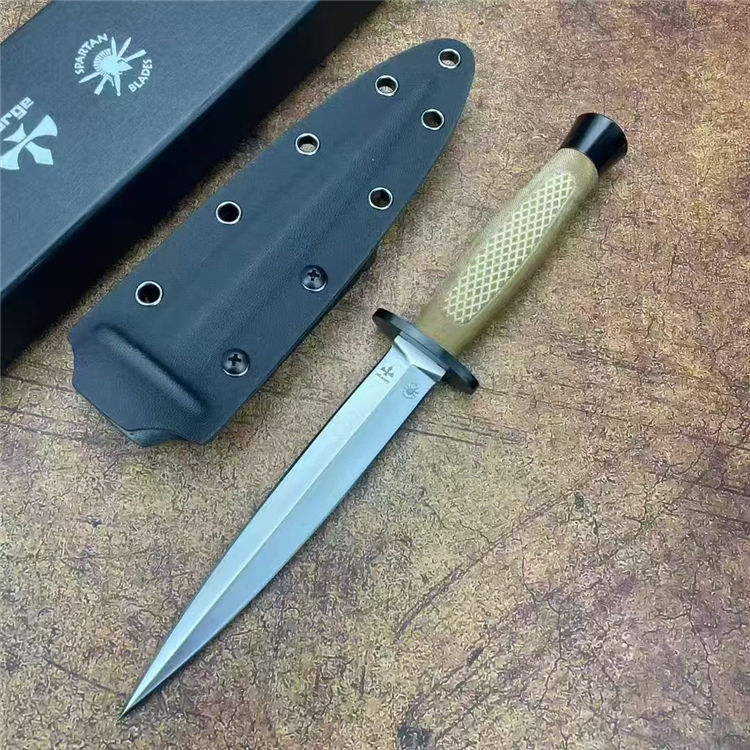 斯巴达联名双刃直刀 全长:26cm 刃长:15cm 柄长:11cm 刃宽:2.2cm 刃厚:0.5cm 刃材: VG-10 柄材:G10 硬度;59HRC 净重:192克 毛重:401克
