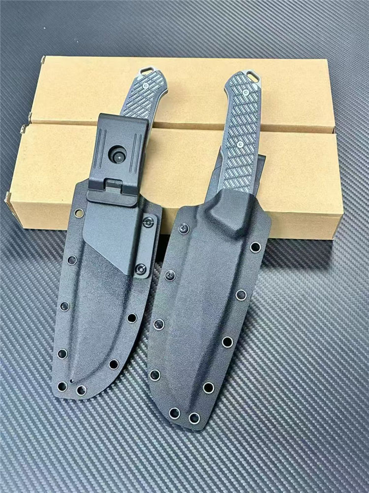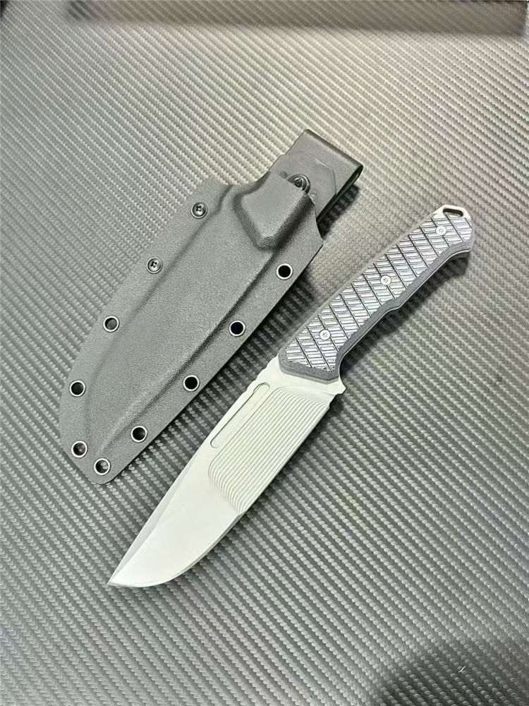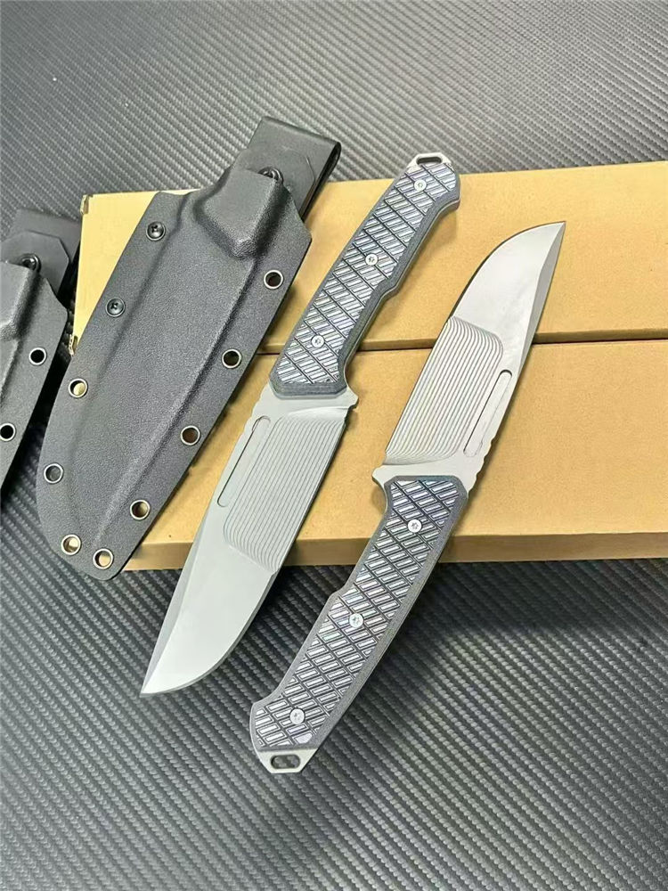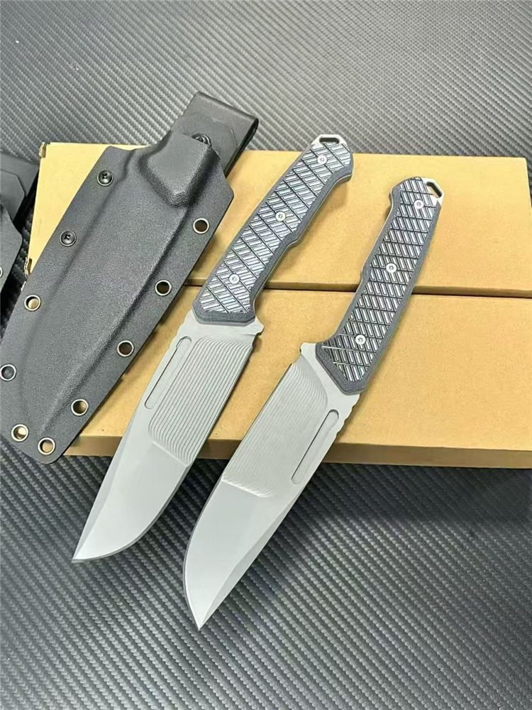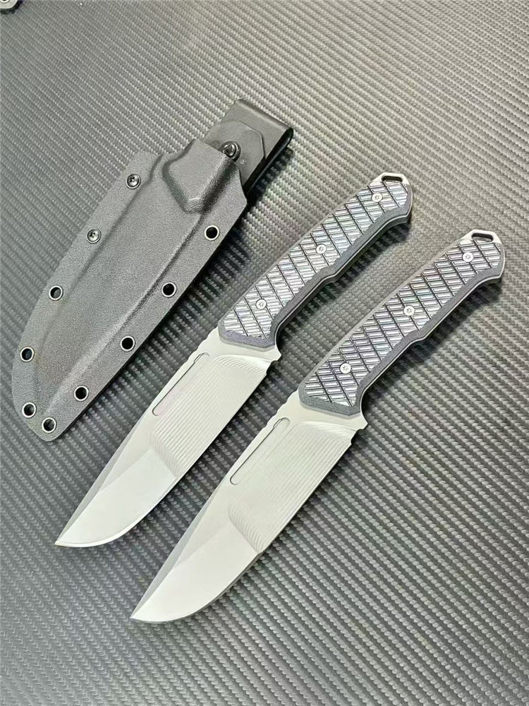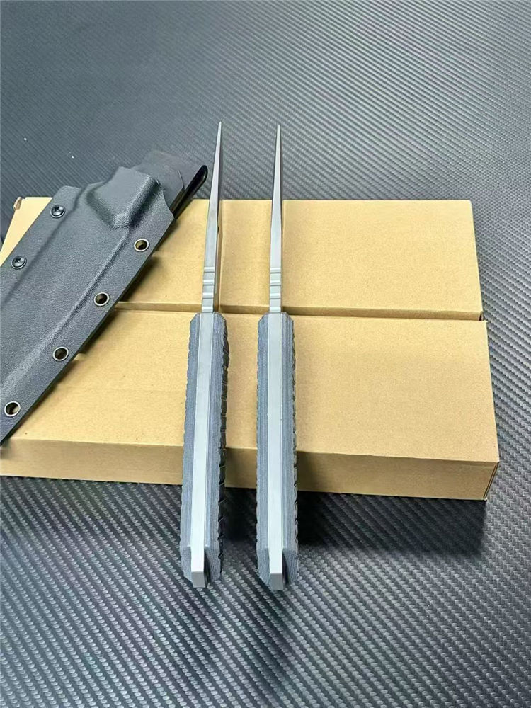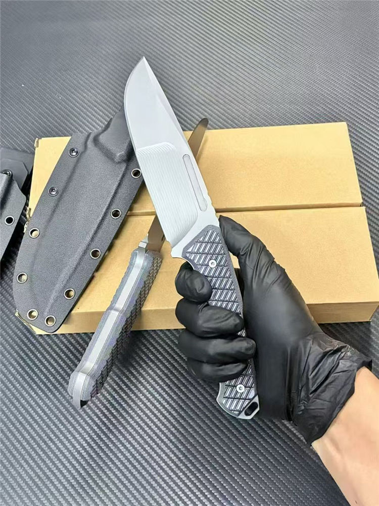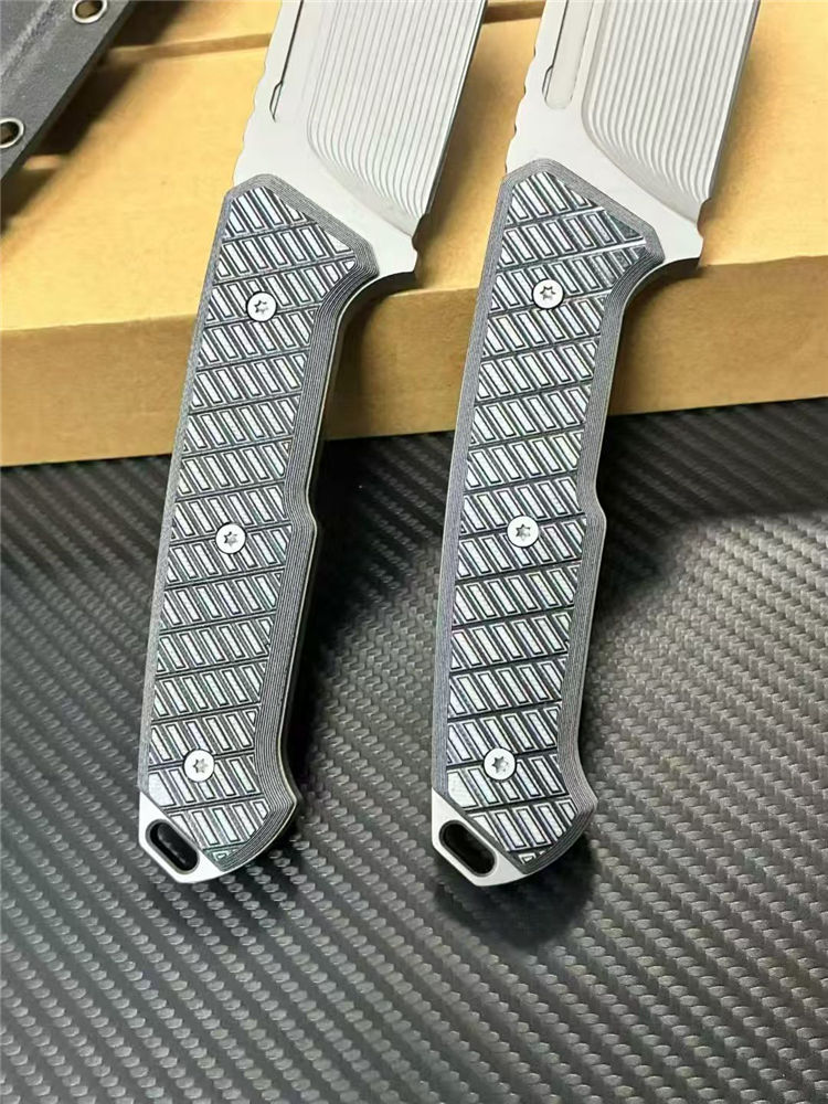 L7-战争狂人直刀 全长:27cm 刃长:14cm 柄长:12.5cm 刃厚:6mm 刃宽:5cm 刃材:DC53表面线条采用CNC电脑锣精雕纹路 柄材:G10 硬度: 60HRC 表面:灰钛 重量:单刀362g