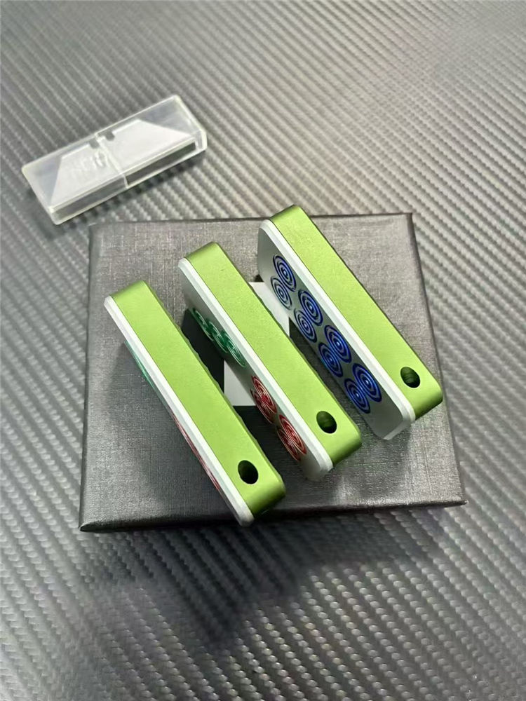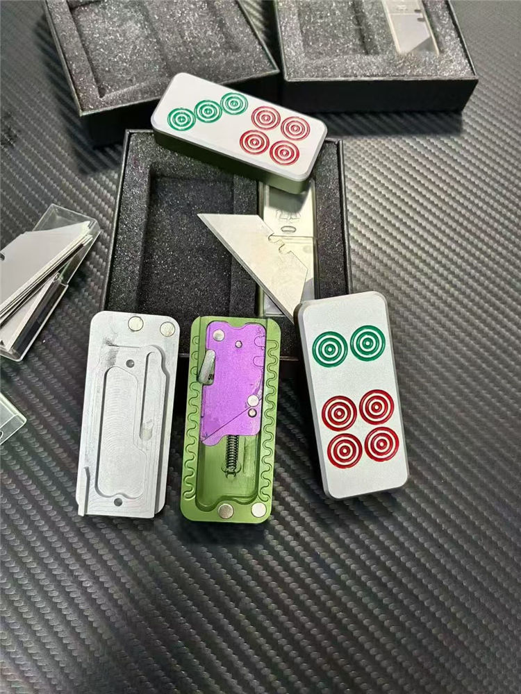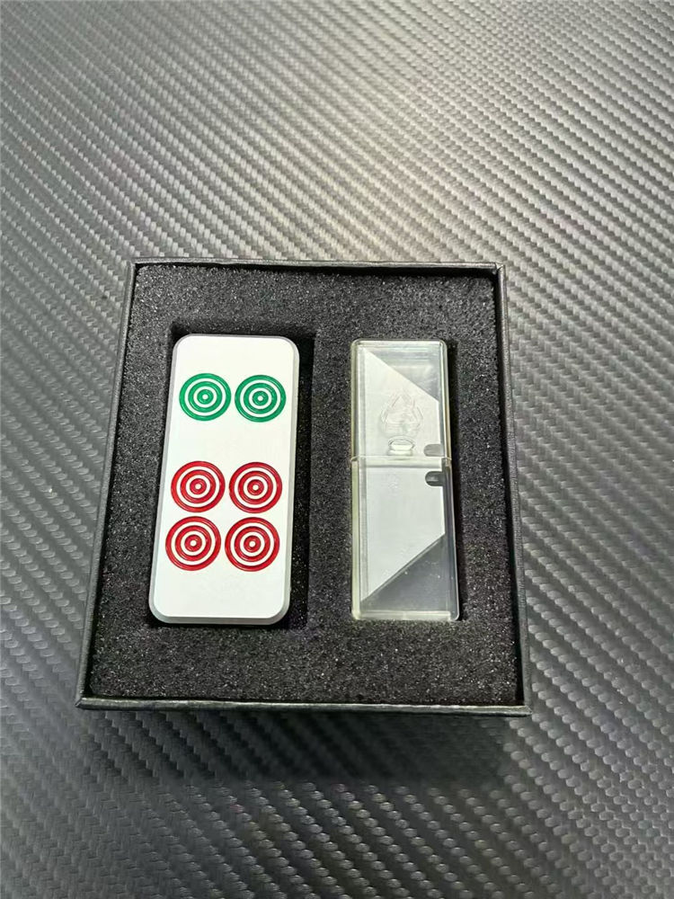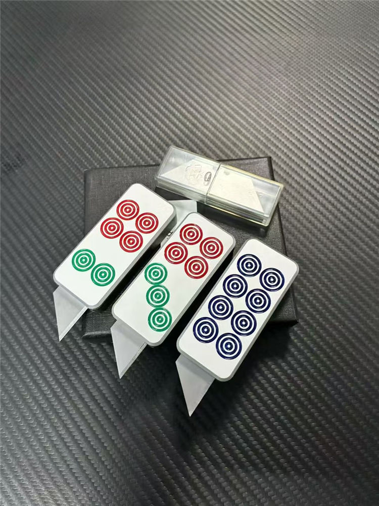 麻将推牌美工刀 总长:8.6cm 刃长:2cm 刃宽:6.5cm 美工:碳钢 柄材:T6061航空铝合金 柄长:6.5cm 柄宽:3cm 柄厚:1.2cm 重量:55G