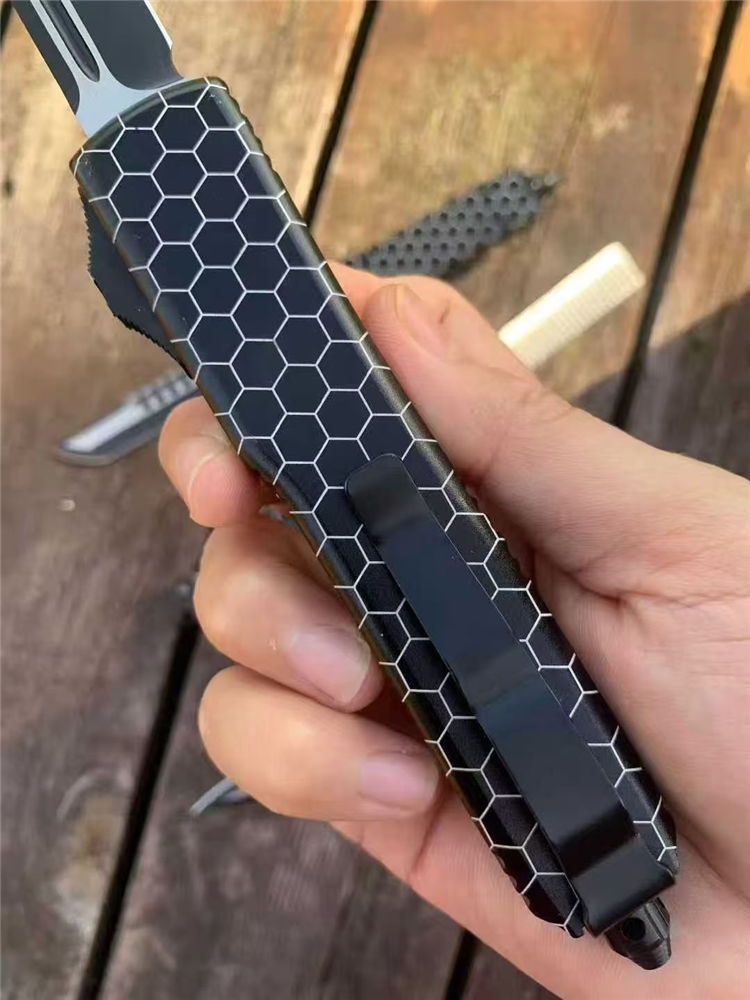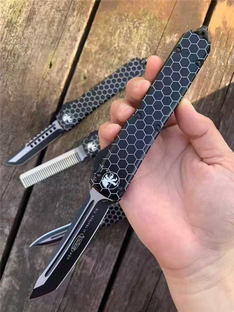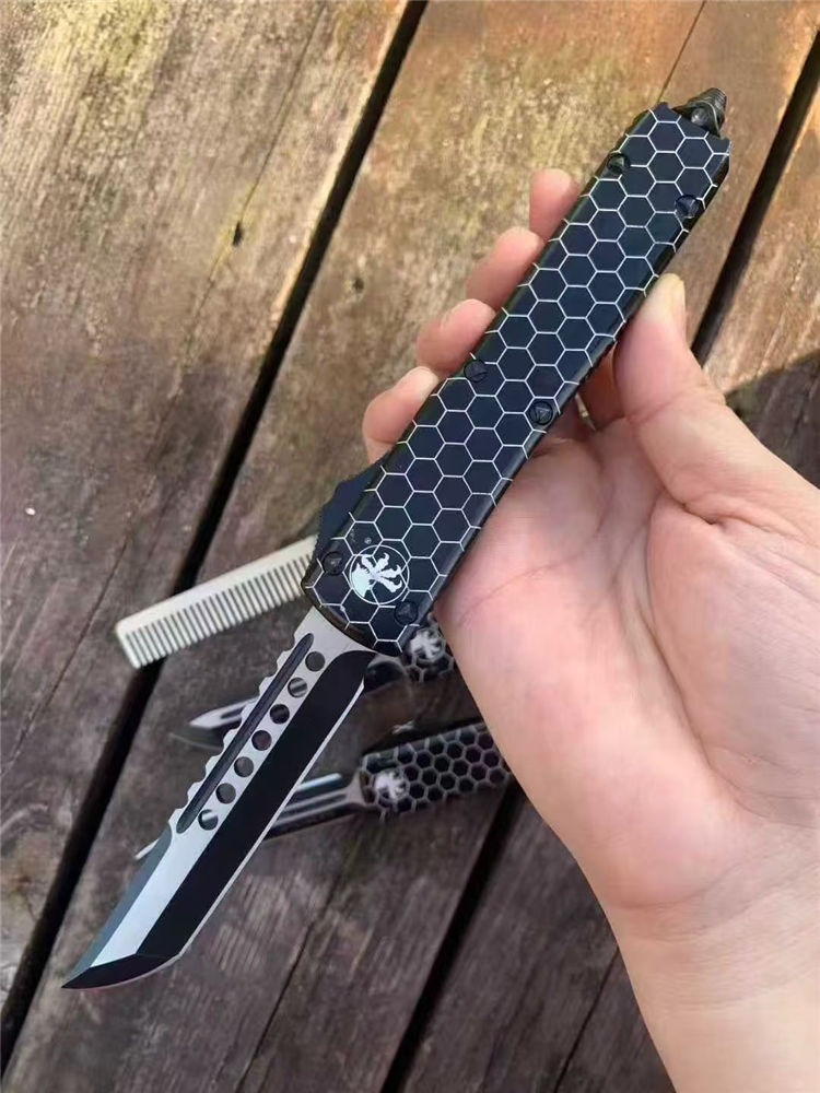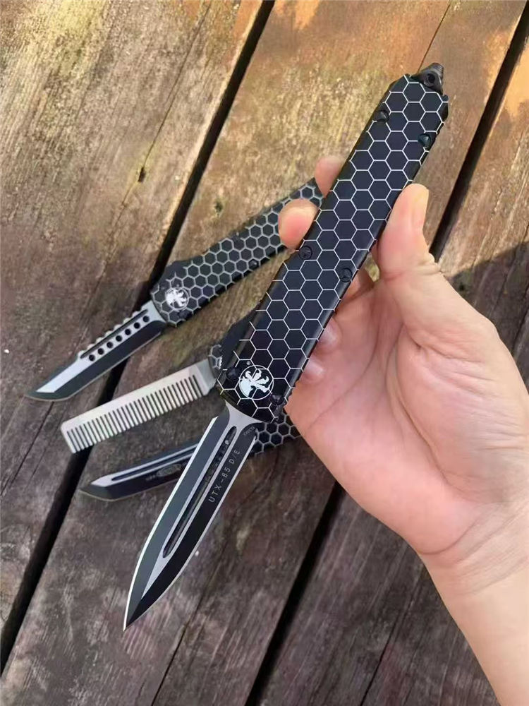 微技术UT85网纹直出跳刀 全长:22cm 刃长:9cm 柄长:13cm 刃宽:1.8cm 刃厚:0.31cm 刃材:440 柄材:T6航空铝合金 刀型:直跳。 锁定:按钮锁 刀重:98克 附件:尼龙套,说明书,彩盒,送拆刀工具 整刀用CNC,电脑锣,线切割制作而成,手工,精密度非常高