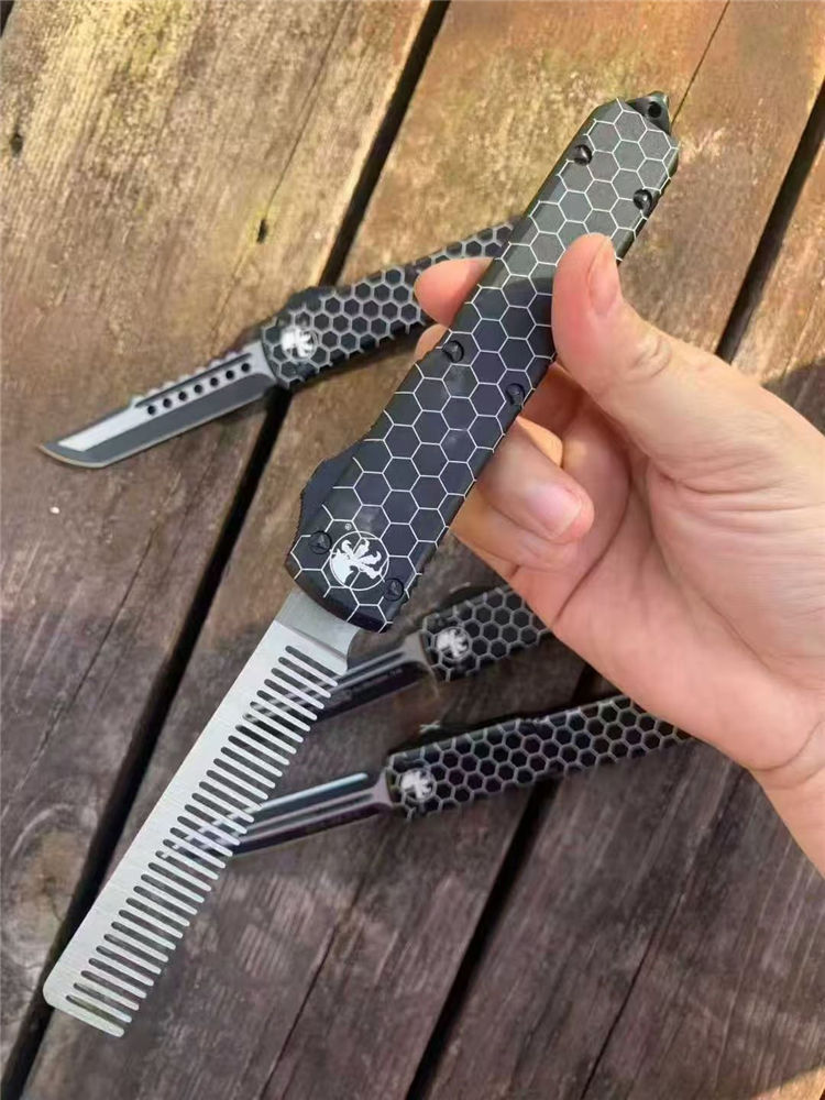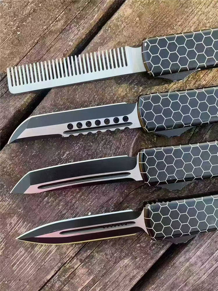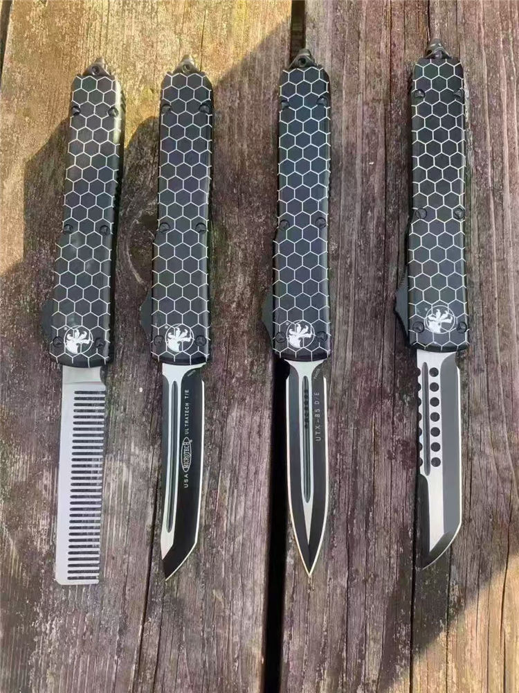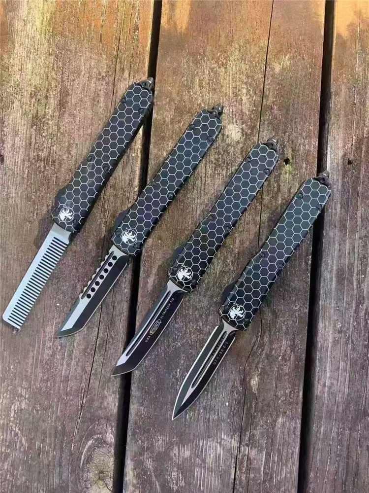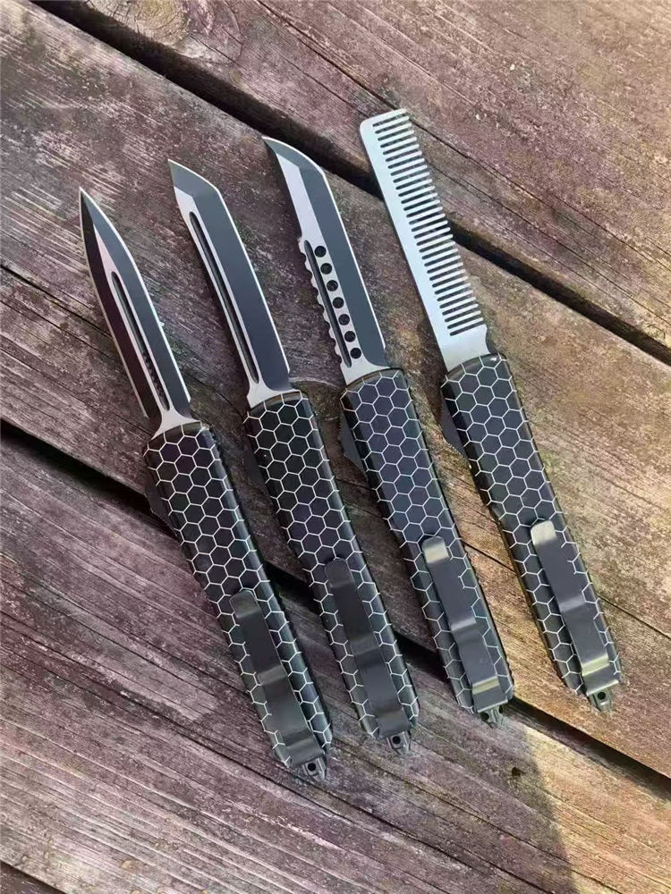 微技术UT85网纹直出跳刀 全长:22cm 刃长:9cm 柄长:13cm 刃宽:1.8cm 刃厚:0.31cm 刃材:440 柄材:T6航空铝合金 刀型:直跳。 锁定:按钮锁 刀重:98克 附件:尼龙套,说明书,彩盒,送拆刀工具 整刀用CNC,电脑锣,线切割制作而成,手工,精密度非常高