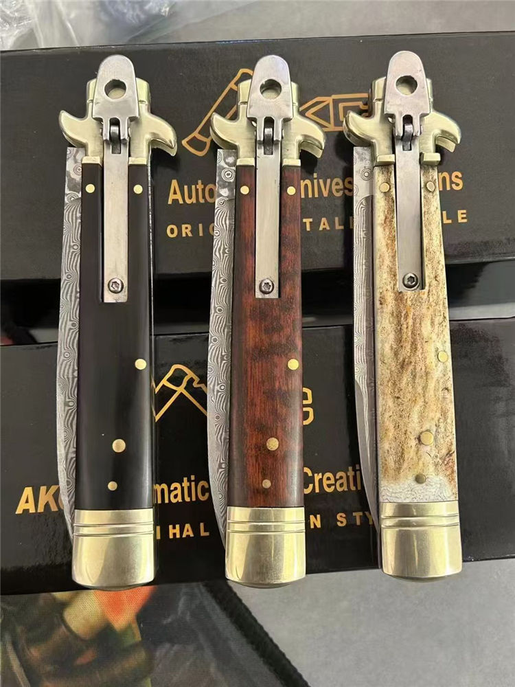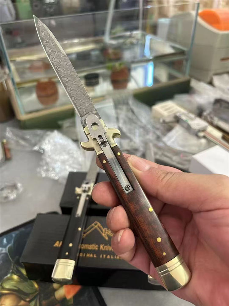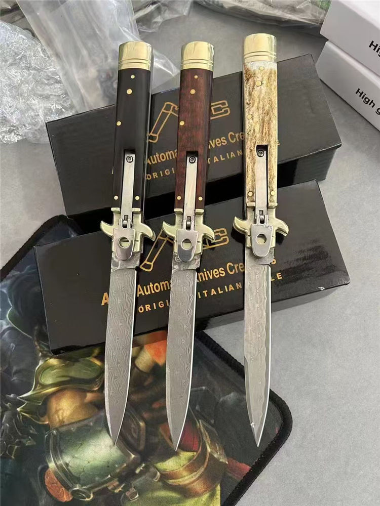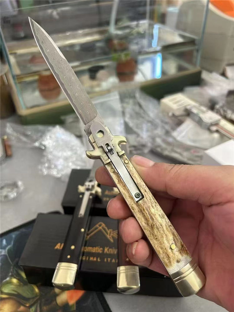 大马士革意大利古典Plus侧开跳刀 全长:23cm 刃长:9cm 刃厚:3mm 刃材:大马士革刃 硬度:HRC58 柄材:双黄铜护手+牛角、蛇纹木、鹿角 重量:150克(净重)245(毛重) 附送原装精美礼盒