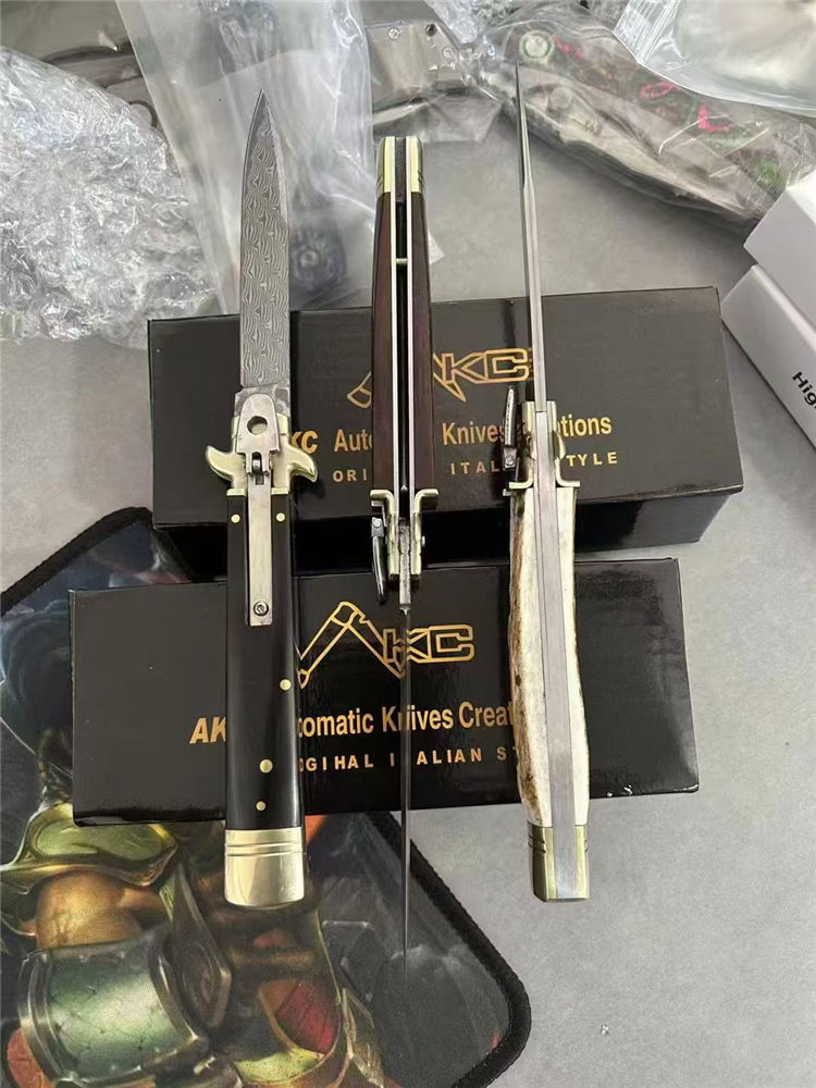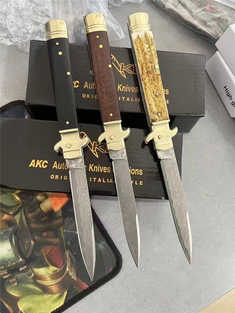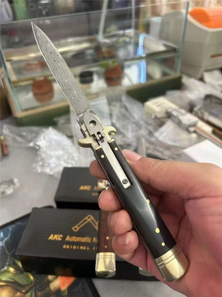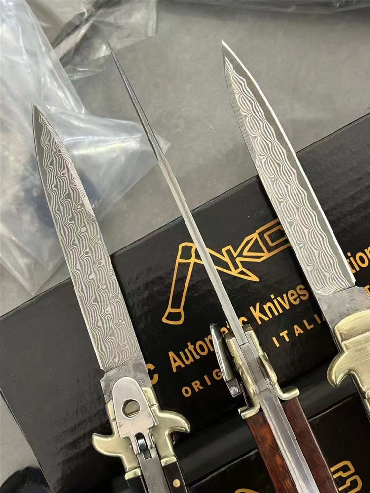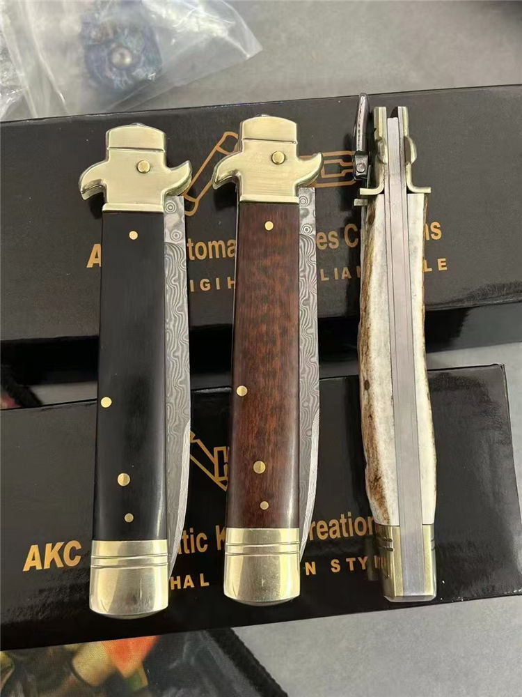 大马士革意大利古典Plus侧开跳刀 全长:23cm 刃长:9cm 刃厚:3mm 刃材:大马士革刃 硬度:HRC58 柄材:双黄铜护手+牛角、蛇纹木、鹿角 重量:150克(净重)245(毛重) 附送原装精美礼盒