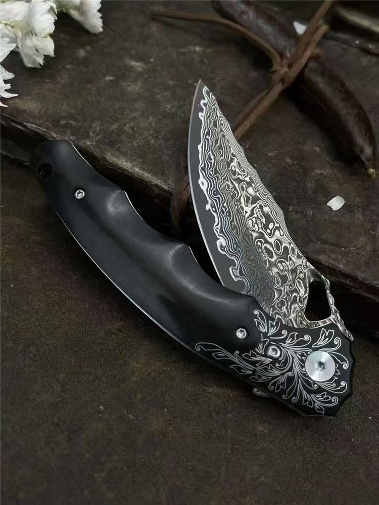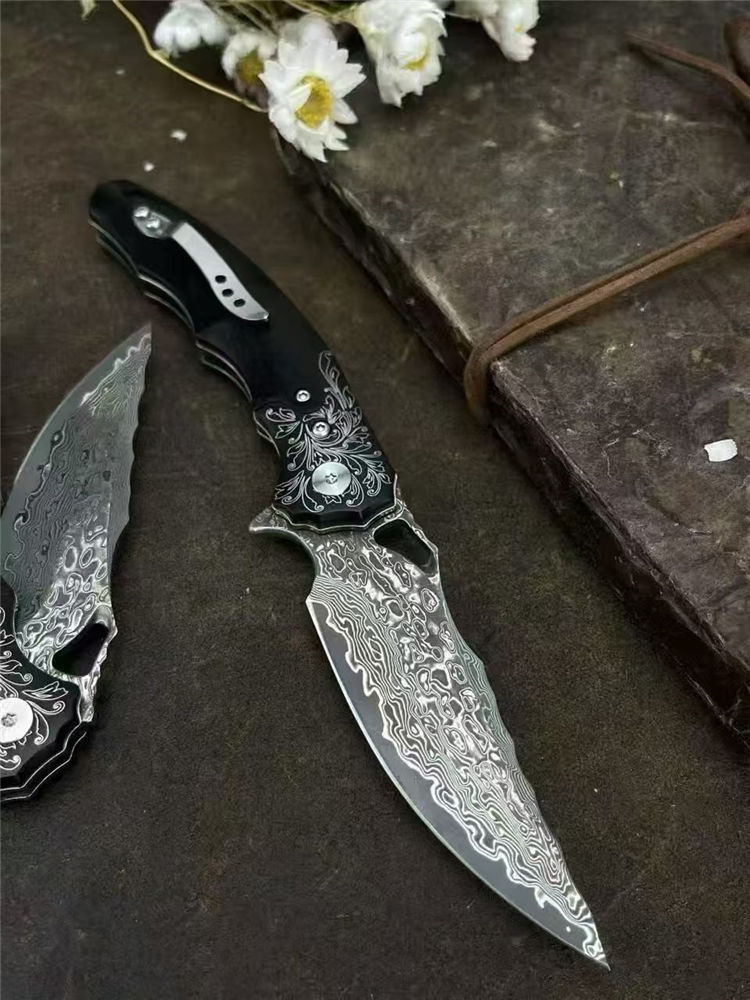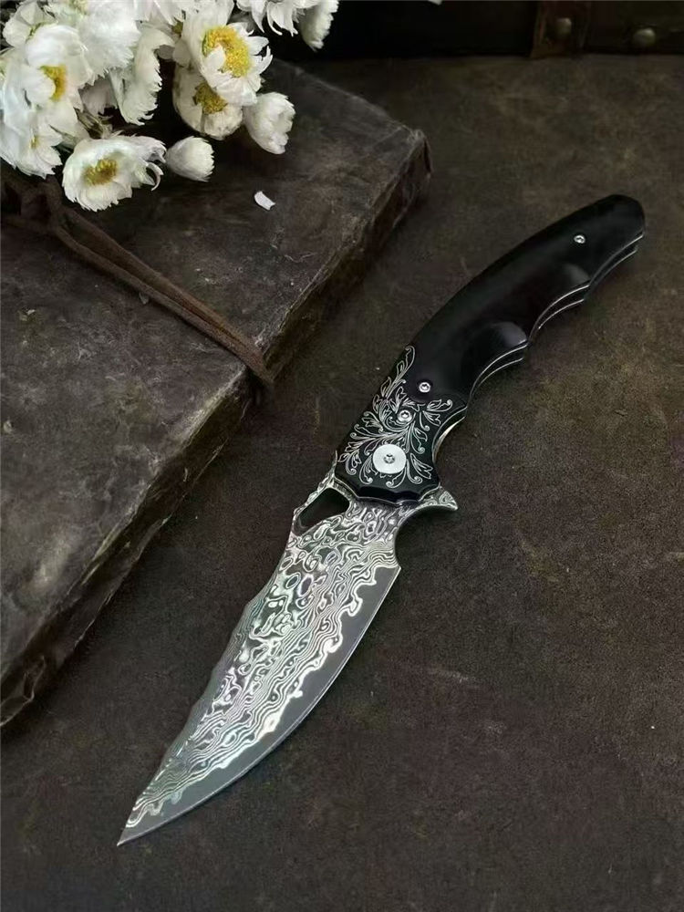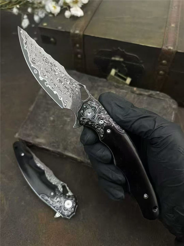 大马士革龙牙折刀 总长:20cm 刃长:8cm 闭合:11.5cm 刃宽:2.8cm 刃厚:3mm 系统:滚珠轴承 硬度:60HRC 柄材:304不锈钢+黑檀木 包装:手工黑硬盒