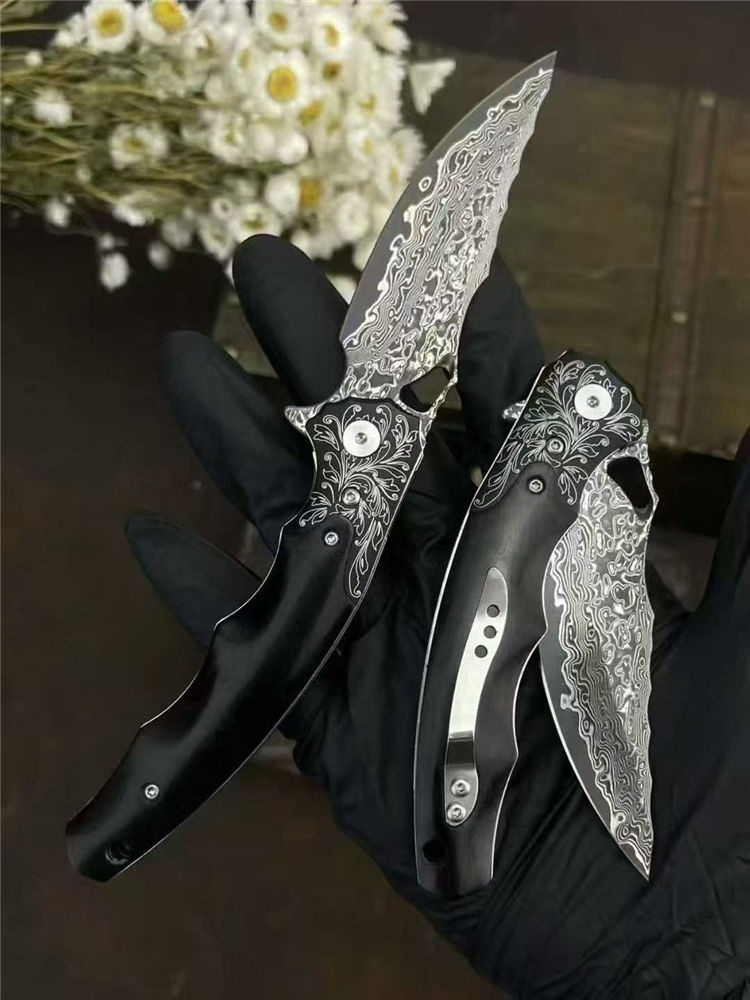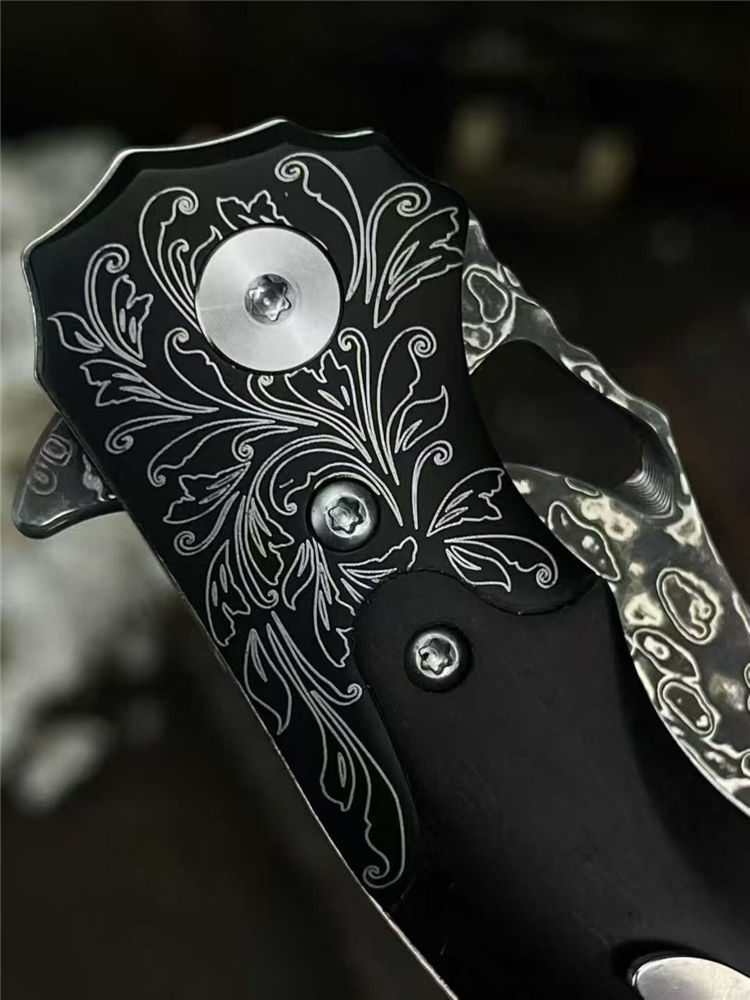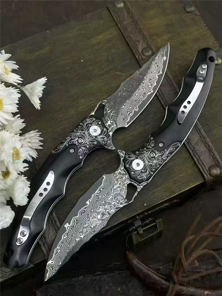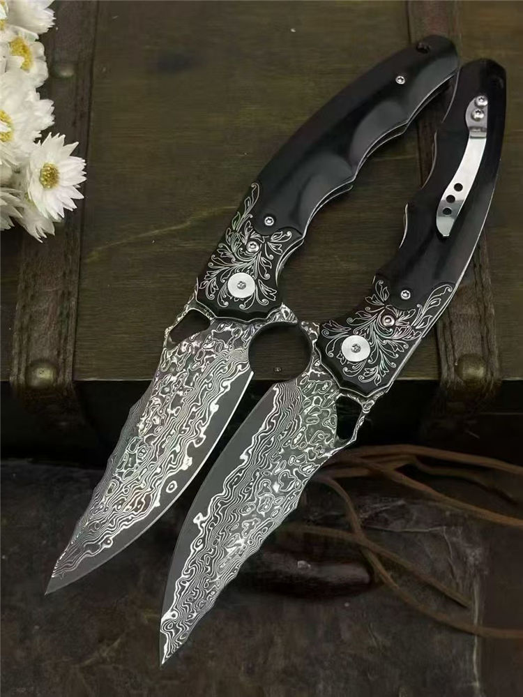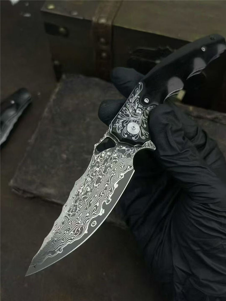 大马士革龙牙折刀 总长:20cm 刃长:8cm 闭合:11.5cm 刃宽:2.8cm 刃厚:3mm 系统:滚珠轴承 硬度:60HRC 柄材:304不锈钢+黑檀木 包装:手工黑硬盒