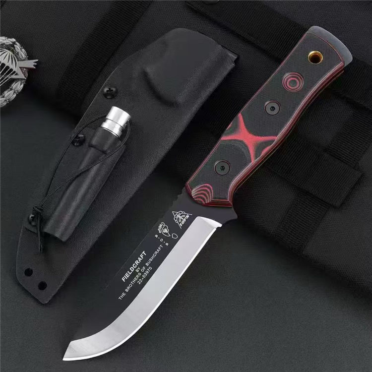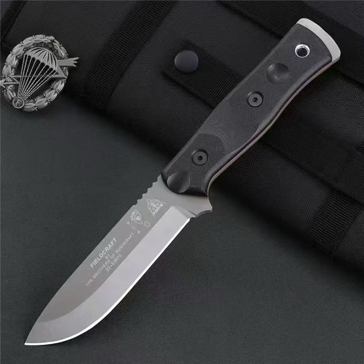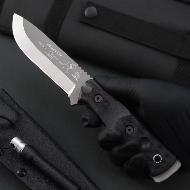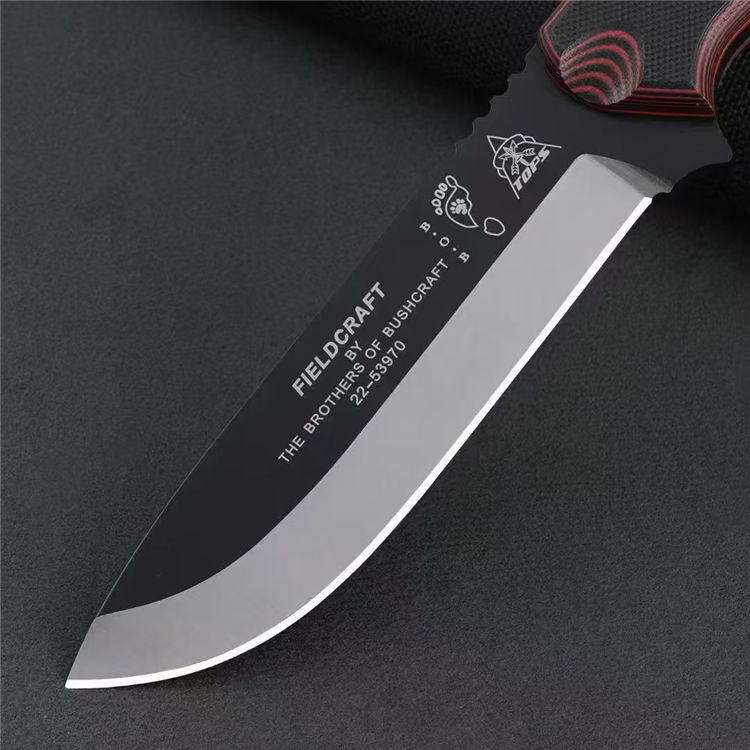 美国TOPS战术生存直刀 全长:25cm 刃长:9.8cm 刃材:154CM 硬度:60-61HRC 表面:镀钛石洗做旧工艺 柄厚:2.3cm 柄材:Black Linen Micarta®黑色亚麻卡塔,内藏红钢纸 刃厚:6mm 刃宽:3.2cm 重量:296克、10.45OZ 设计者:TOM BROWN 类型:生存刀,自带KYDEX刀鞘+打火石镁棒,佩戴方式,钢制360度灵活旋转皮带夹子