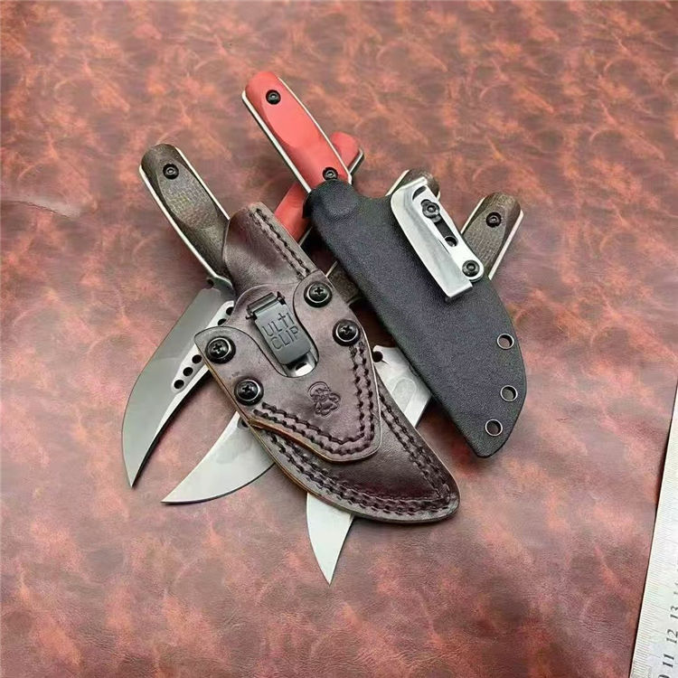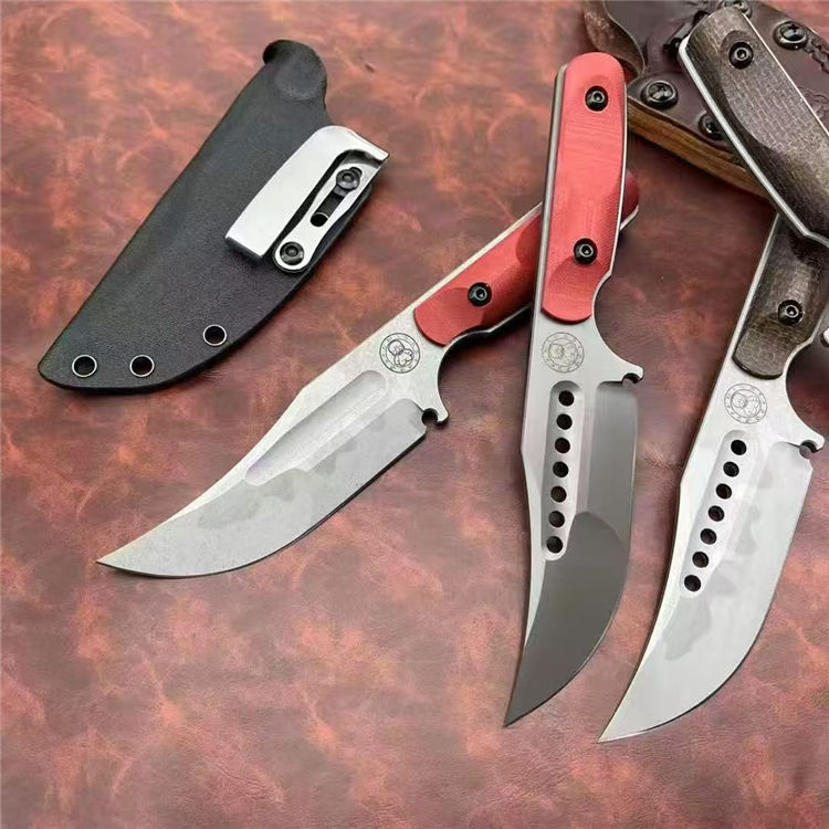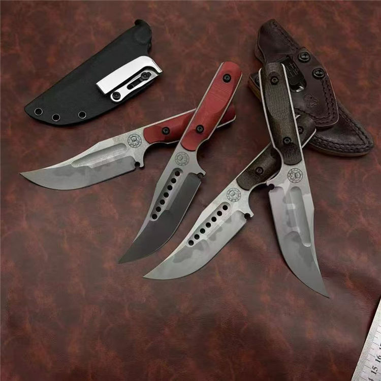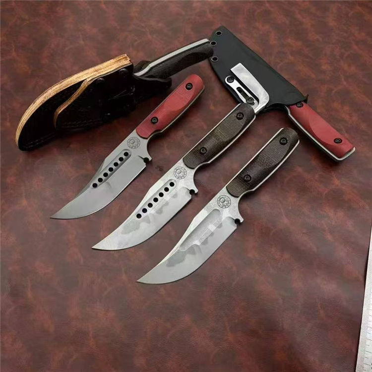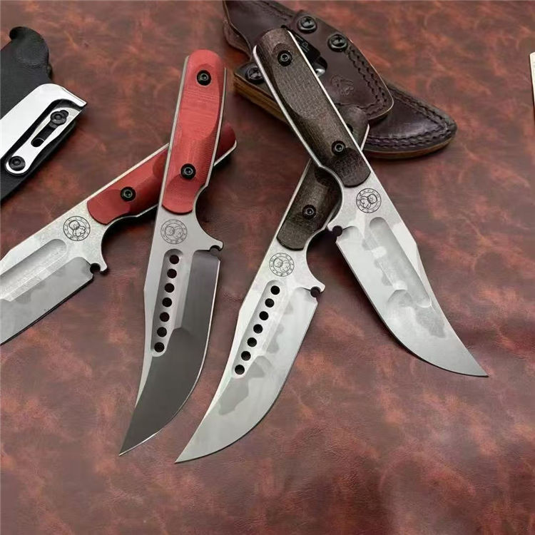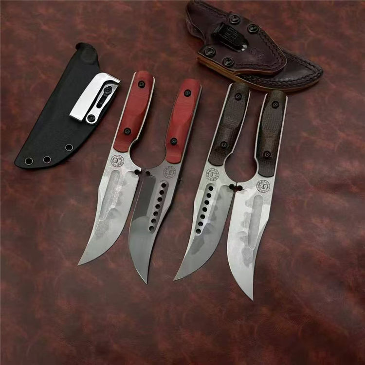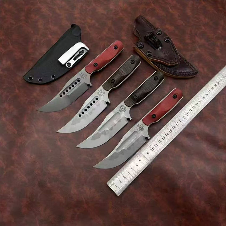 毒蛙战术直刀 全长:215mm 刃长:105mm 宽度:32mm 厚度:4.8mm 材料:vg10-真空热处理 硬度:60左右 重量:178克 柄材:红色G10,棕色亚麻柄 皮鞘:进口头层植鞣皮