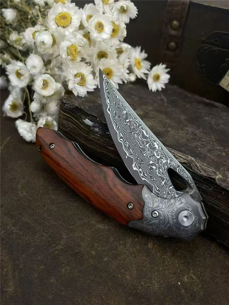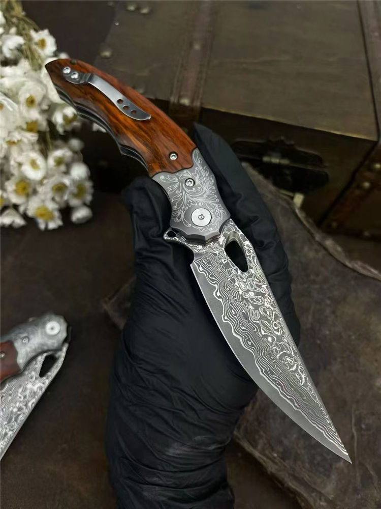 大马士革灵鸢折刀 总长:20.5cm 刃长:8.8cm 手柄:11.5cm 刃厚:3mm 刃宽:2.7cm 钢材:锻造大马士革钢(78层) 硬度:60HRC 柄材:304不锈钢+老料黄檀木 内置:滚珠轴承 重量:125g 刀套:皮套 包装:黑色手工盒