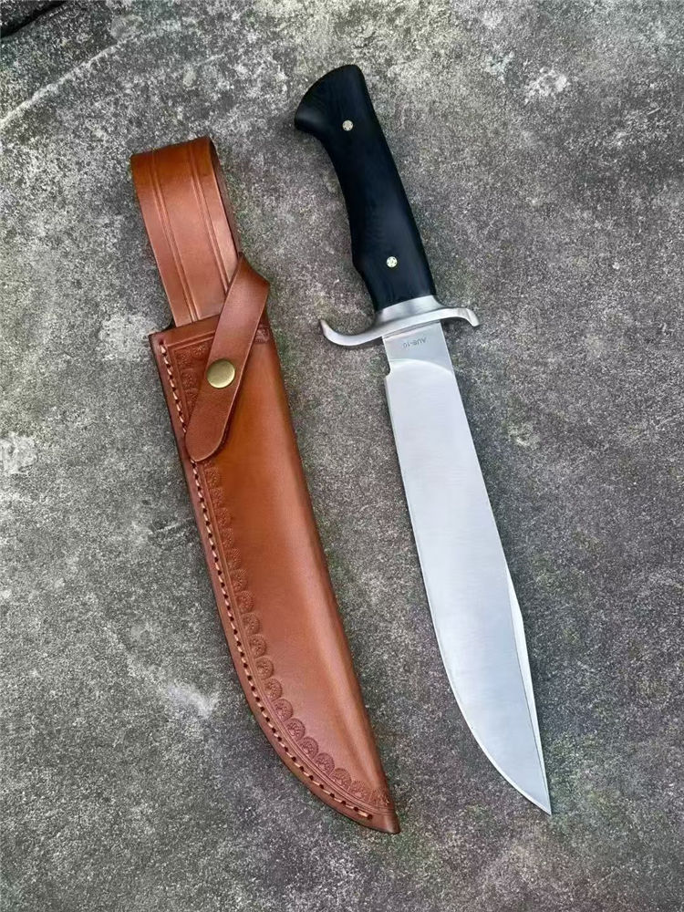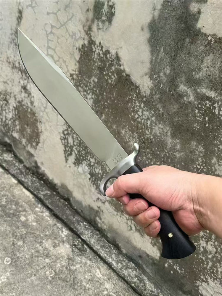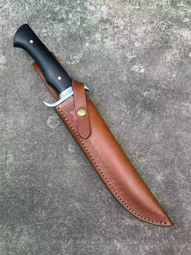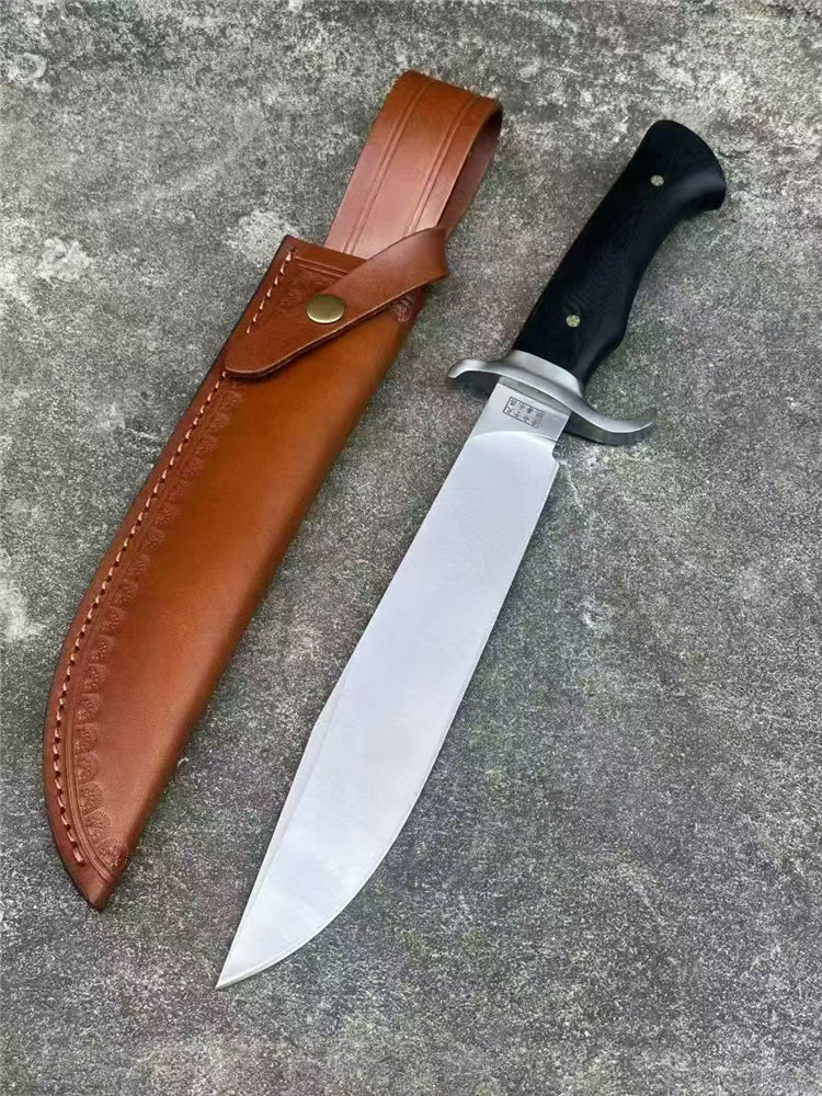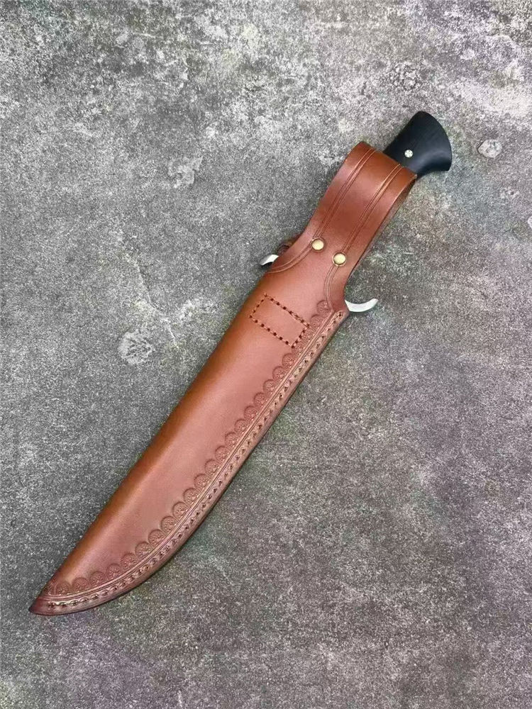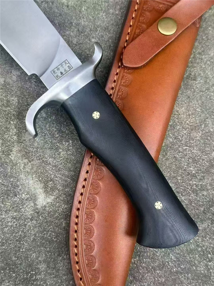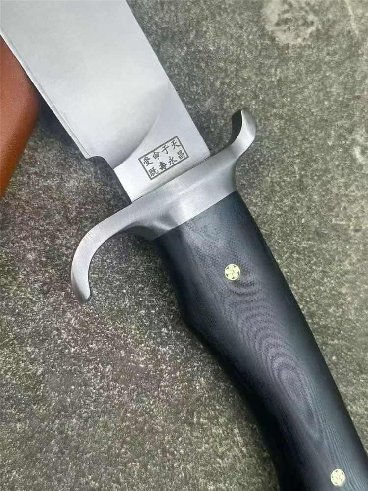 生杀大权博弈直刀 全长:405mm 刃长:270mm 刃厚:6.7mm 刃材:AUS-10钢 硬度:60HRC(真空油冷热处理) 表面:精幼砂光 刃面:大平磨 柄材:G10 配件:手工刀纯铜马赛克铆钉 刀鞘:优质高档纯手工牛皮套 刀重:约650G总重:约980G
