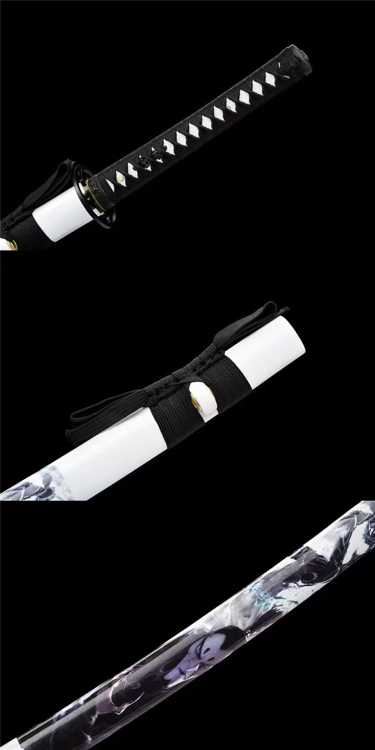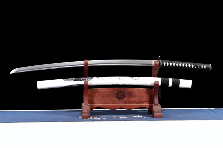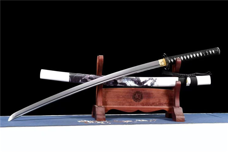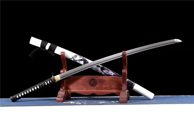 申公豹武士刀 全长:102cm 刃长:73cm 柄长:26cm 刃宽:3.2cm 全重:1.3kg 刃材:中碳钢 鞘材:实木漆鞘彩绘 配精美锦盒