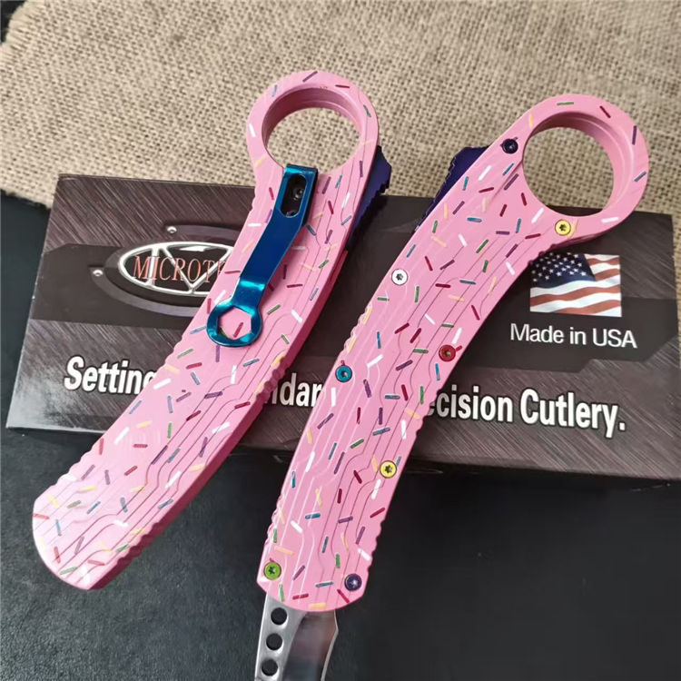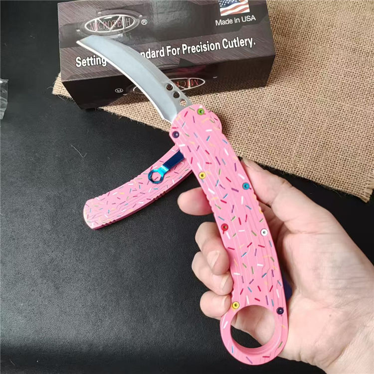 微技术甜甜圈红猛禽爪子跳刀 总长:22.7cm 刃长:8cm 刃宽:1.7cm 刃厚:2.5mm 刃材:440C 柄长:14.7cm 柄材:锌铝合金 柄宽:26mm 柄厚:14.8mm