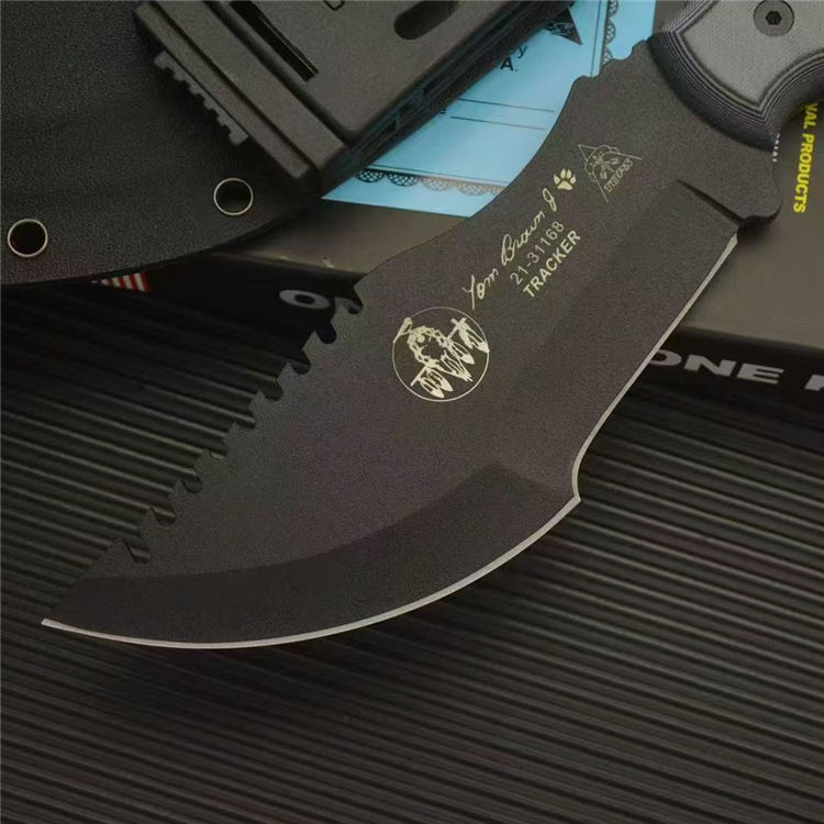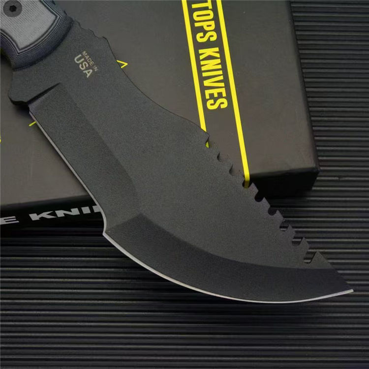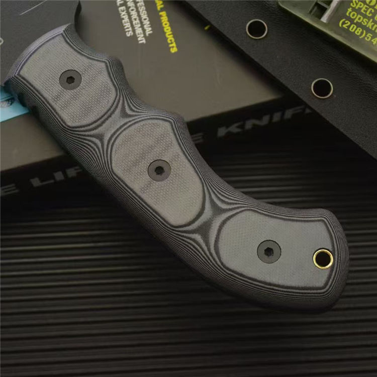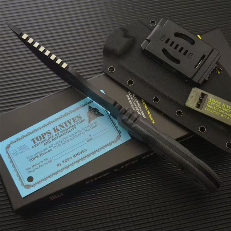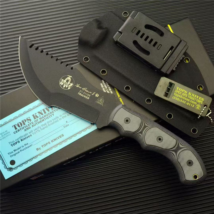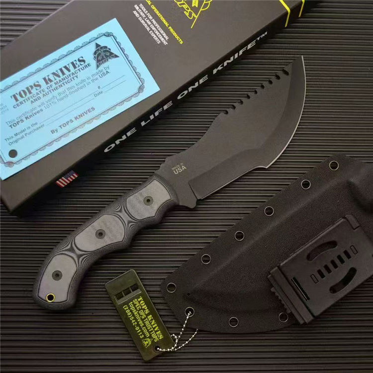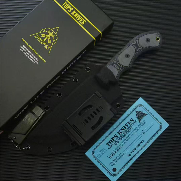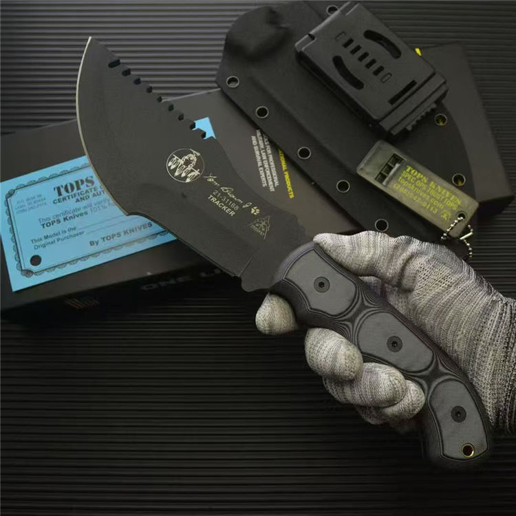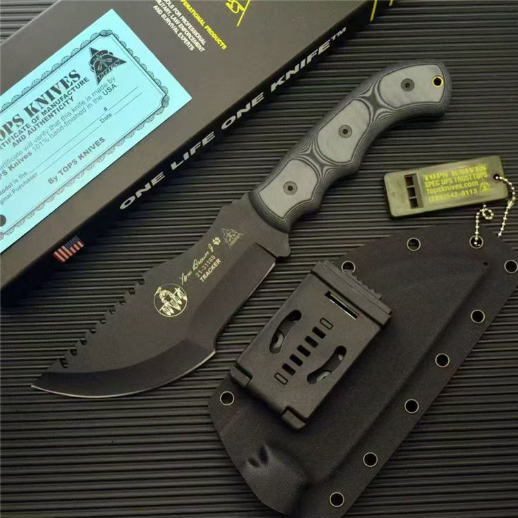 托普斯TOPS追踪者直刀 全长:30.5cm 刃长:15cm 刃宽:6.0cm(最宽处) 刃厚:6mm 刃材:高碳钢 柄长:14cm 柄材:双色G10 硬度:58HRC 重量:661g 包装:塑封包装,附送一个求生口哨