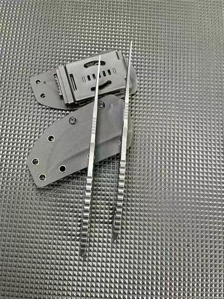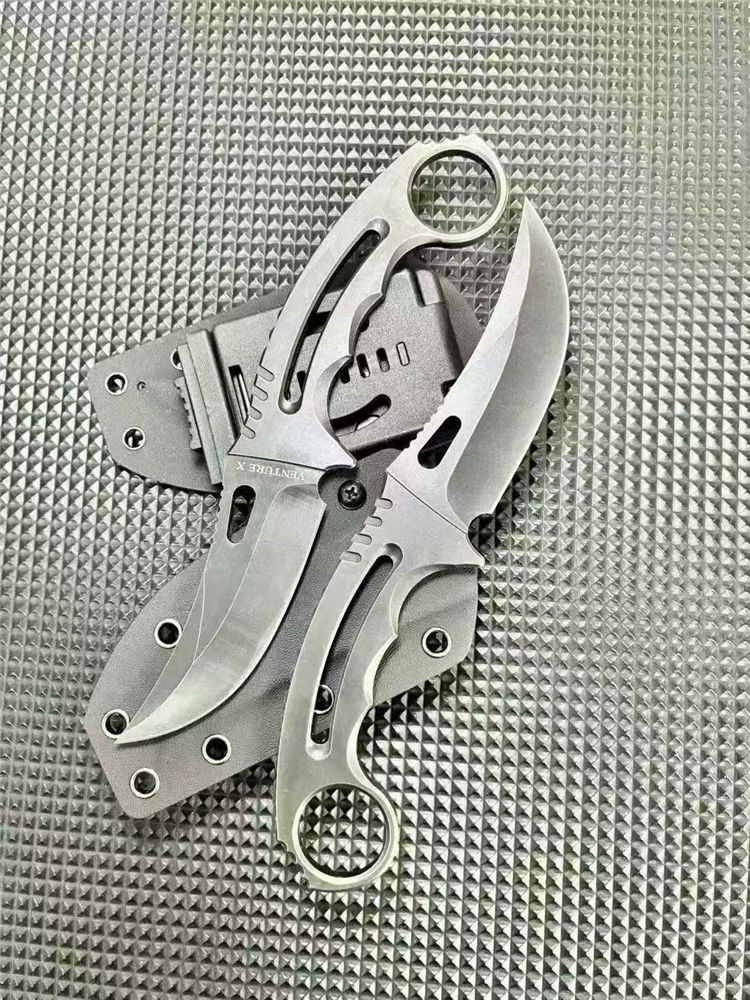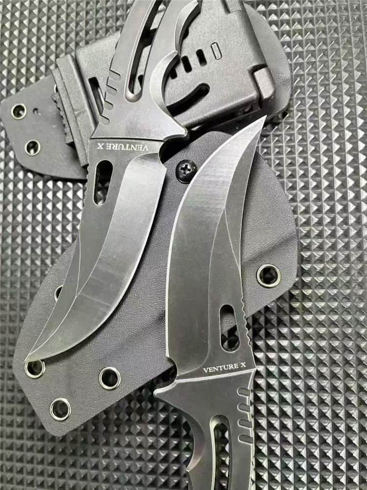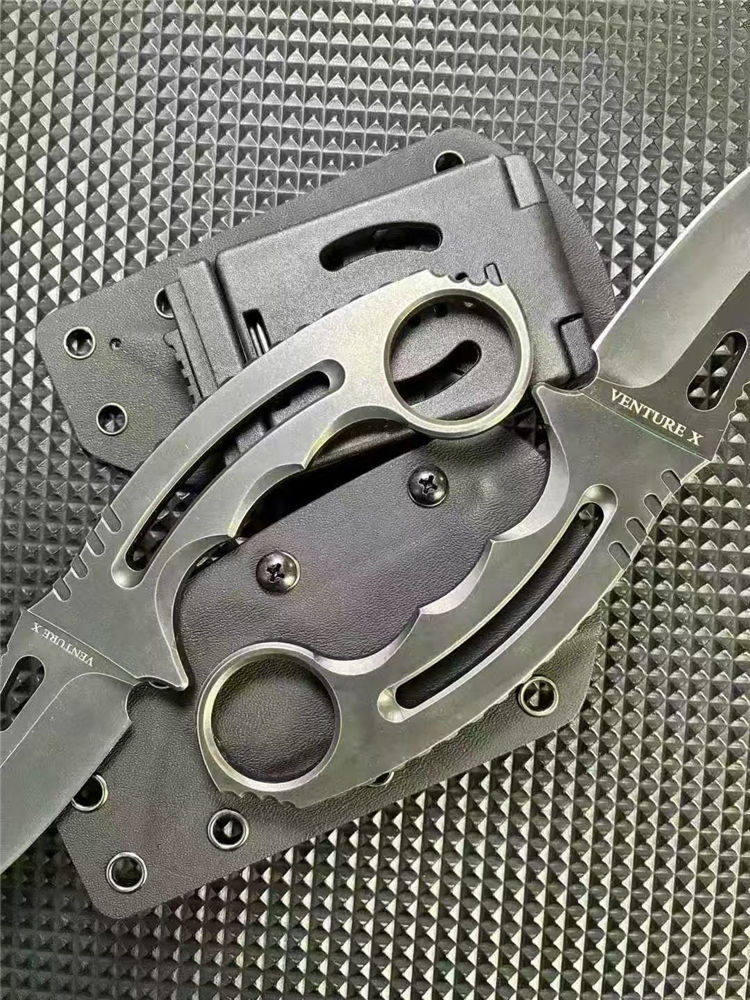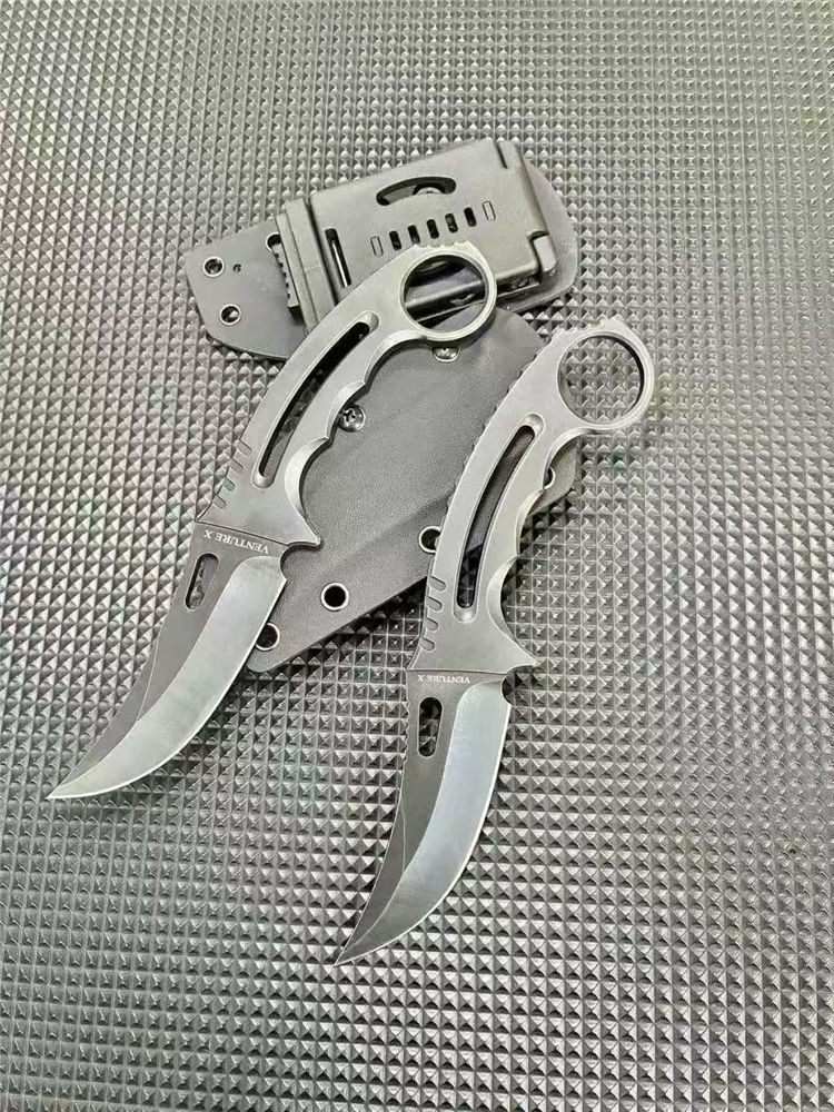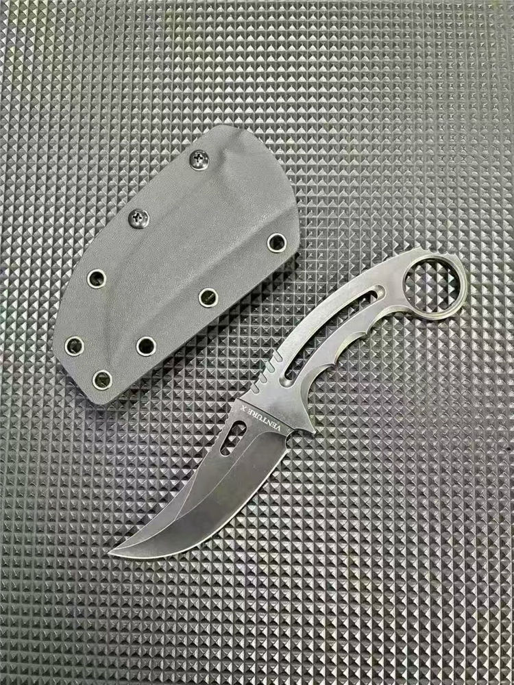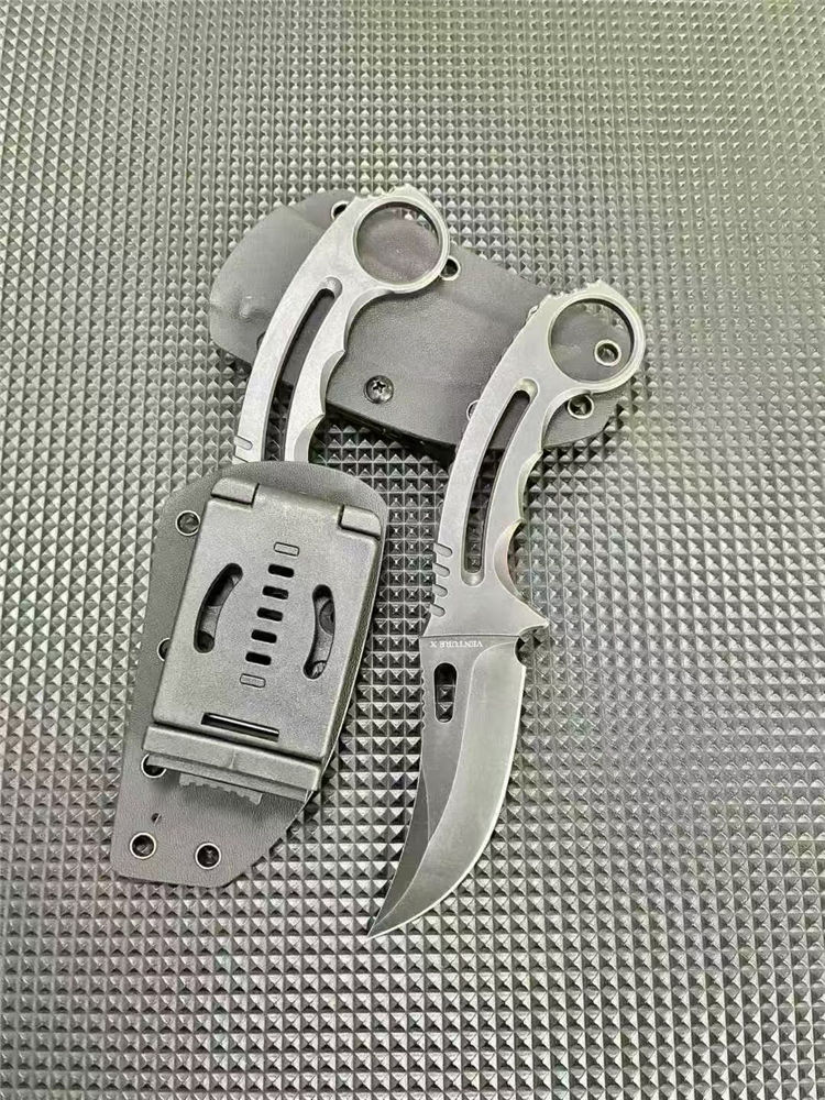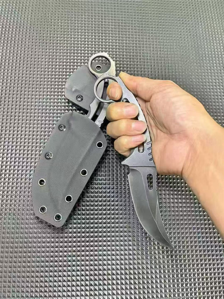 一体异型爪刀 总长:21cm 刃长:9.5cm 刃宽:3cm 刃厚:3.8mm 柄厚:5.8mm 刃材:D2 表面:发黑+黑洗 柄长:11.5CM 重量:131G含包装刀鞘总重量:204G 一体钢CNC精雕成型