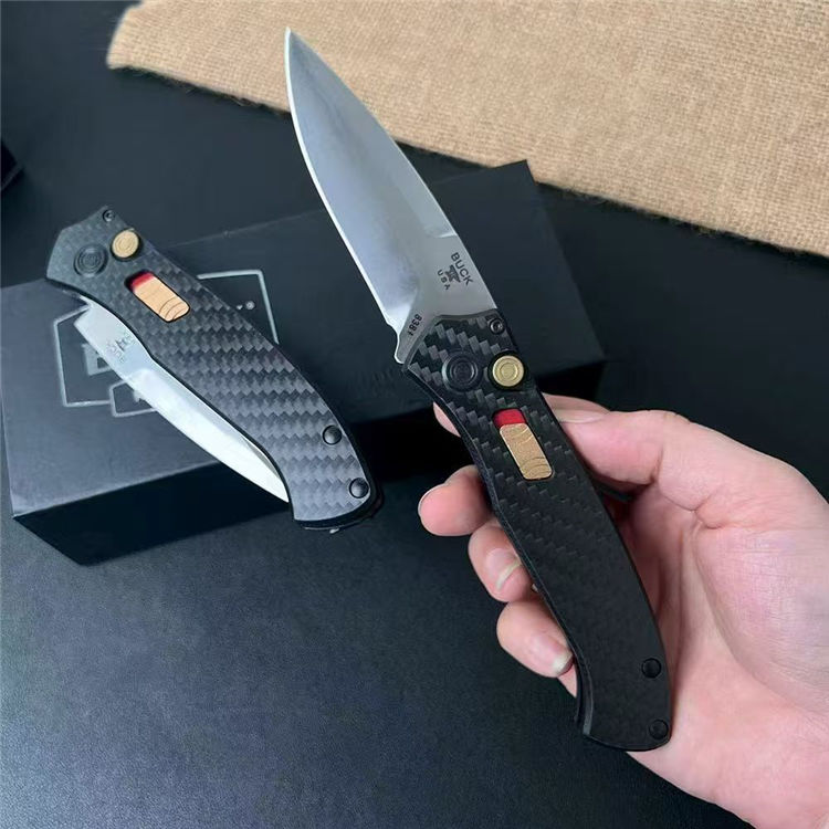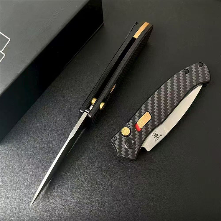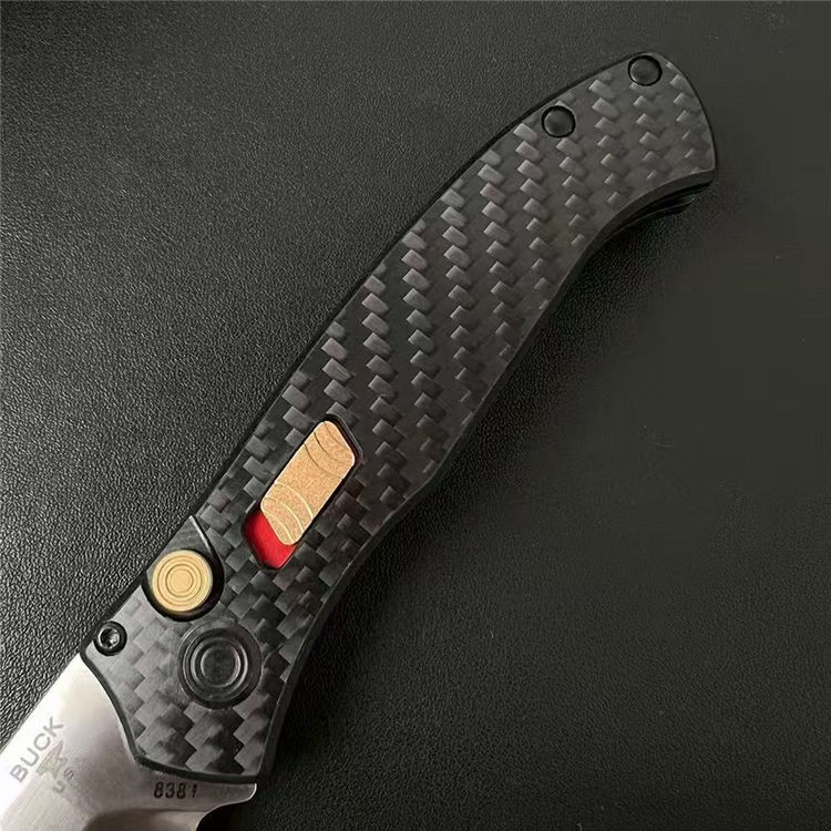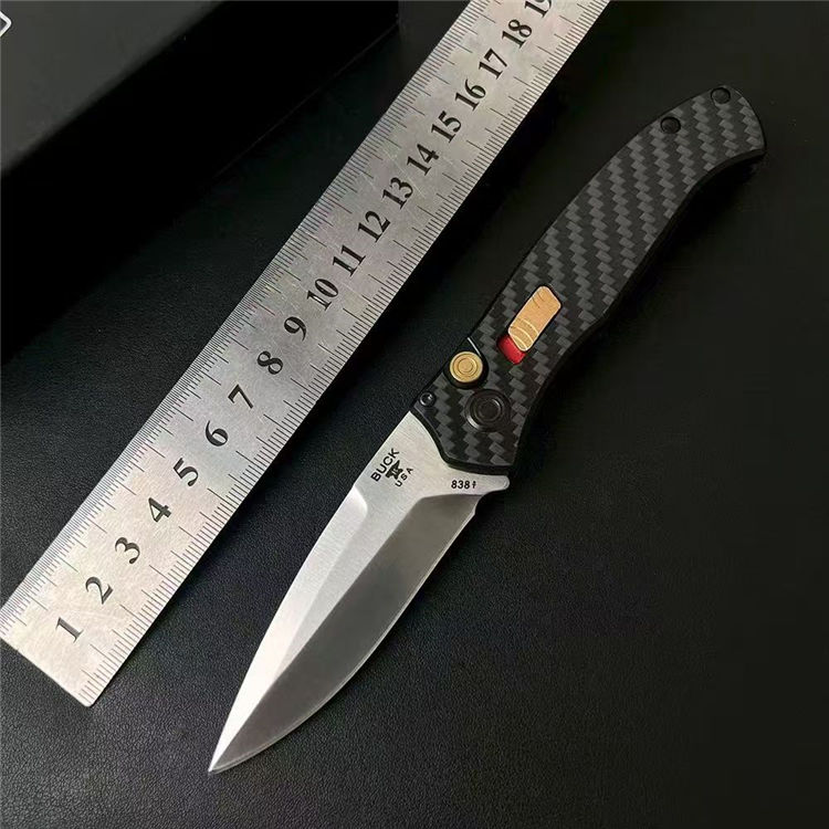 巴克838侧开跳刀 全长:196mm 刃长:80mm 柄长:116mm 刃厚:3mm 宽度:25mm 刃材:S35VN 柄材:碳纤 硬度:60HRC 净重量:125.5克 重量:206g( 含包装)