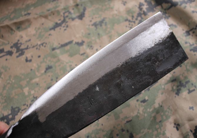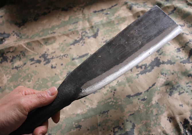 丰利柴刀 全 长:34.5cm 刃 长:22.5cm 柄 长:12cm 刃 宽:7cm 刃 厚:6mm 刃 材:锻打汽车弹簧钢 重 量:570克 硬 度:56-57HRC 表 面:锻打 柄 材:全钢