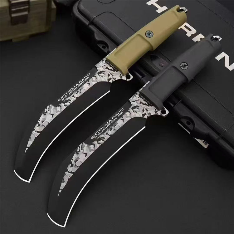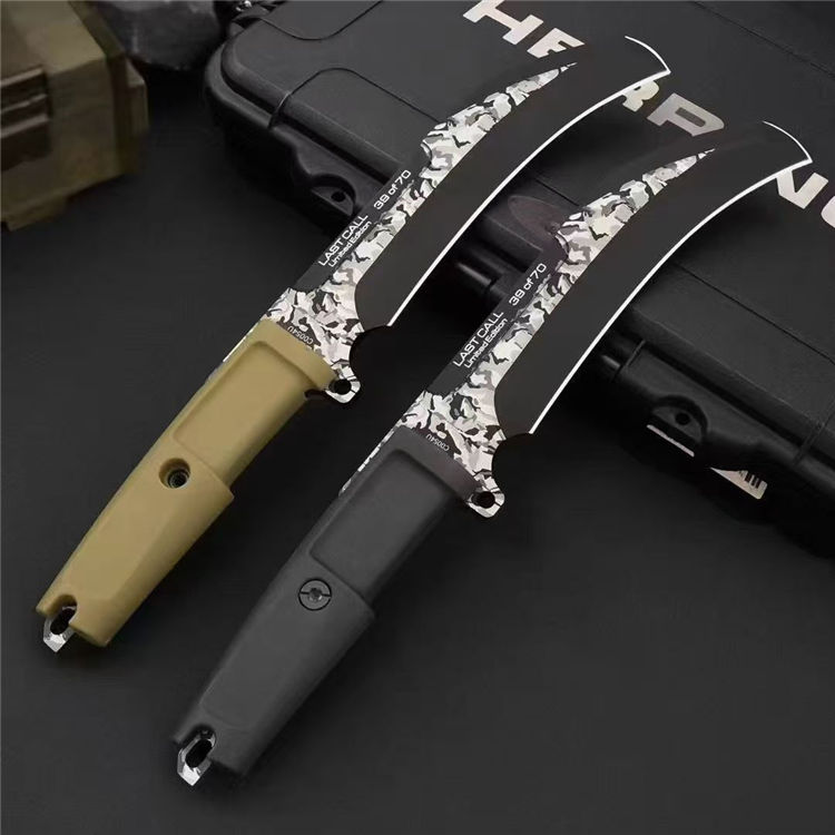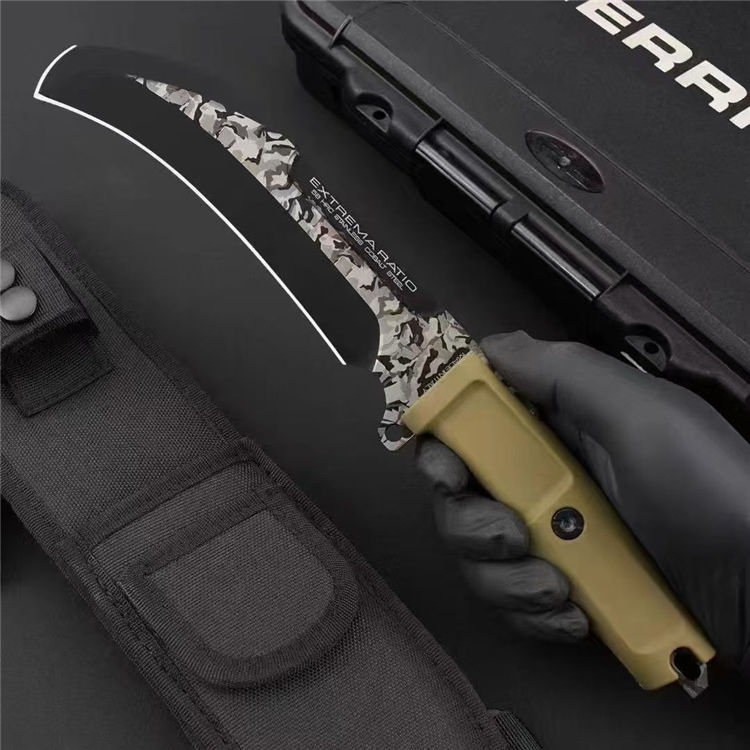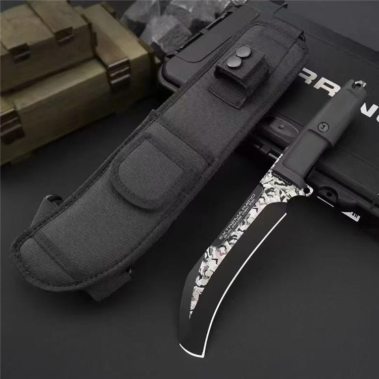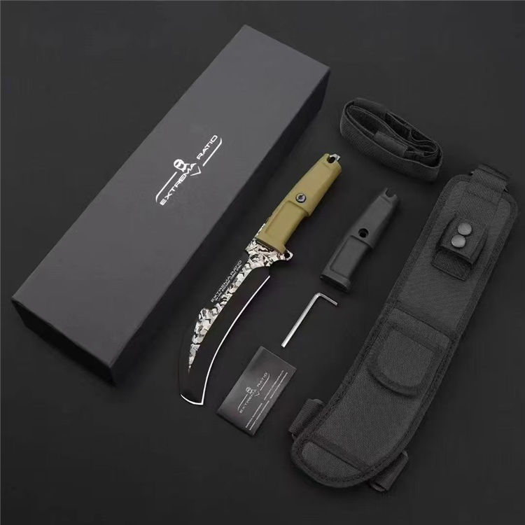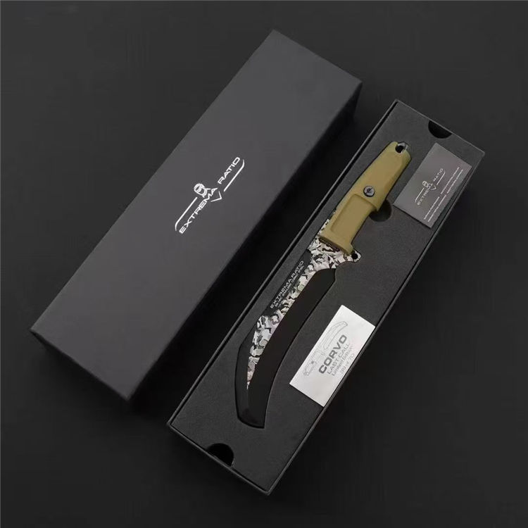 极端武力科尔沃直刀 全长:307mm 刃长:176mm 刃材:N690 硬度:58HRC 表面:mil-c-13924打磨刀片黑色涂层+3D无痕激光迷彩涂层 刃厚:6.3mm 柄材:FORPRENE 重量:62g 刀鞘:MOLLE系统高级尼龙织带 附件:附带一副卡其色手柄+六角螺丝