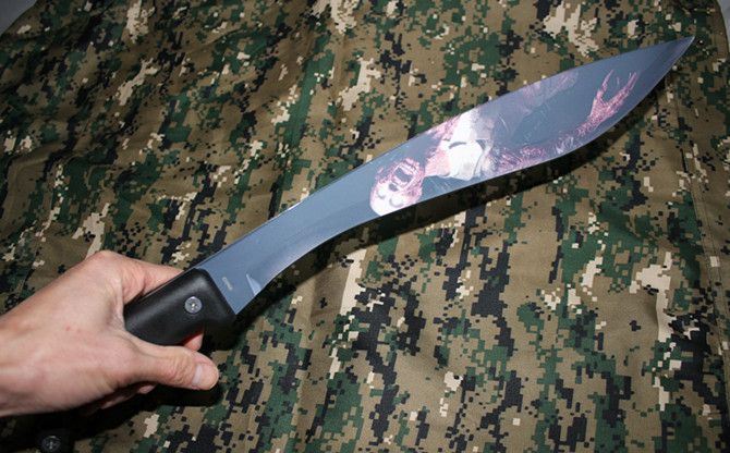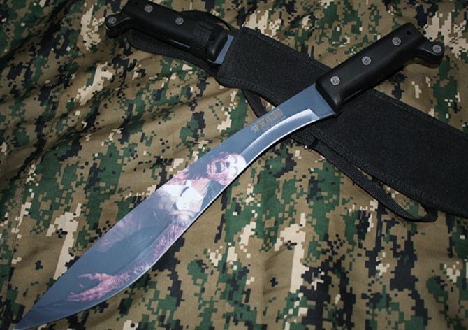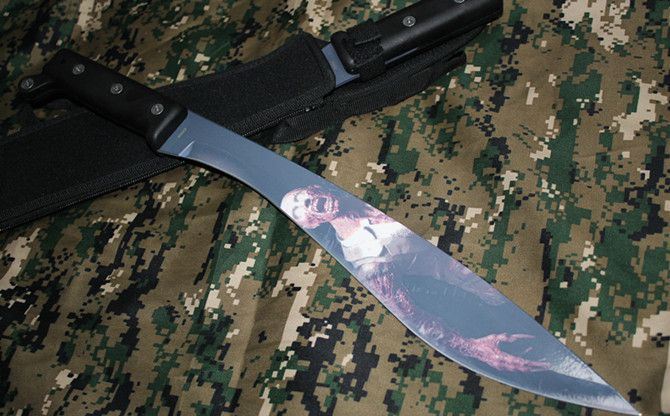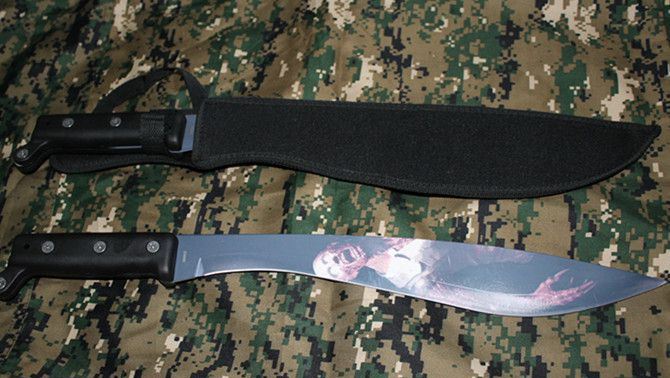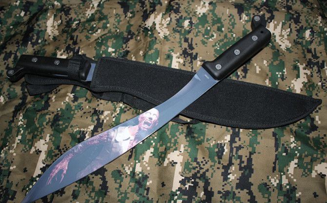 全长: 48cm 刃长: 34.5cm 柄长:13.5cm 刃宽:5cm(最宽处) 刃厚: 0.33cm 刃材: 440 硬度: 56 刃面: 喷涂丧尸图案 柄材: ABS工程塑料手柄;刀身贯穿刀柄,一体龙骨结构! 重量: 453克(含尼龙鞘)