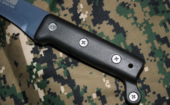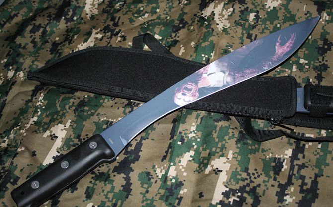 丧尸.狗腿砍刀 全长: 48cm 刃长: 34.5cm 柄长:13.5cm 刃宽:5cm(最宽处) 刃厚: 0.33cm 刃材: 440 硬度: 56 刃面: 喷涂丧尸图案 柄材: ABS工程塑料手柄;刀身贯穿刀柄,一体龙骨结构! 重量: 453克(含尼龙鞘)