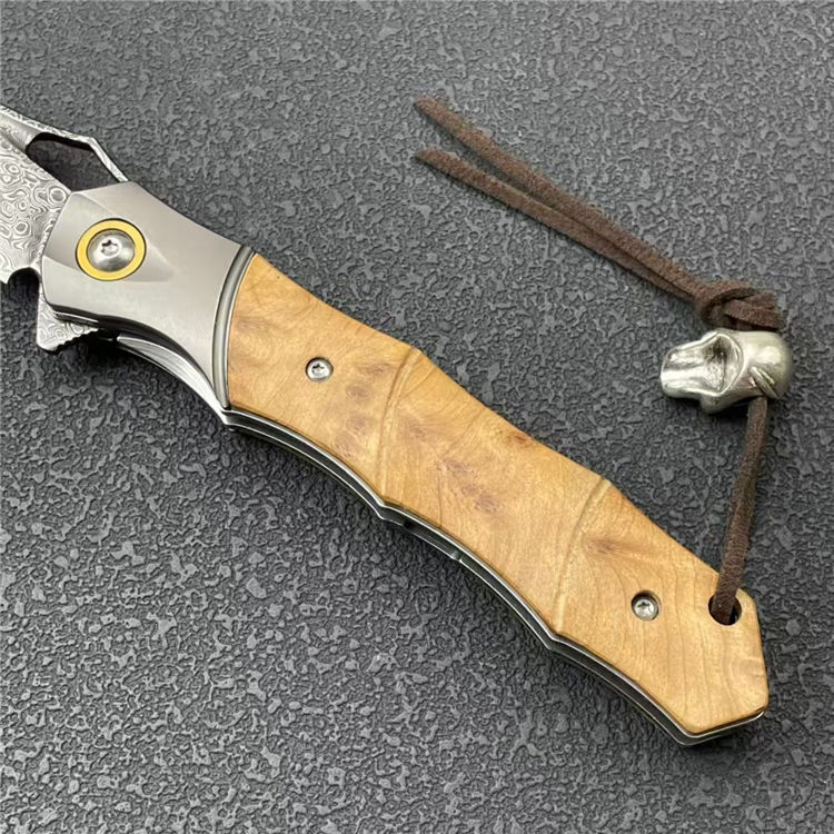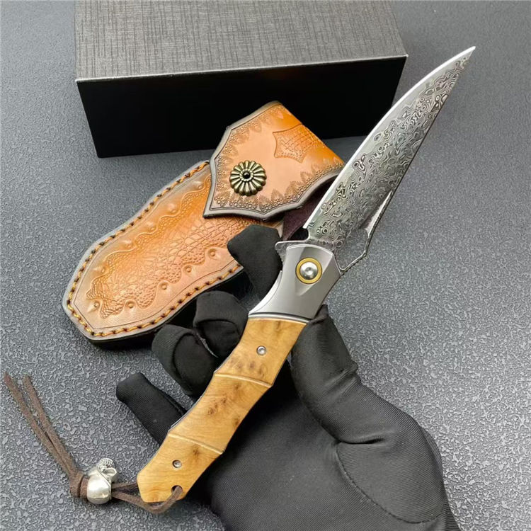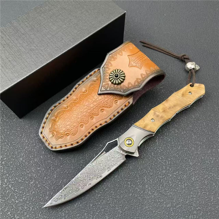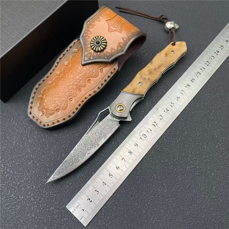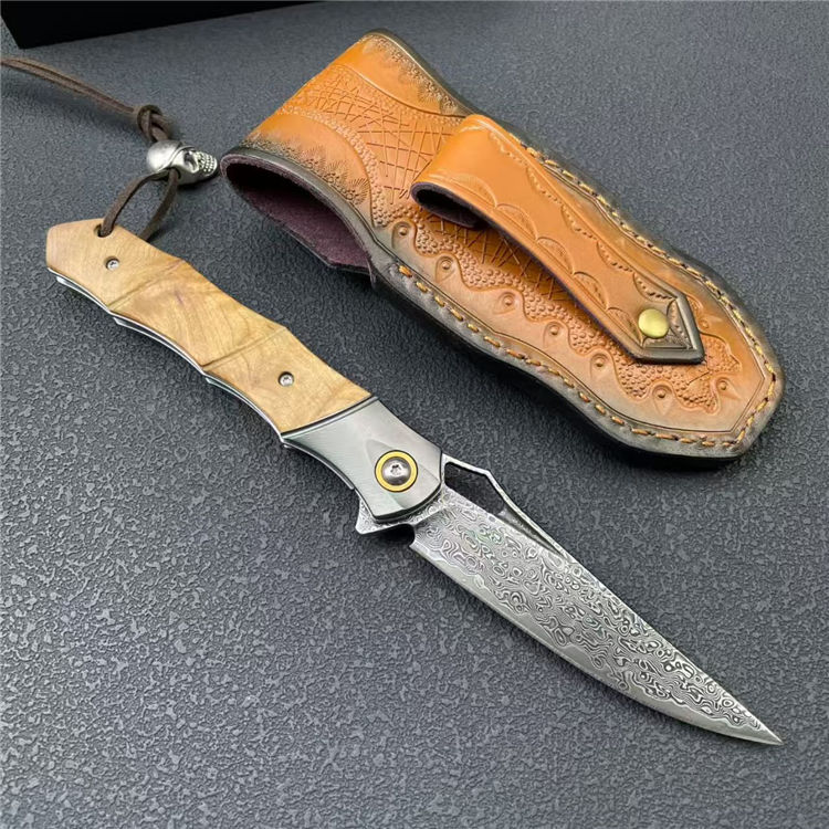 大马士革影武者折刀 全长:21.3cm 刃长:9cm 柄长:12cm 刃宽:2.5cm 刃厚:2.5mm 刃材:大马士革钢 柄材:钢+影木 刀重:118G/163G(含皮套) 毛量:245G 硬度:58-60HRC 包装:皮套+礼盒
