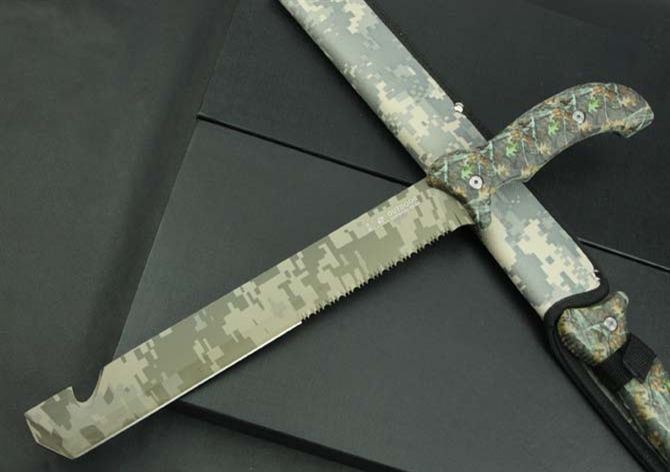汉道—丛林狩猎者 全 长:460mm 刃 长:300mm 柄 长:160mm 刃 宽:50mm 刃 厚:3.6mm 刃 材:5Cr13Mov 重 量:500g(含包装) 硬 度:57HRC 表 面:迷彩 柄 材:ABS迷彩 锁 型:定锁 其 他:配尼龙套
