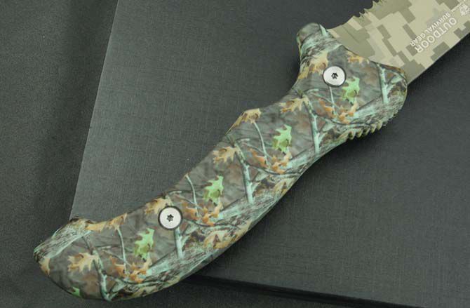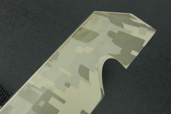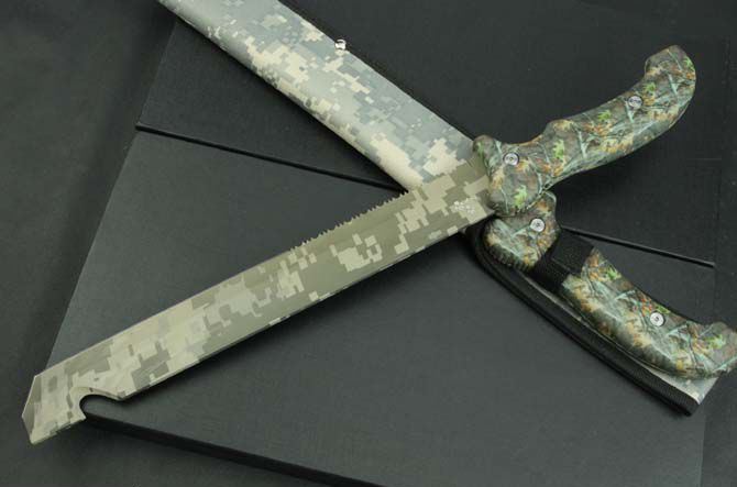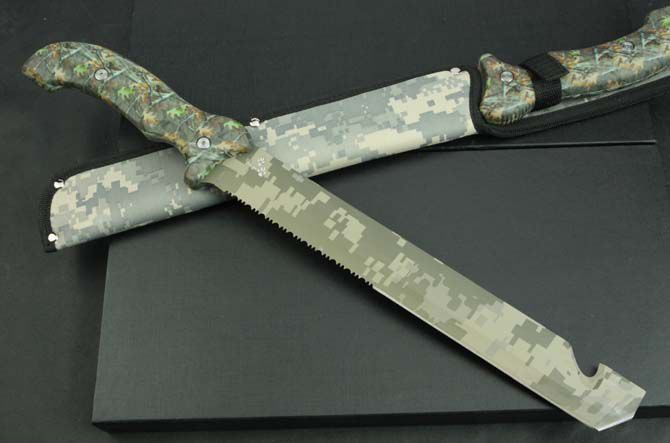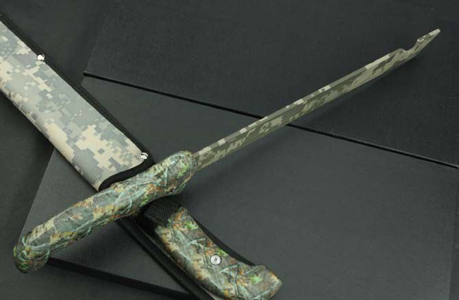 全 长:460mm 刃 长:300mm 柄 长:160mm 刃 宽:50mm 刃 厚:3.6mm 刃 材:5Cr13Mov 重 量:500g(含包装) 硬 度:57HRC 表 面:迷彩 柄 材:ABS迷彩 锁 型:定锁 其 他:配尼龙套