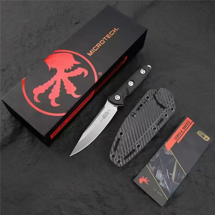 美国微技术阿尔法精英直刀 全长:20.75cm 刃长:9.5cm 手柄:黑色G10 厚度:0.4cm 钢材:m390钢 硬度:61HRC 表面:石洗 刃厚:0.42cm 重量:约226克 附件:碳纤维饰面Kydex鞘