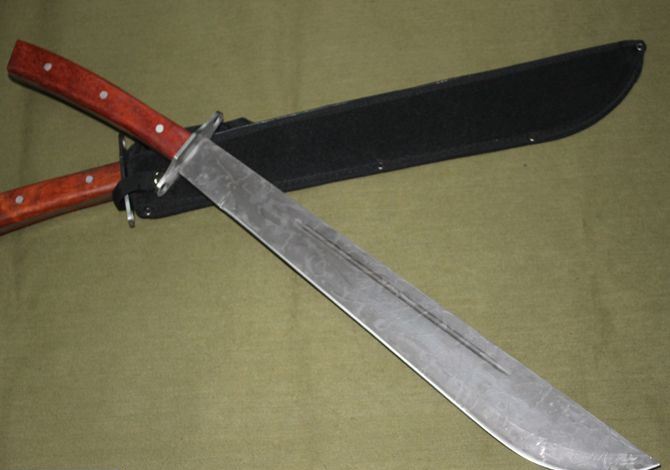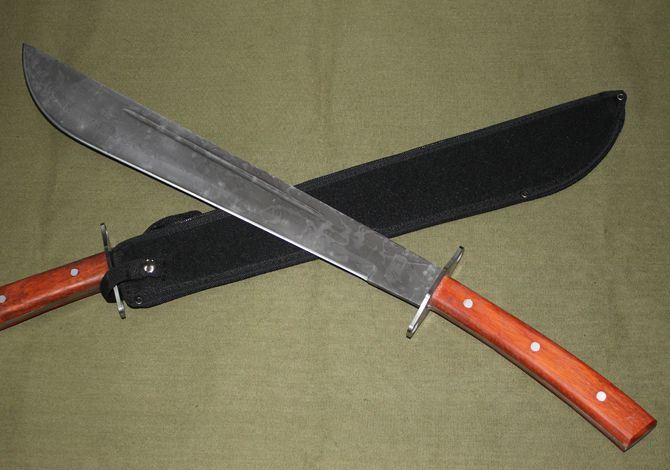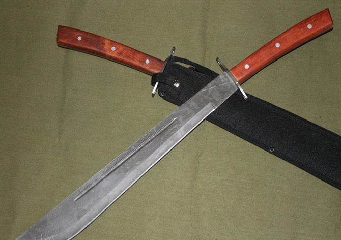 全长:66厘米 柄长:20厘米 刃长:46厘米 刃宽(最宽处):6厘米 刃厚:0.45厘米 柄长:20厘米 柄材:彩木柄 重量:1000克 钢材:3CR13 表面处理:腐蚀纹