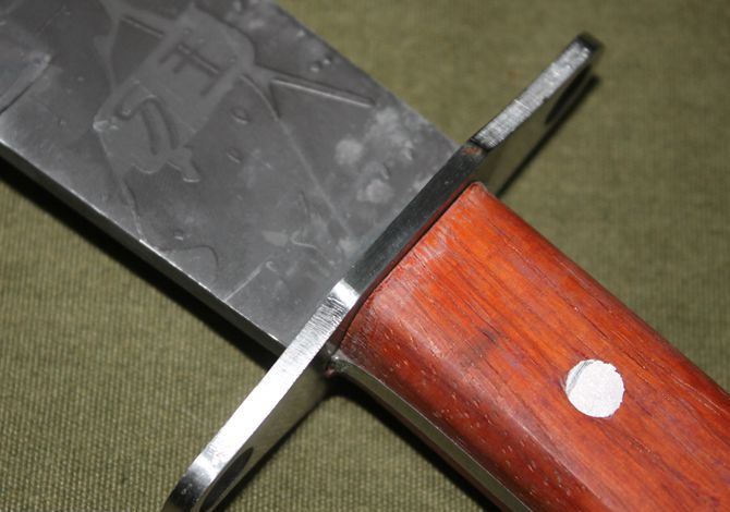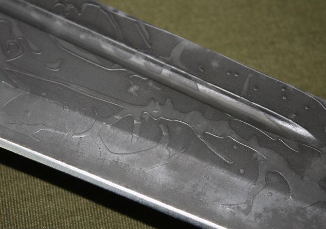 腐蚀版刀王尖头 全长:66厘米 柄长:20厘米 刃长:46厘米 刃宽(最宽处):6厘米 刃厚:0.45厘米 柄长:20厘米 柄材:彩木柄 重量:1000克 钢材:3CR13 表面处理:腐蚀纹