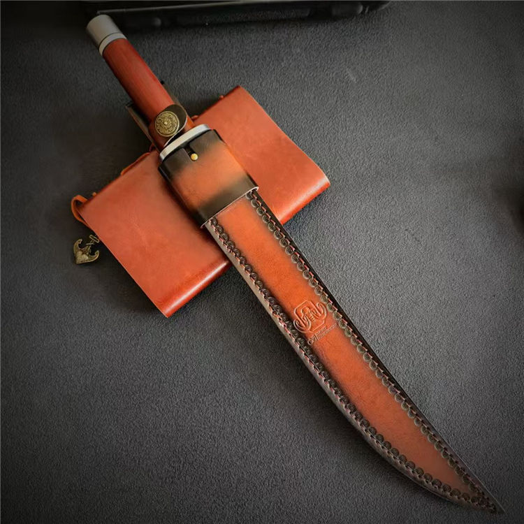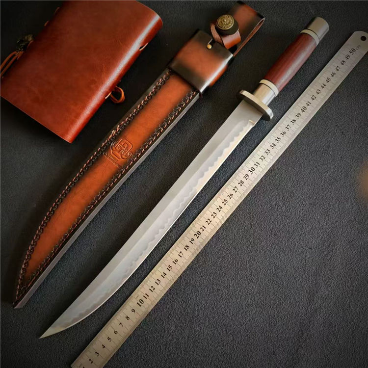 赤猿钢铁武士直刀 全长:49.5cm 刃长:34.4cm(有效刃长) 刃宽:2.9cm 刃厚:6mm 钢材:三合钢 柄长:12.7cm 柄材:红檀 重量:571g(含鞘:717g)