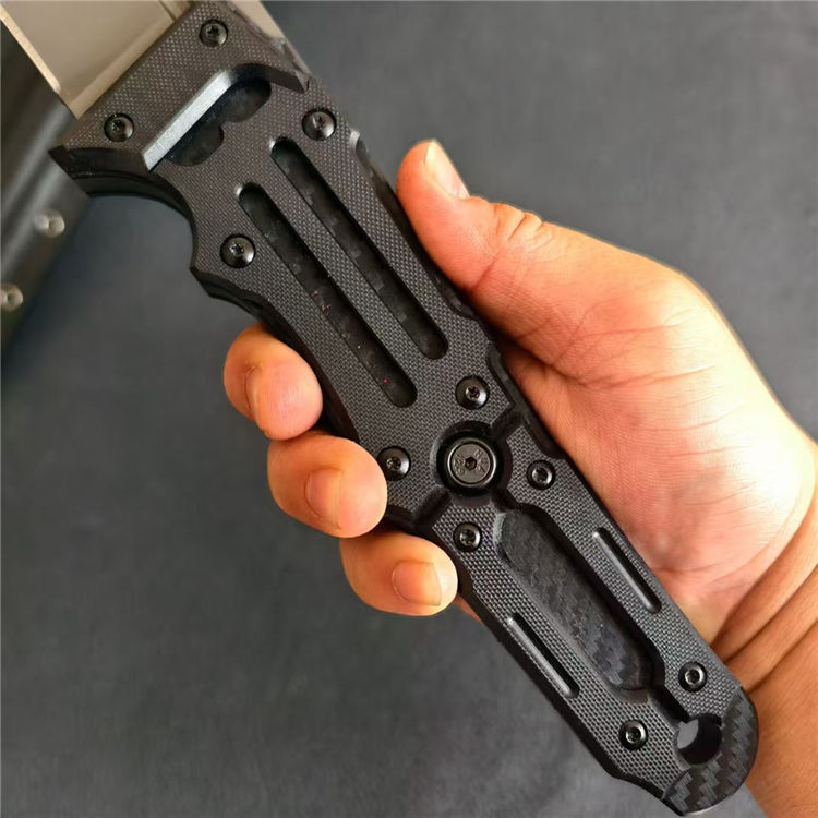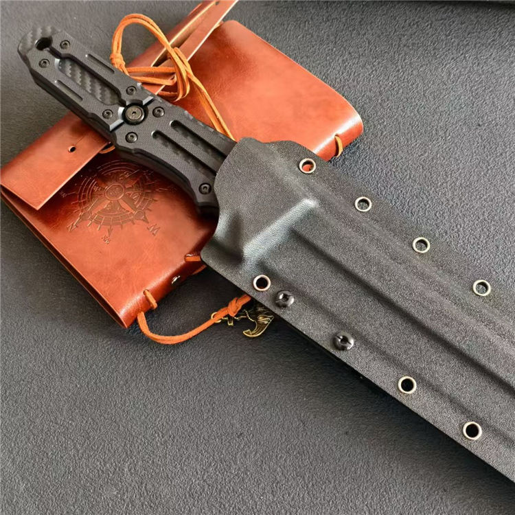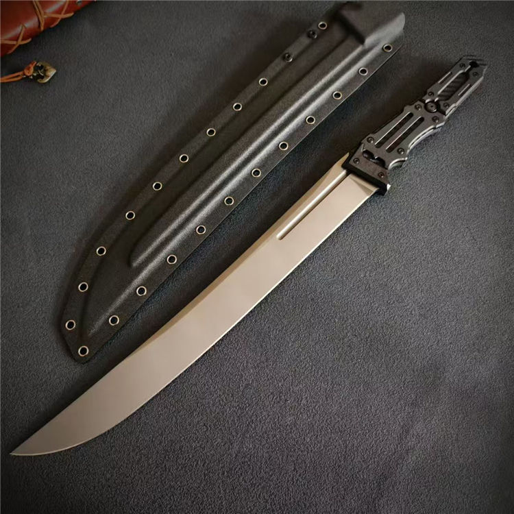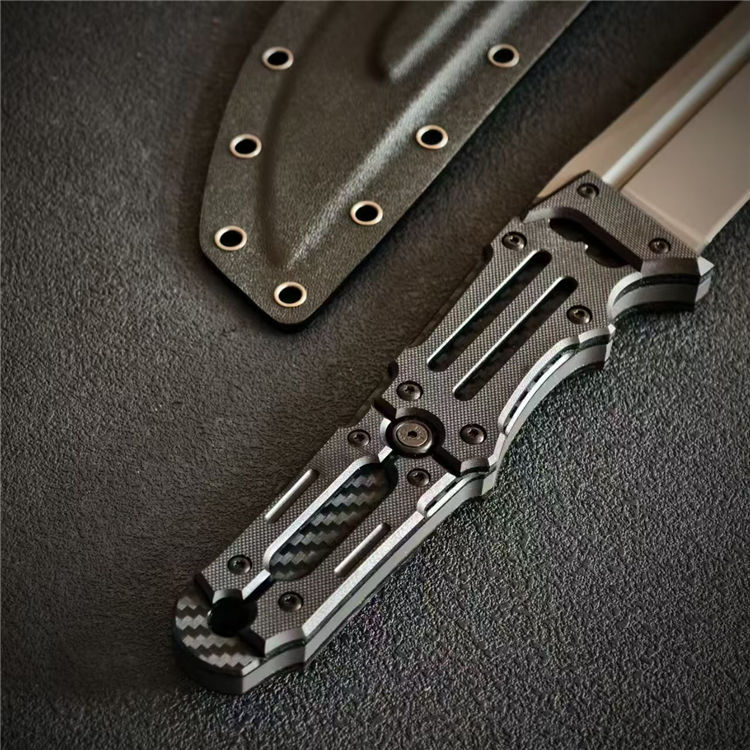 根本朋之雷电之剑二代直刀 全长:58.5cm 刃长:39cm 刃宽:46mm 刃厚:7mm 钢材:CPM-3V 柄材:碳纤维+G10手柄 硬度:61HCR 重量:930g(含鞘1176g) 超高性能,灰色镀钛涂层,一体龙骨,手工镜面刃,战术K鞘