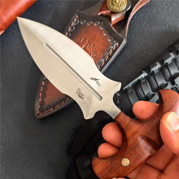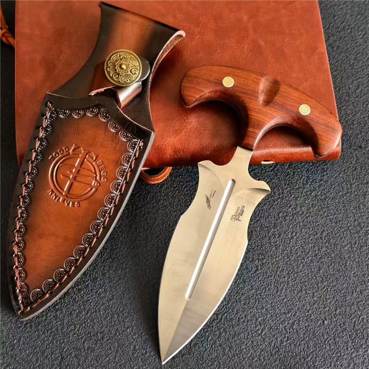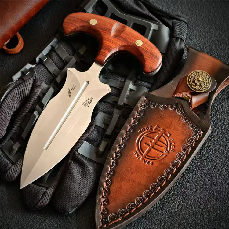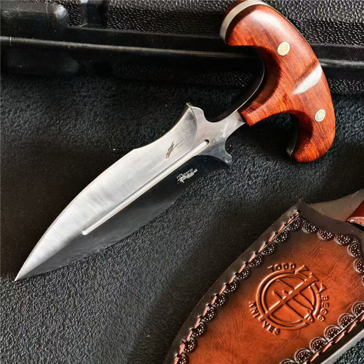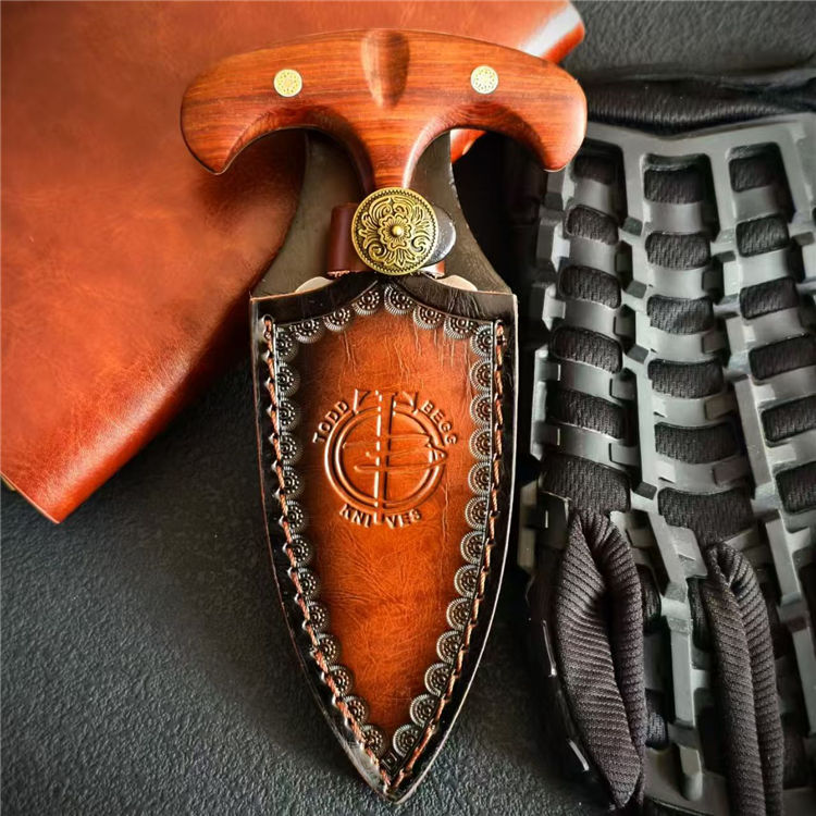托德·贝格牛头手刺 全长:17cm 刃长:8cm 钢厚:5mm 钢材:D2 柄材:红檀 重量:184g(含皮套230g)