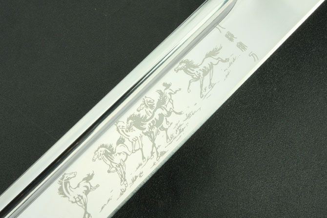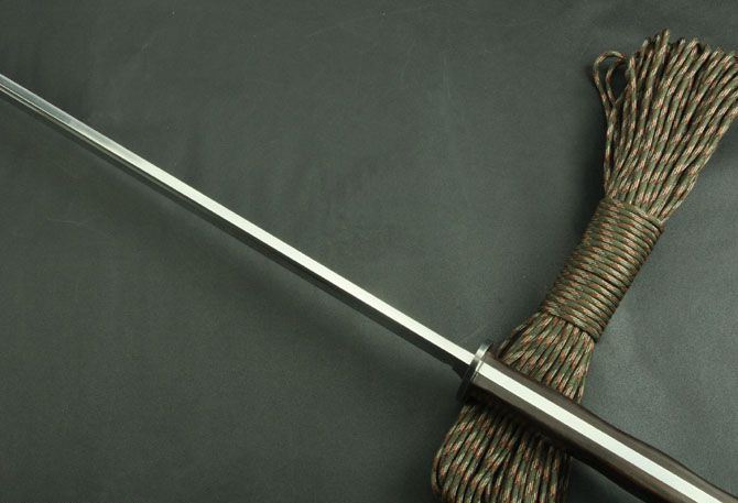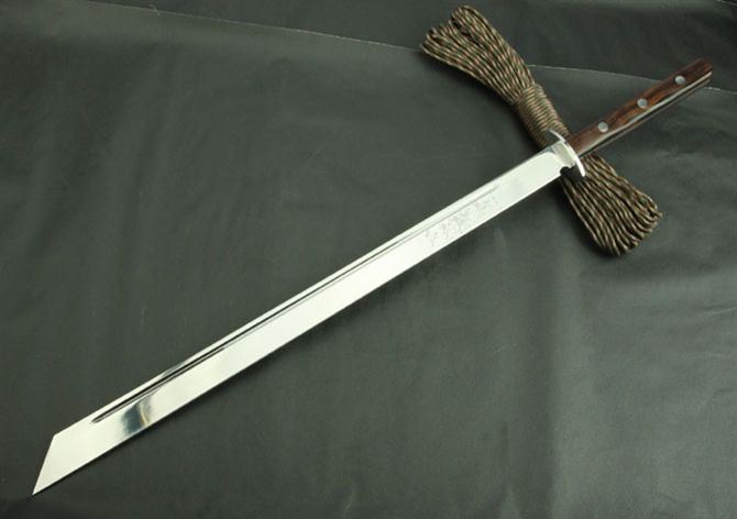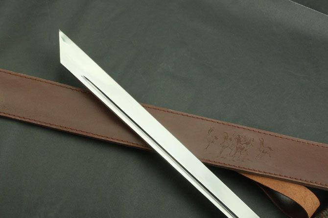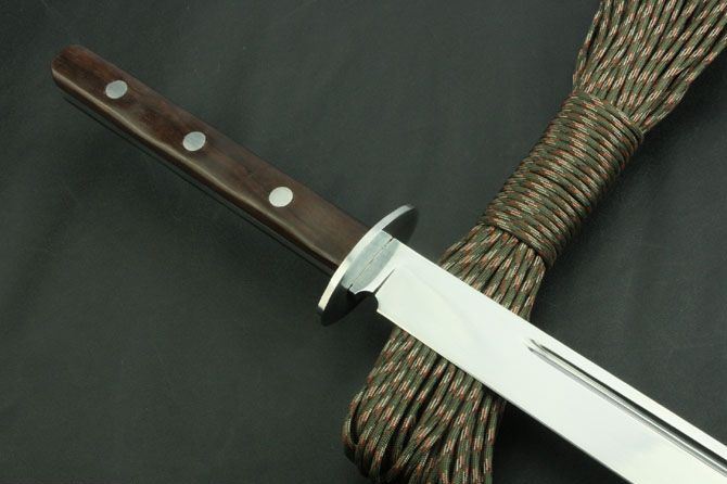 八马骏刀 全 长:836mm 刃 长:615mm 柄 长:200mm 刃 宽:38mm 刃 厚:6.2mm 刃 材:5Cr13Mov 重 量:1420g(含包装) 硬 度:56HRC 表 面:砂光 柄 材:黑檀木 锁 型:定锁 其 他:配牛皮套