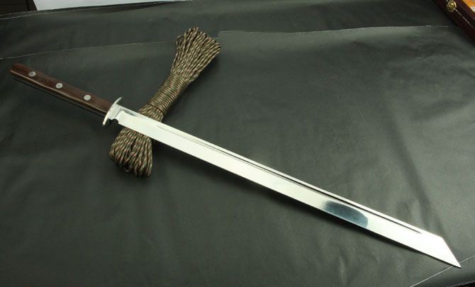 全 长:836mm 刃 长:615mm 柄 长:200mm 刃 宽:38mm 刃 厚:6.2mm 刃 材:5Cr13Mov 重 量:1420g(含包装) 硬 度:56HRC 表 面:砂光 柄 材:黑檀木 锁 型:定锁 其 他:配牛皮套