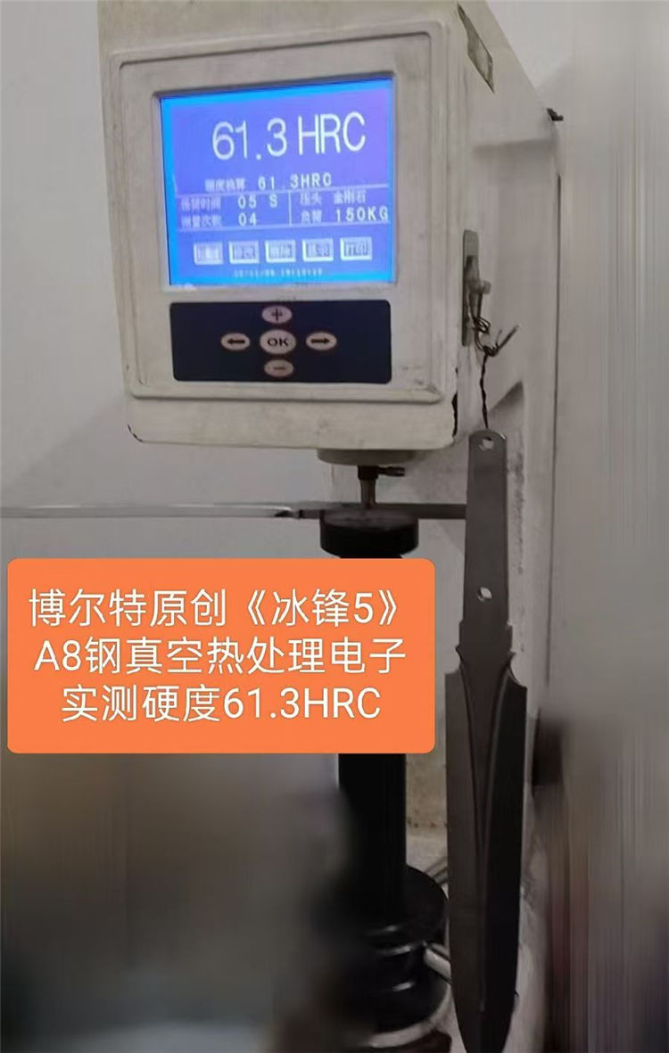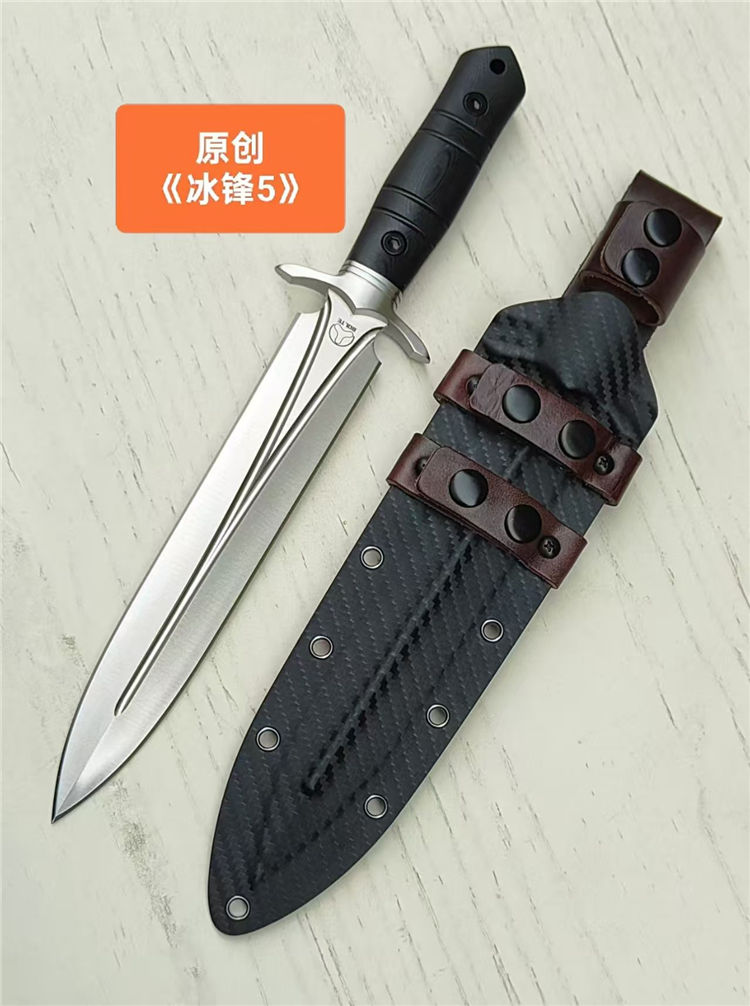 博尔特冰锋5直刀 全长:352mm 刃长:222mm 柄长:130mm 刃最宽:38mm 刃厚:5.8+-0.05mm 刃面:钢本砂光 类型:具有硬度高、锋利度、韧性保持度高的优势 开刃方式:二次开刃 刃材:A8合金模具钢《护手2cr13白锈钢》 热处理:真空淬油热处理和2次回火处理使钢材韧性保持性更佳 硬度:61+-0.5HRC 柄材:黑色G10+强螺丝,一体包柄、握感舒服《可拆装》 包装:精美黑礼盒+护刀油+伞绳 净重:410+-10克 刀鞘:2.0碳纤维纹K鞘+头层牛皮皮扣带