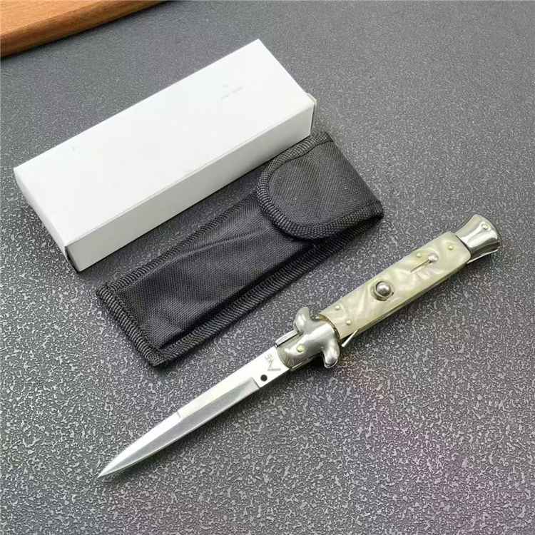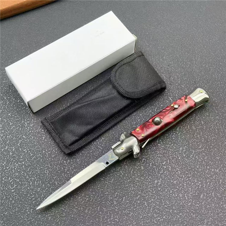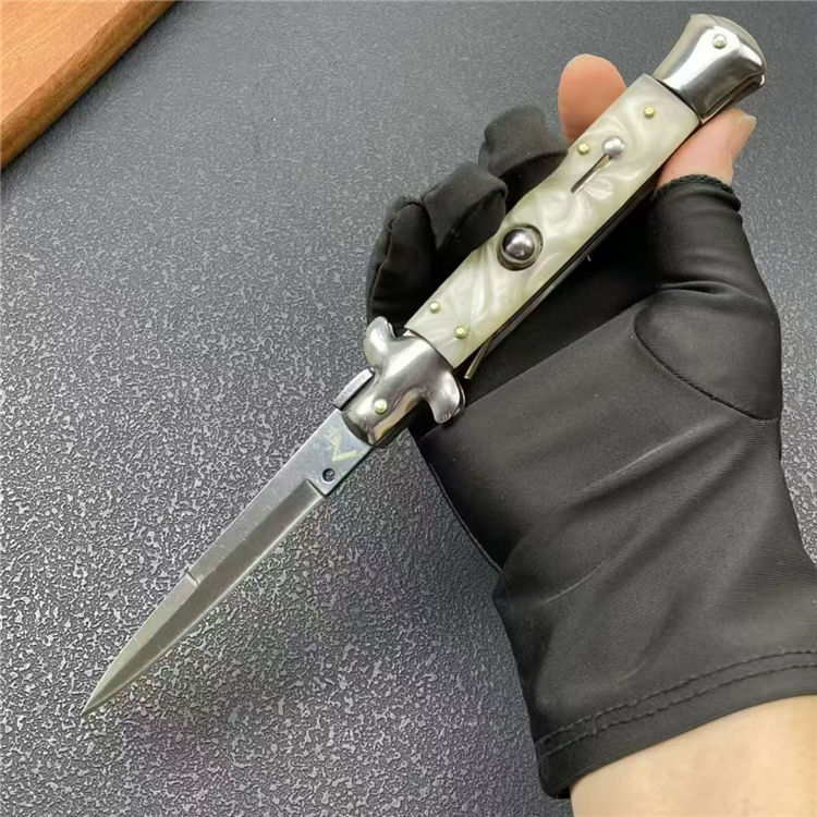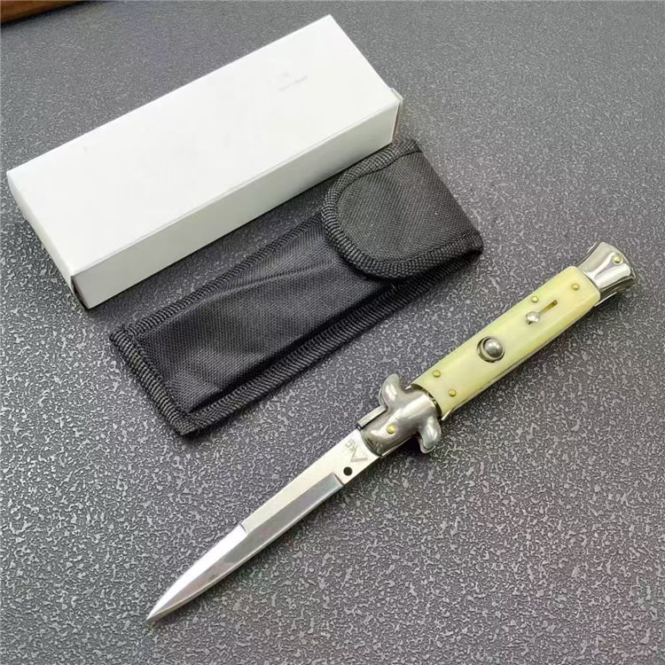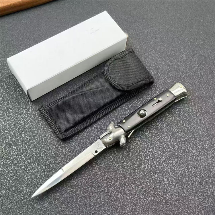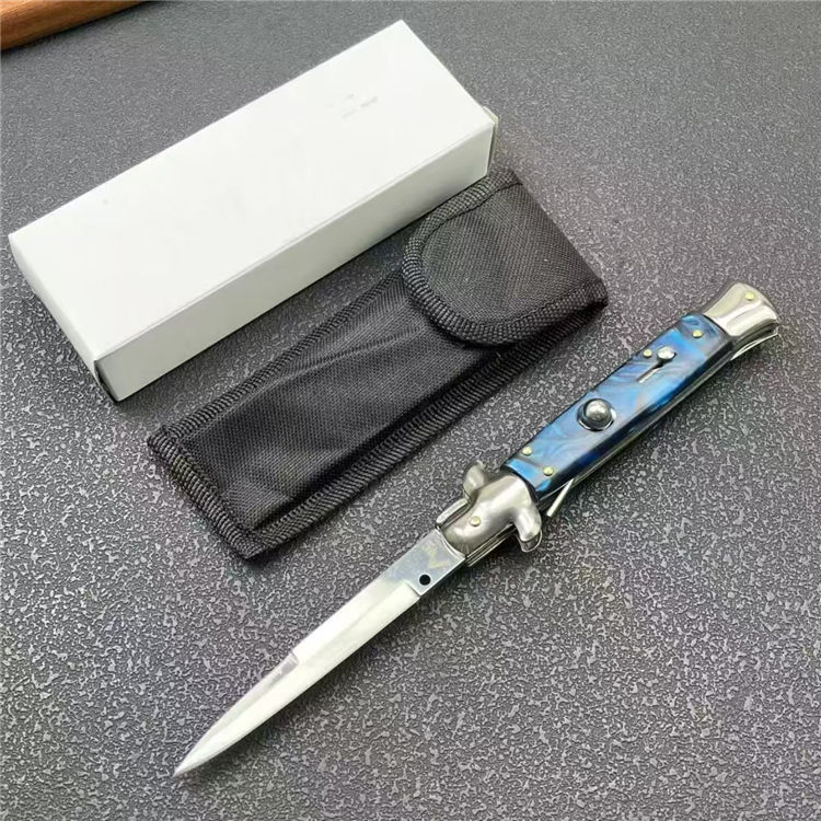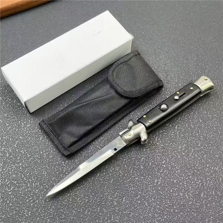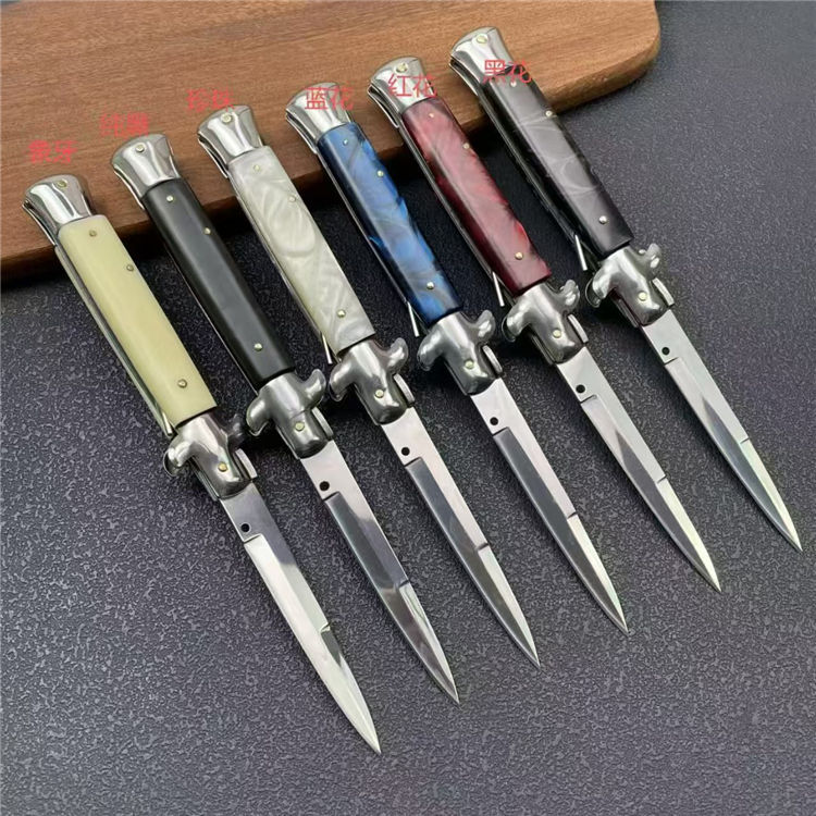 意大利黑手党9寸AKC侧开跳刀 全长:22.5cm 刃宽:1.8cm 刃长:8cm 柄长:10cm 刃厚:3mm 刃材:8CR14MOV 柄材:钢片+树脂 刀重:122.5G 毛量:145G 硬度:58-60HRC